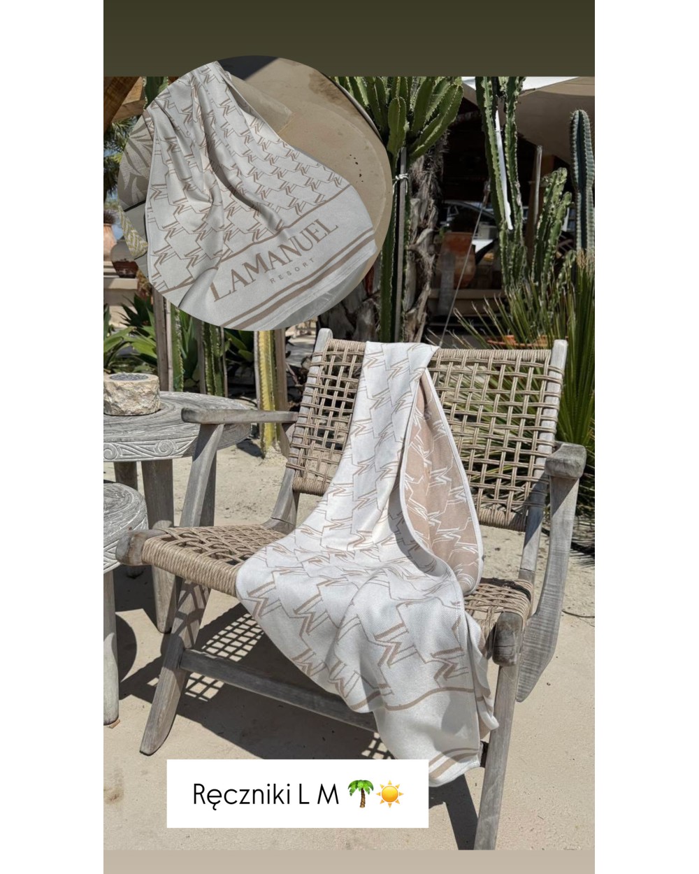 Ręcznik bambusowy to ultra lekki i przyjemny w dotyku dodatek nie tylko na plażę, wykonany z wysokiej jakości tkaniny bambusowej o jedwabistym wykończeniu, który nie tylko świetnie chłonie wodę i szybko schnie, ale też efektownie się prezentuje dzięki subtelnemu beżowo-białemu wzorowi z logo i geometrycznym motywem w stylu resortowym – idealny do stylowych letnich zestawów zarówno na plażę, jak i jako narzutka przy basenie. NAPIS NA RĘCZNIKU BĘDZIE ZMIENIONY NA LAMANUEL THE LABEL!