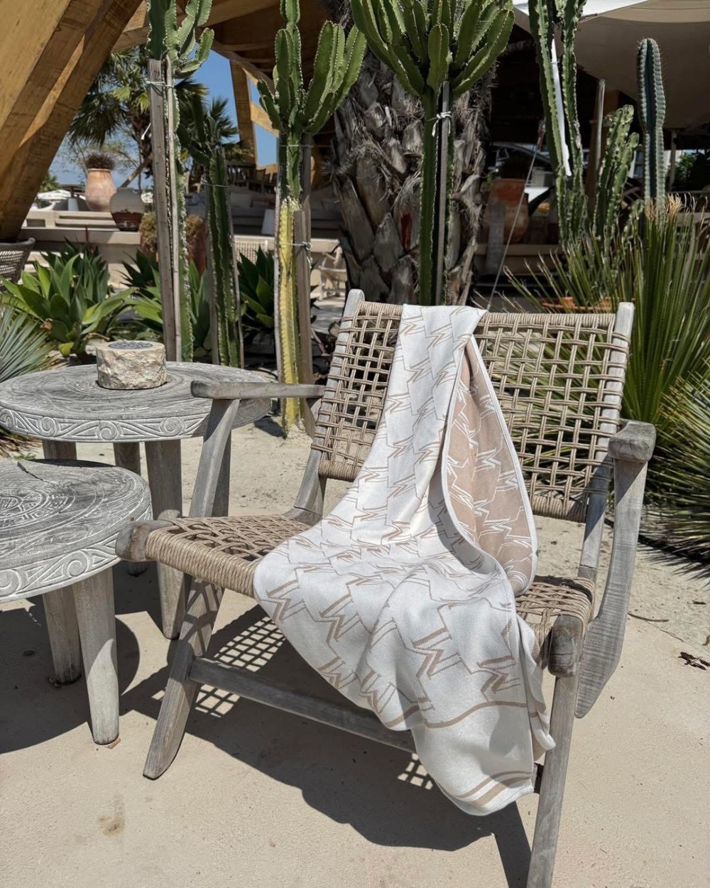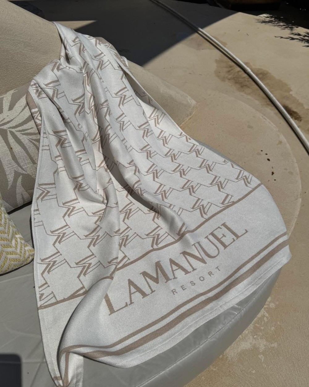 Ręcznik bambusowy to ultra lekki i przyjemny w dotyku dodatek nie tylko na plażę, wykonany z wysokiej jakości tkaniny bambusowej o jedwabistym wykończeniu, który nie tylko świetnie chłonie wodę i szybko schnie, ale też efektownie się prezentuje dzięki subtelnemu beżowo-białemu wzorowi z logo i geometrycznym motywem w stylu resortowym – idealny do stylowych letnich zestawów zarówno na plażę, jak i jako narzutka przy basenie. NAPIS NA RĘCZNIKU BĘDZIE ZMIENIONY NA LAMANUEL THE LABEL!