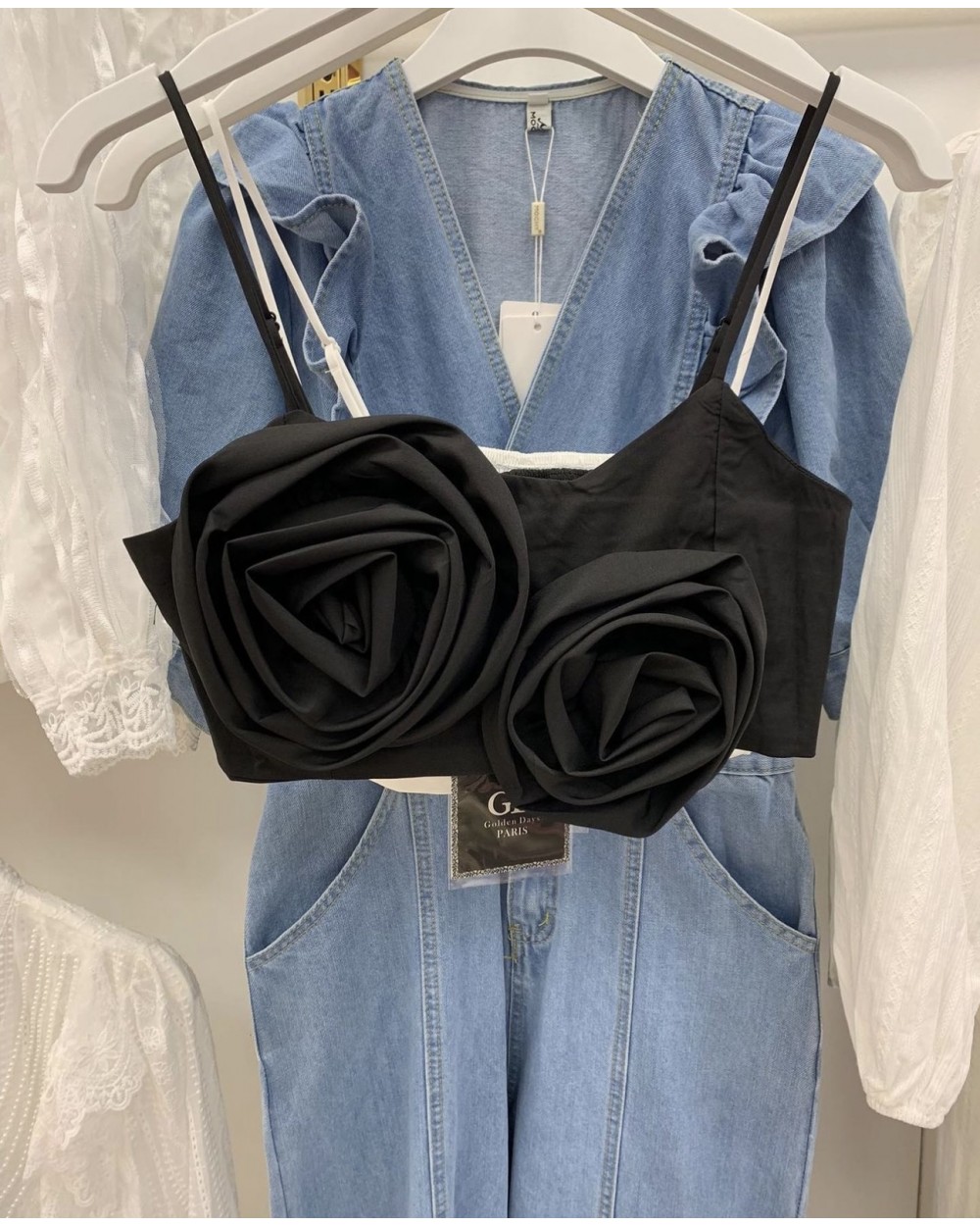 Top na ramiączkach Showy Flower to elegancka i kobieca propozycja, która z pewnością przyciągnie uwagę swoim wyjątkowym motywem materiałowej róży. Top zapewnia idealne dopasowanie dzięki umieszczonemu z tyłu elastycznemu klinowi. Regulowane ramiączka pozwalają na dostosowanie topu do swoich indywidualnych potrzeb. Może być wykorzystany jako baza zarówno do eleganckich stylizacji, jak i bardziej casualowych. Ponieważ świetnie pasuje zarówno do garnituru damskiego, jak i do szortów jeansowych czy rozkloszowanej spódnicy.