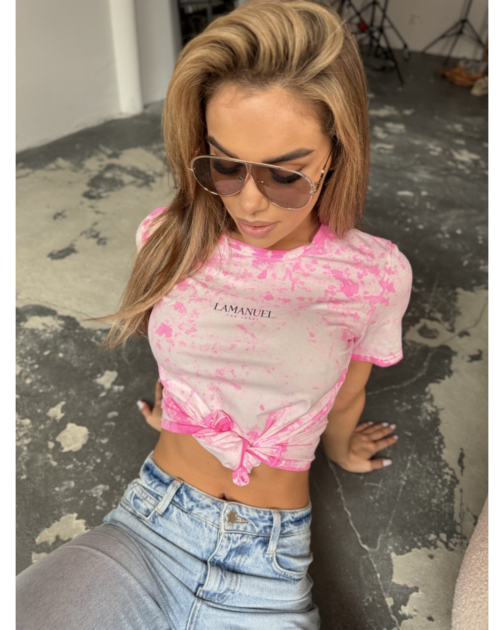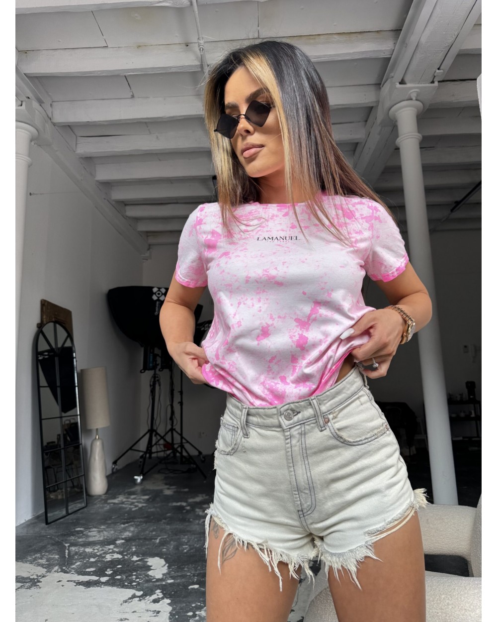 Nasza koszulka damska wykonana metodą sprania handmade z krótkim rękawem to basicowy element garderoby. Wykonana z wysokiej jakości materiałów. Jej krótki rękaw zapewnia swobodę ruchu i wygodę, idealną na letnie dni i aktywności na świeżym powietrzu. Logo marki umieszczone na przodzie koszulki dodaje jej charakteru i podkreśla tożsamość marki, tworząc niepowtarzalny look.