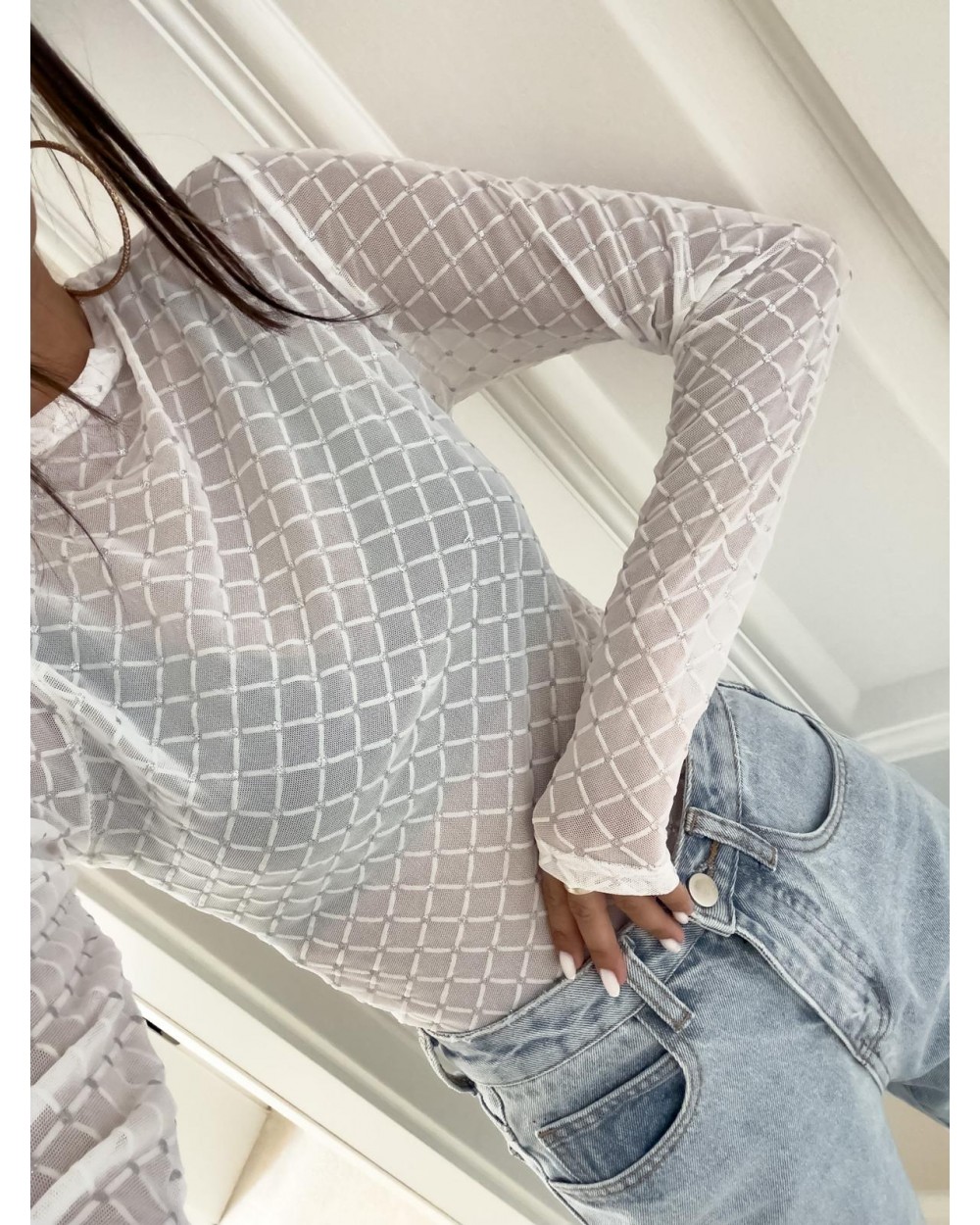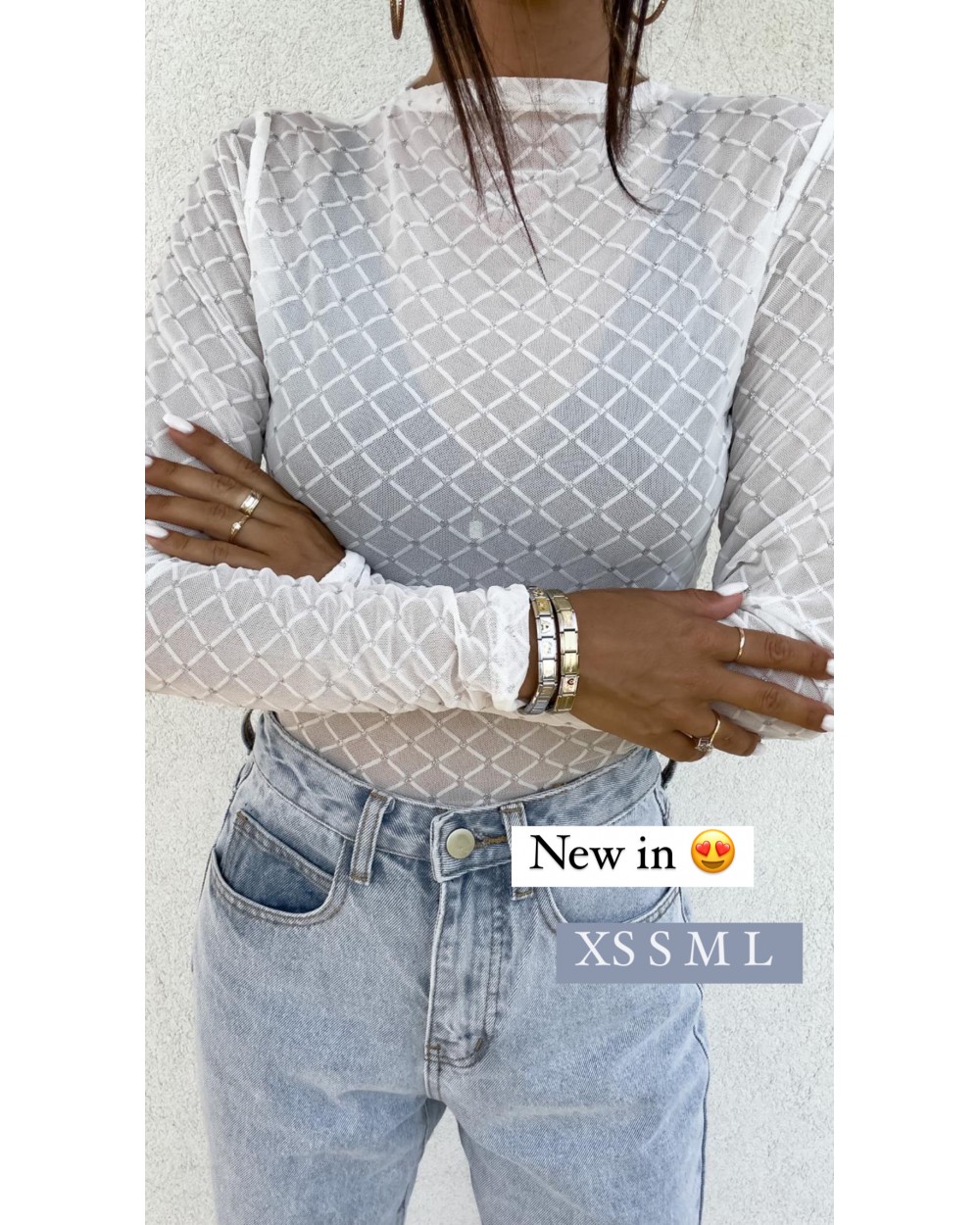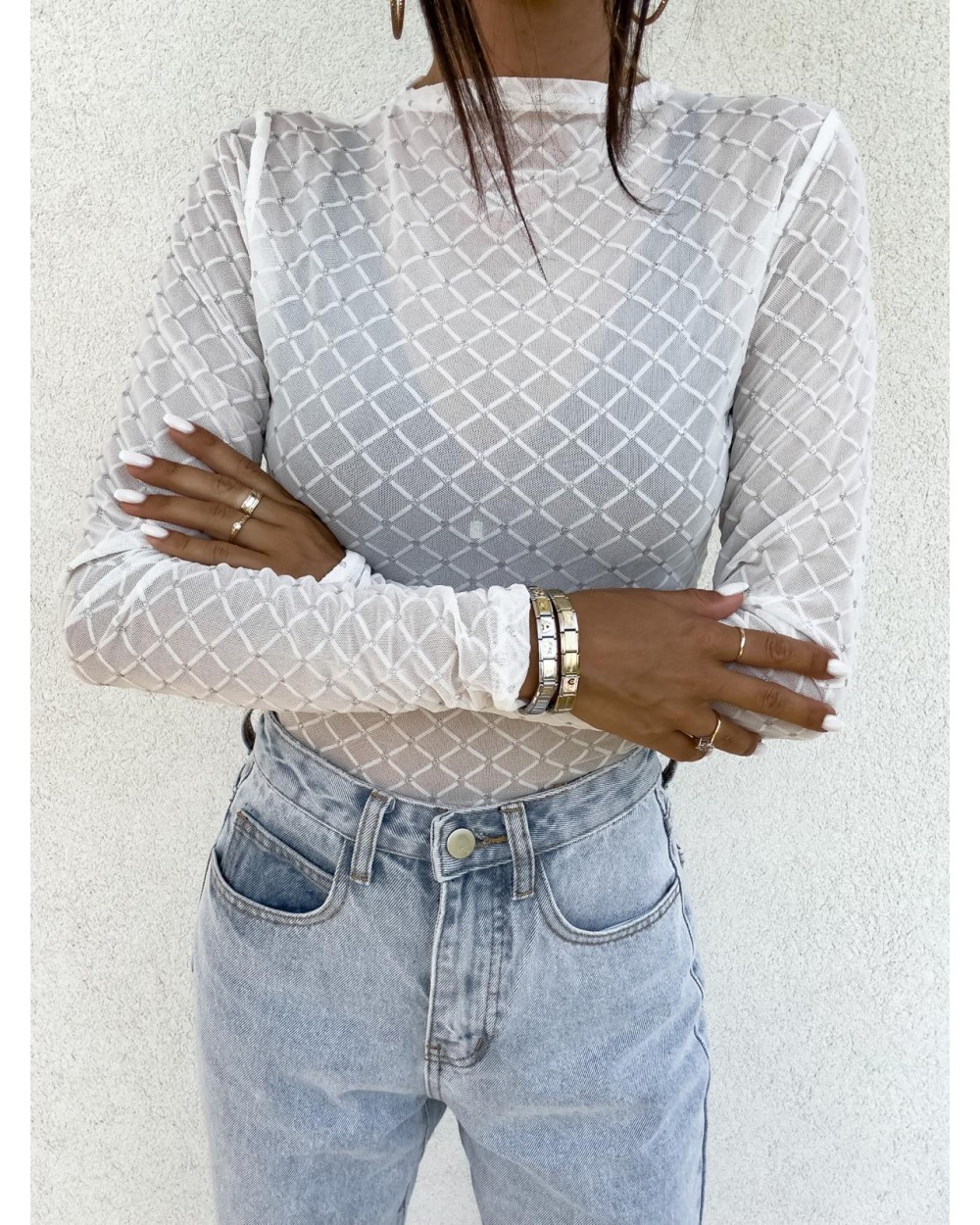 Bluzka Diamond o dopasowanym kroju sprawdzi się jako baza do wielu różnorodnych stylizacji. Wykonana z bardzo delikatnej miłej w dotyku siateczki. Przód i tył z delikatną podszewką, dzięki której nic nie prześwituje. Charakteryzuje się rękawem typu long sleeve. Jej krój zagwarantuje komfort i wygodę noszenia. Delikatna stójka.