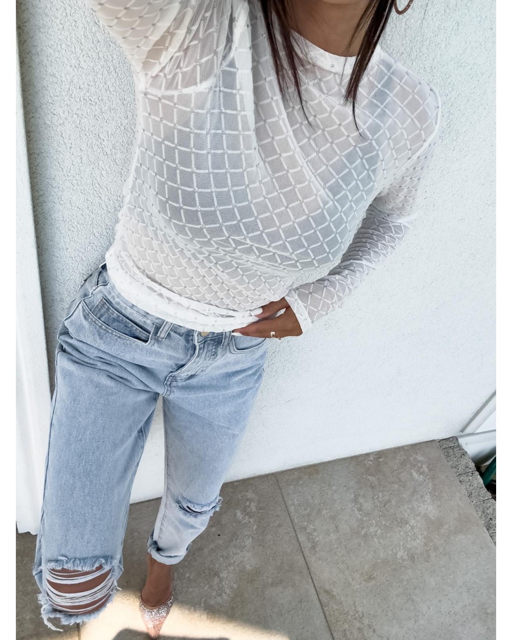Bluzka Diamond o dopasowanym kroju sprawdzi się jako baza do wielu różnorodnych stylizacji. Wykonana z bardzo delikatnej miłej w dotyku siateczki. Przód i tył z delikatną podszewką, dzięki której nic nie prześwituje. Charakteryzuje się rękawem typu long sleeve. Jej krój zagwarantuje komfort i wygodę noszenia. Delikatna stójka.