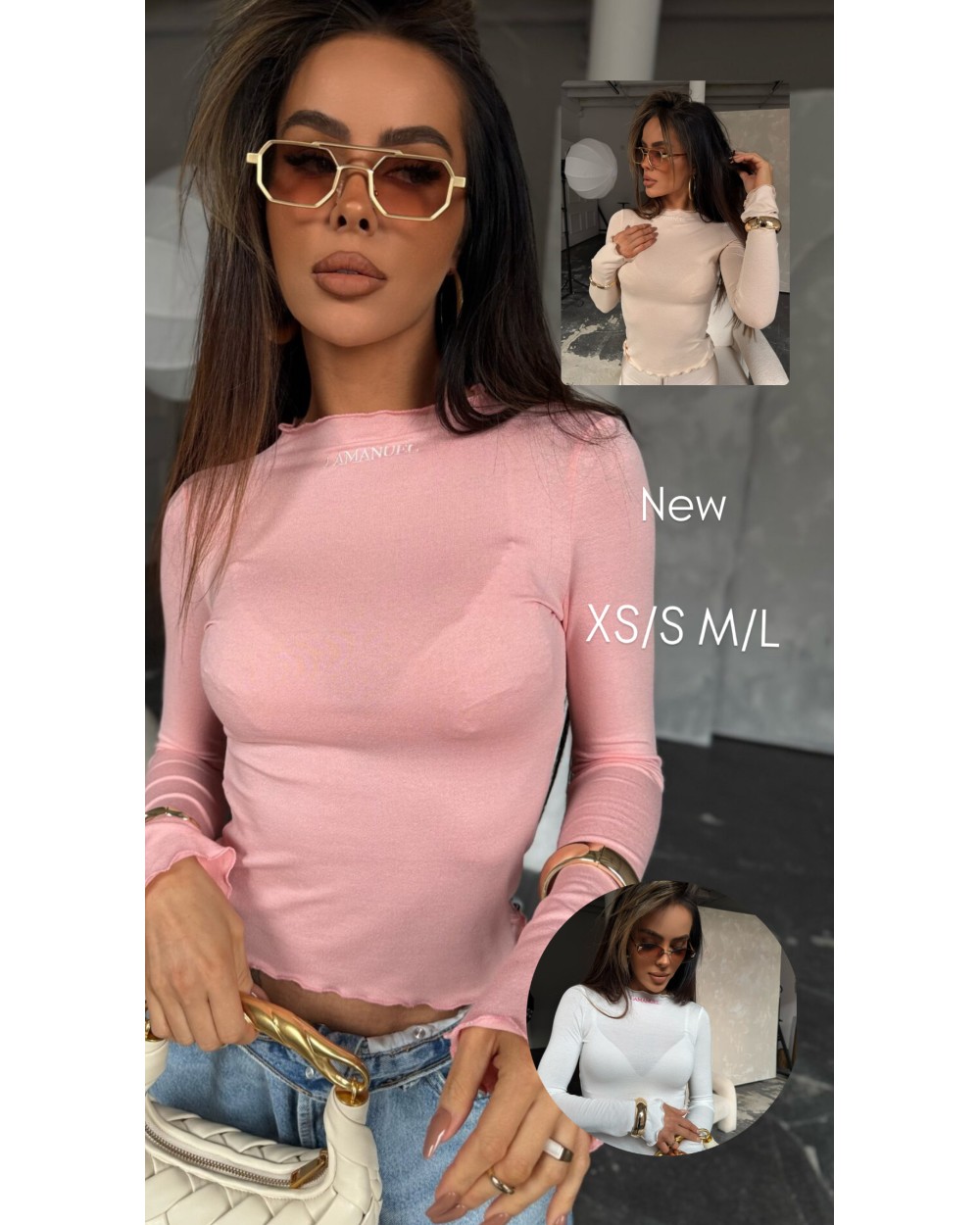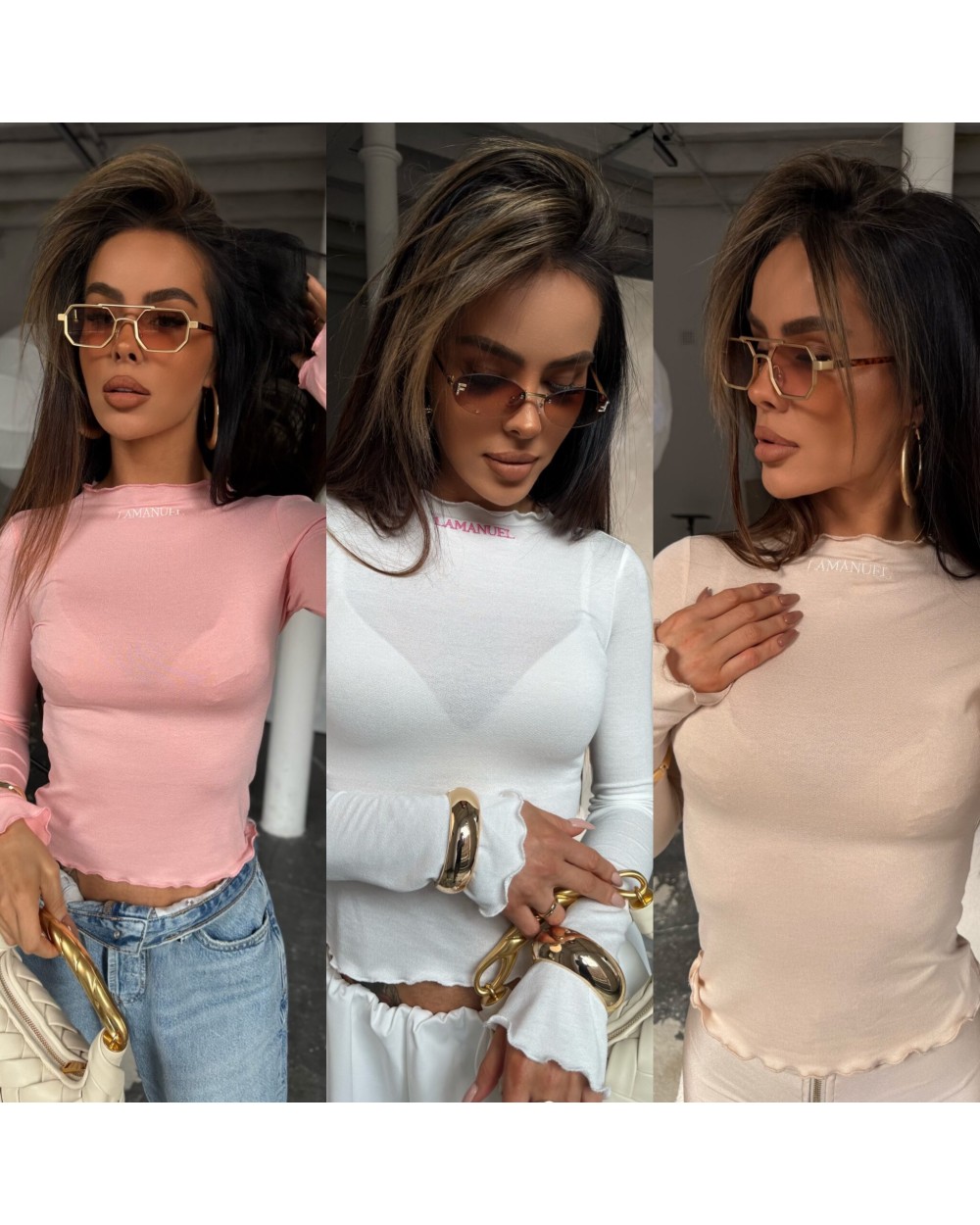 Top z długim rękawem, który łączy delikatność z wyrazistym akcentem. Wykonany z lekkiego, elastycznego materiału, doskonale dopasowuje się do sylwetki, podkreślając jej atuty.