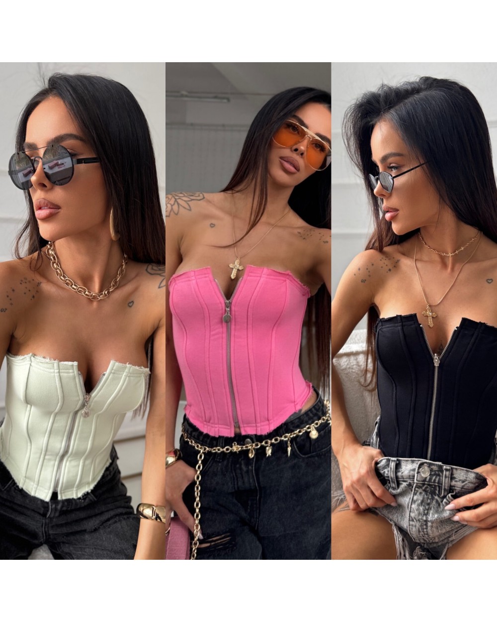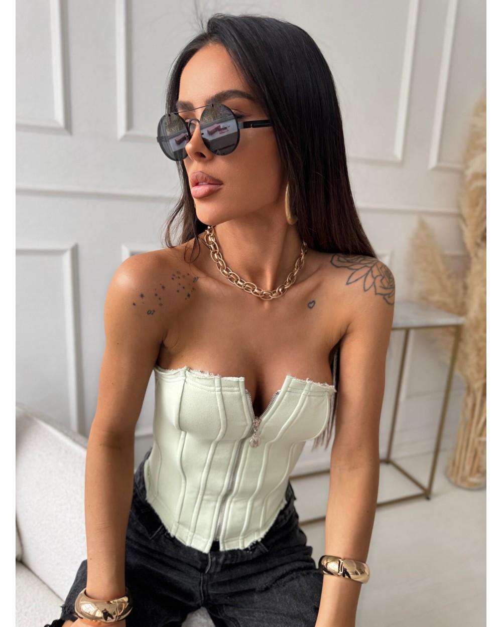 Dzianinowy gorset o dopasowanym kroju, podkreślający sylwetkę. Wykonany z najwyżej jakości bawełny, która zapewnia komfort noszenia. Model bez ramiączek, z dekoracyjnymi przeszyciami oraz zapięciem na suwak z przodu. Surowe wykończenie na górze dodaje mu nowoczesnego charakteru. Idealny do stylizacji z jeansami, szortami lub spodniami z wysokim stanem.