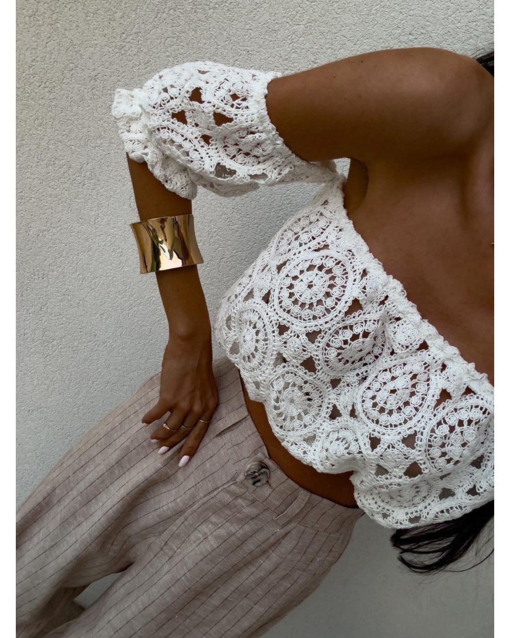 Ażurowa hiszpanka o krótkim kroju to doskonały wybór na ciepłe dni! Jej delikatny, przewiewny materiał sprawia, że jest lekka i komfortowa, idealnie komponując się ze spódnicami i spodniami. Góra bluzki jest wykończona wygodną gumką, która subtelnie dopasowuje się do ciała, zapewniając wygodę noszenia. Gumka przy rękawach dodaje całości uroku, tworząc efektowne, lekko bufiaste rękawy. To propozycja, która łączy elegancję z casualowym stylem, doskonale pasująca do wielu letnich stylizacji.