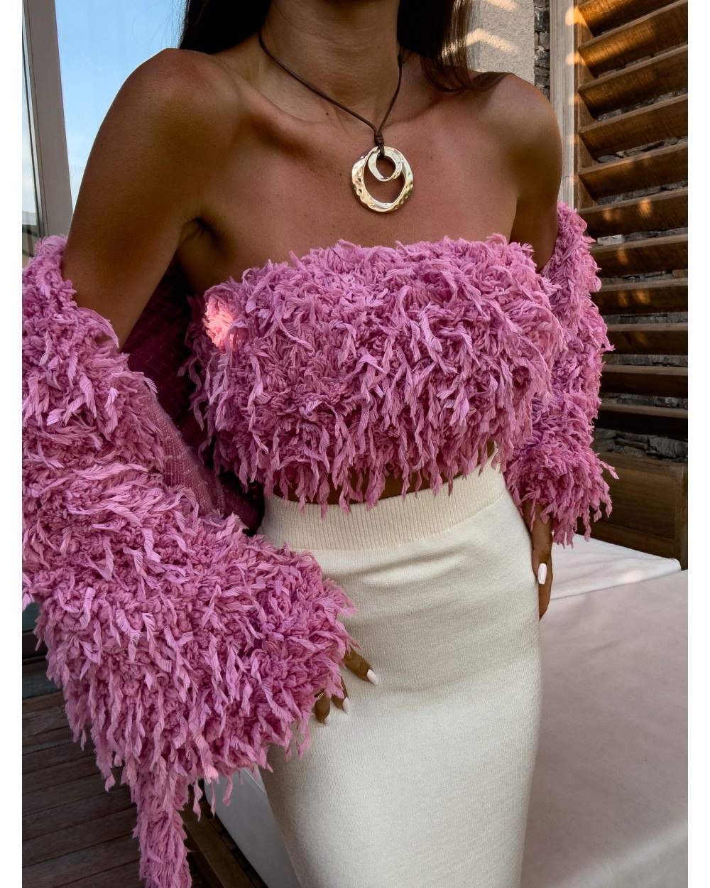 Bluzka Kaira wiązana, którą można nosić dekolt tył/przód. Wykonana z dzianiny w delikatne piórka.
