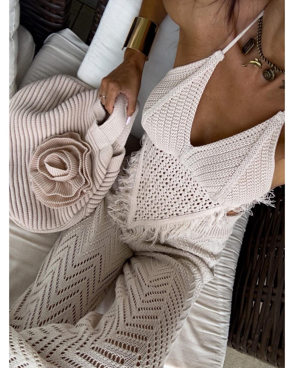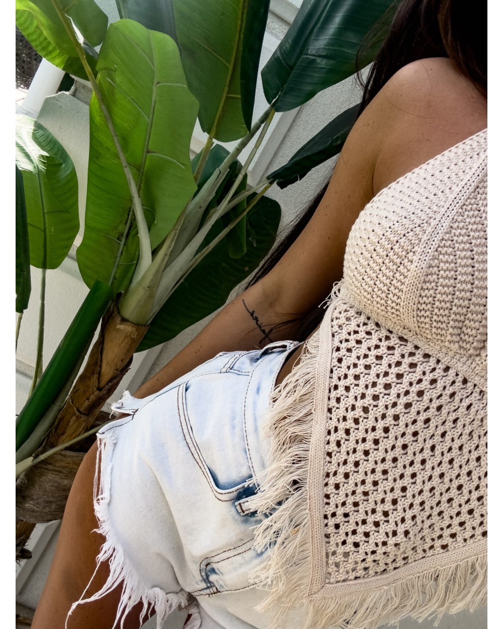Stylowy top z ażurowym przodem, który subtelnie odsłania skórę, dodając lekkości i kobiecego uroku. Model zakończony modnymi frędzlami, które nadają mu boho charakteru. Z tyłu efektowne sznurowanie pozwala dopasować top do sylwetki i dodaje oryginalnego akcentu. Idealny na letnie dni, festiwale czy wakacyjne stylizacje!