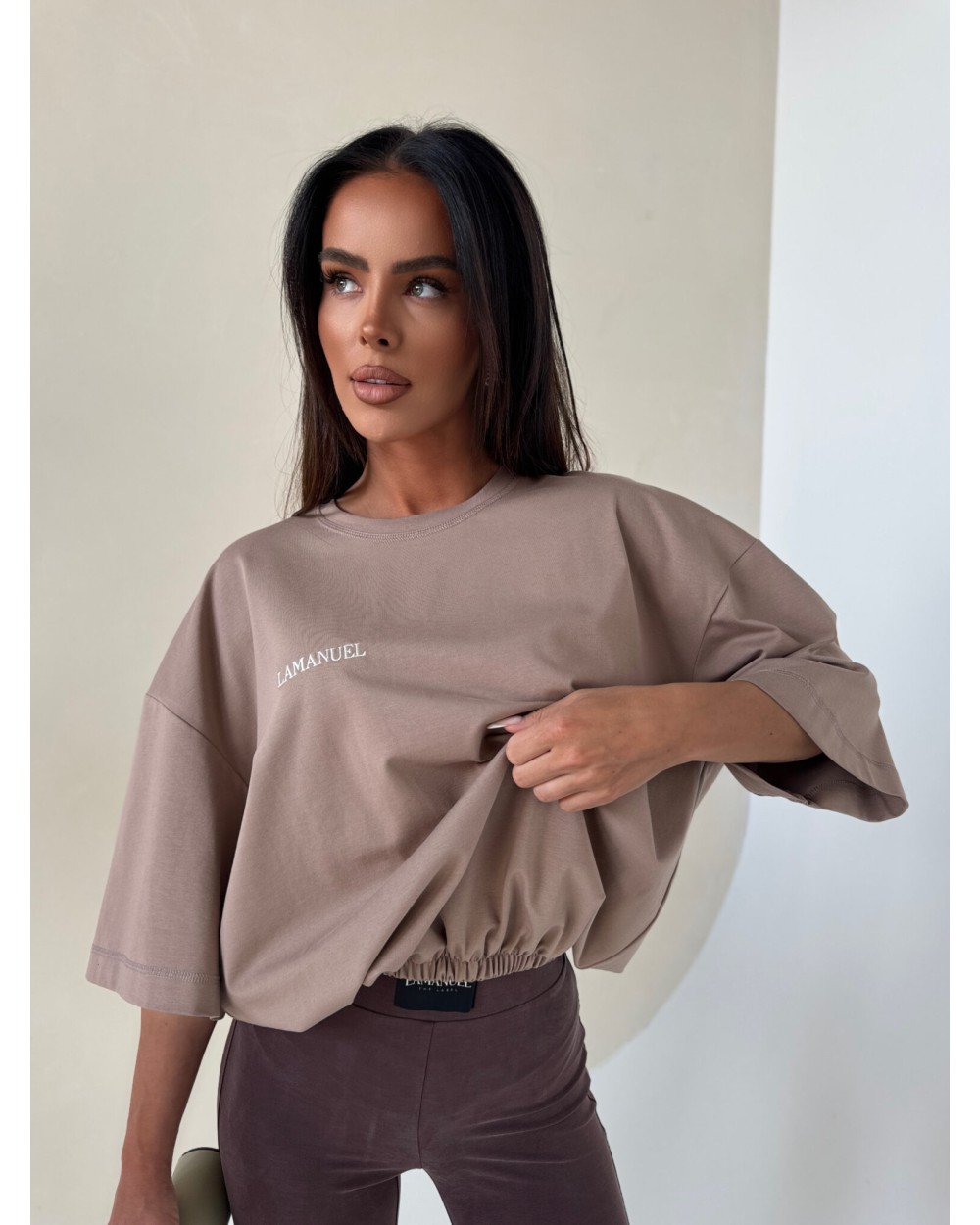 T-shirt o oversize’owym kroju z krótkim rękawem i subtelnym logo lamanuel na piersi. Uszyty z przyjemnej w dotyku bawełnianej dzianiny, zapewnia maksymalny komfort noszenia i swobodę ruchów. Dół wykończony elastyczną gumką, dzięki czemu możesz nosić go luźno lub lekko podciągnięty, eksponując talię. Uniwersalny fason sprawdzi się zarówno w sportowych zestawieniach, jak i w codziennych, minimalistycznych stylizacjach.