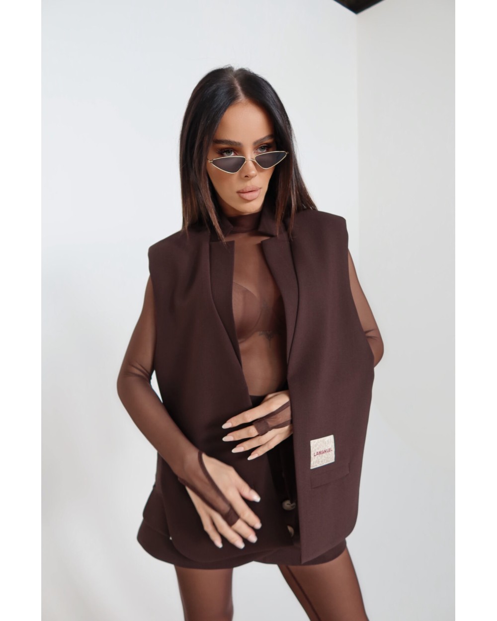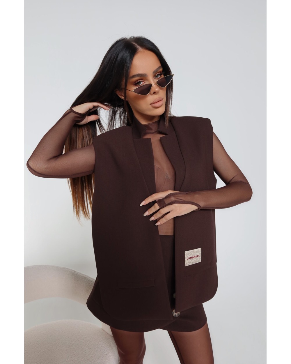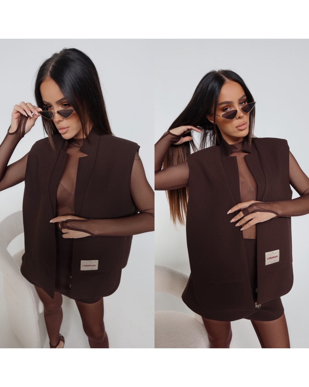 Kamizelka o prostym, pudełkowym kroju, bez zapięcia, z mocno zaznaczoną linią ramion. Minimalistyczna forma przełamana kontrastową naszywką z logo LAMANUEL, umieszczoną przy jednej z atrap kieszeni. Model wykonany z lekko strukturalnej tkaniny garniturowej – sztywniejsza forma dobrze trzyma linię i dodaje sylwetce wyrazistości. Sprawdzi się jako uzupełnienie stylizacji ze spódnicą, spodniami lub warstwowo – na koszulę, golf czy siateczkowy top.