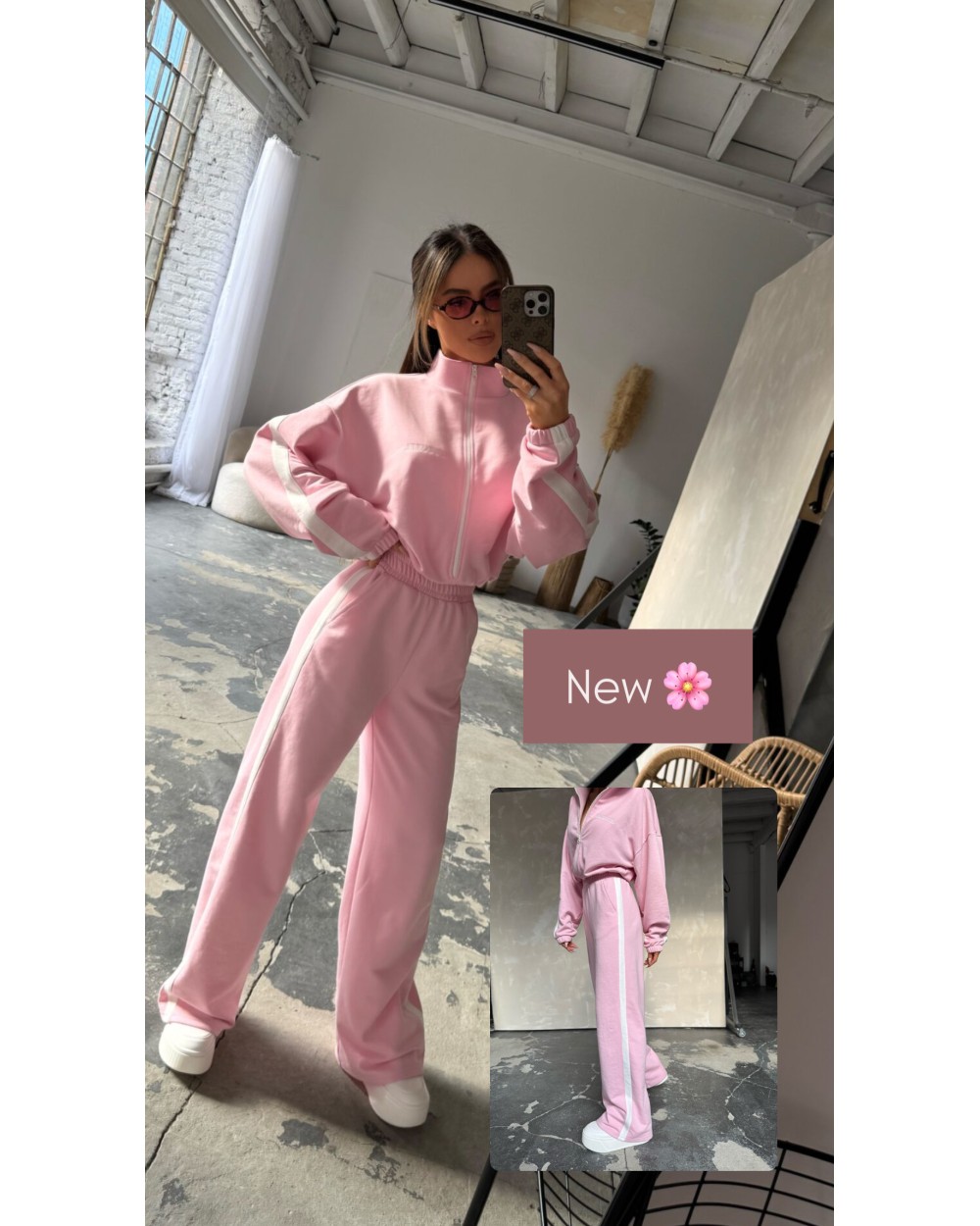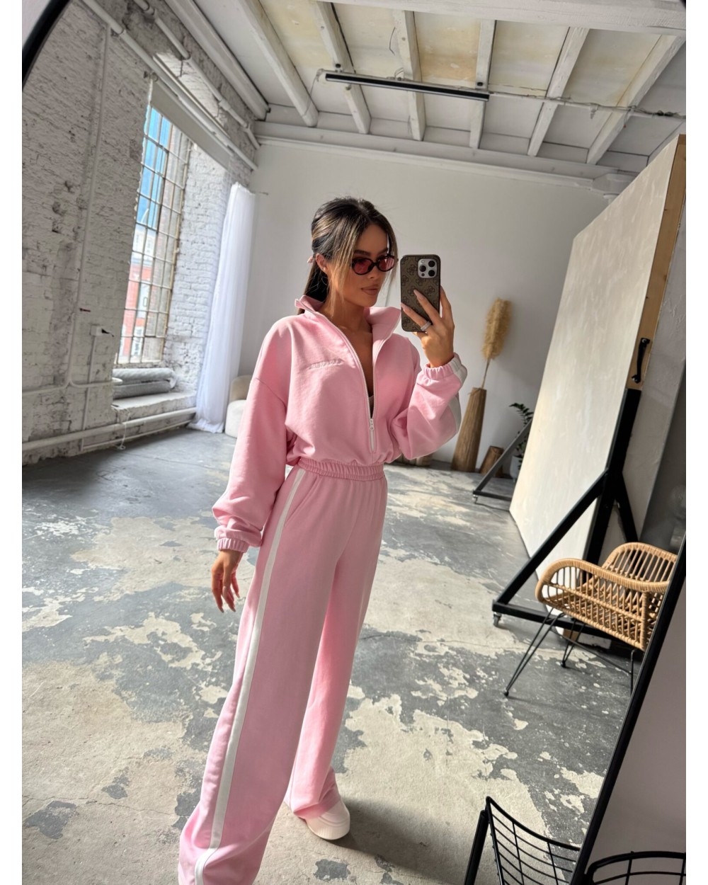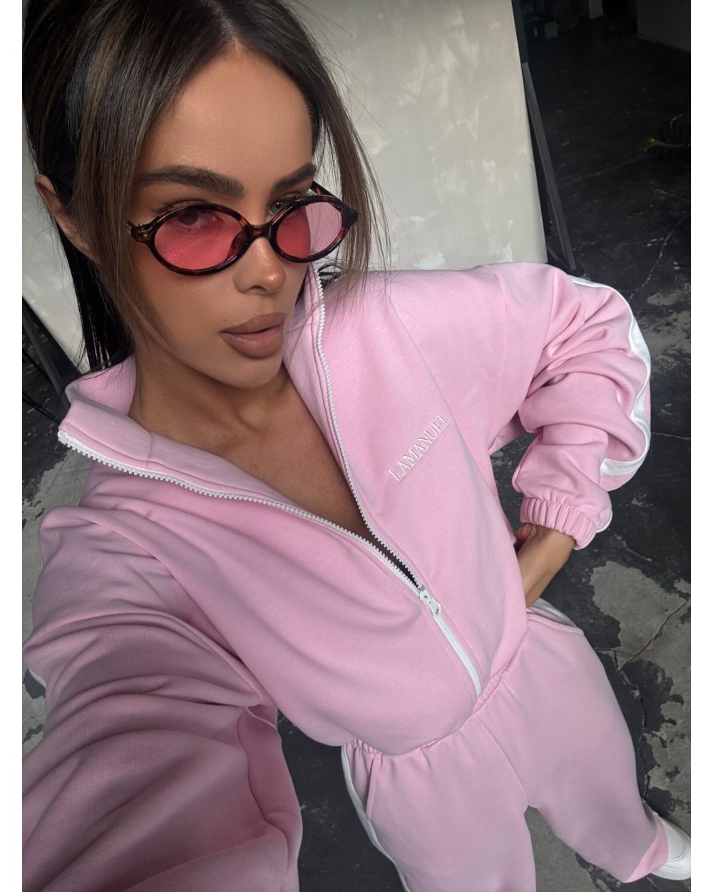 Stylowy design łączy sportową elegancję z subtelnym logo na bluzie. Materiał jest miękki i przyjemny w dotyku, co sprawia, że kombinezon doskonale sprawdzi się na każdą porę roku. Oversize’owy krój dodaje luzu i nowoczesnego wyglądu, a szerokie nogawki z lampasami optycznie wydłużają sylwetkę. Dzięki zamkowi pod szyją można regulować głębokość dekoltu, a elastyczny pas zapewnia idealne dopasowanie.