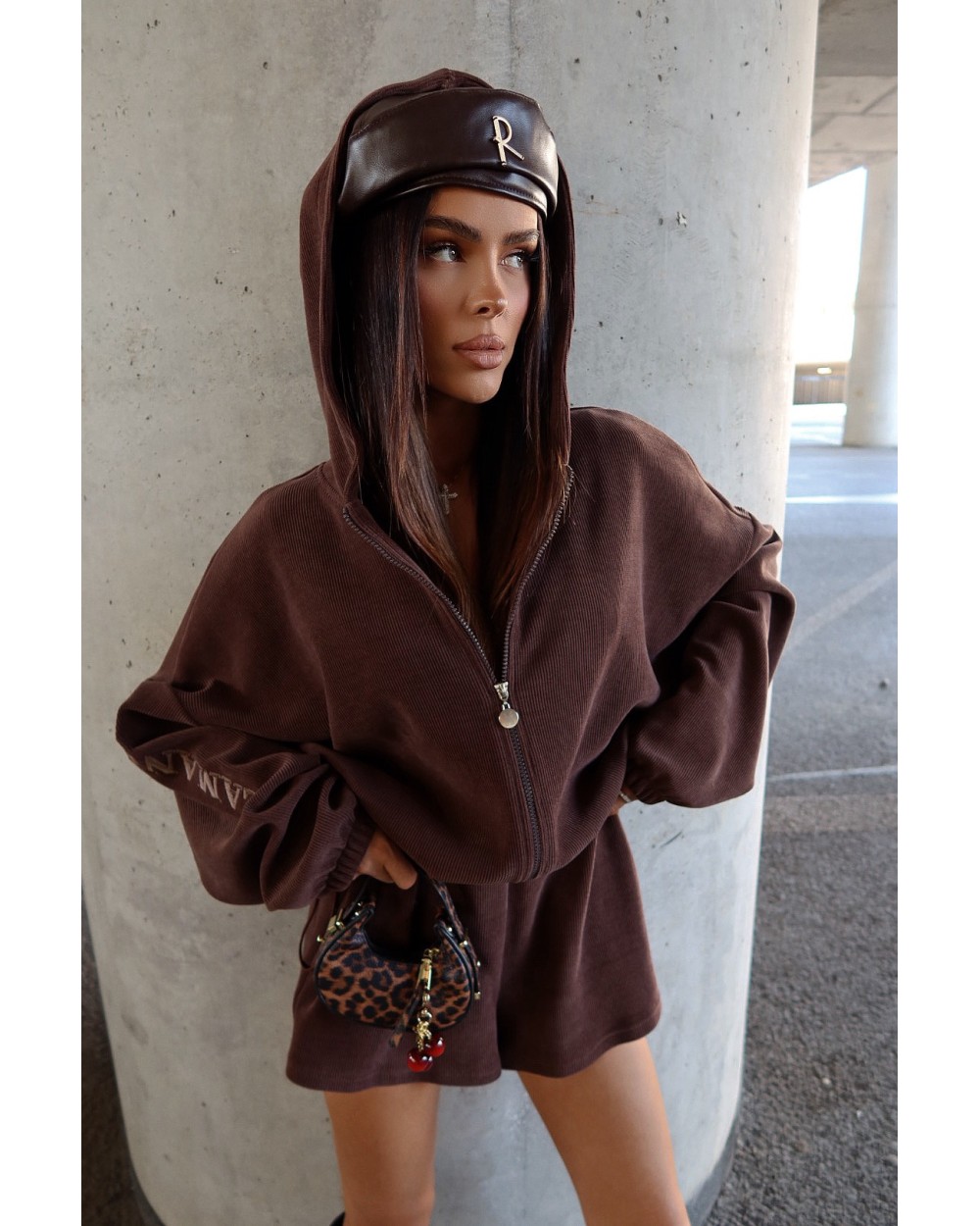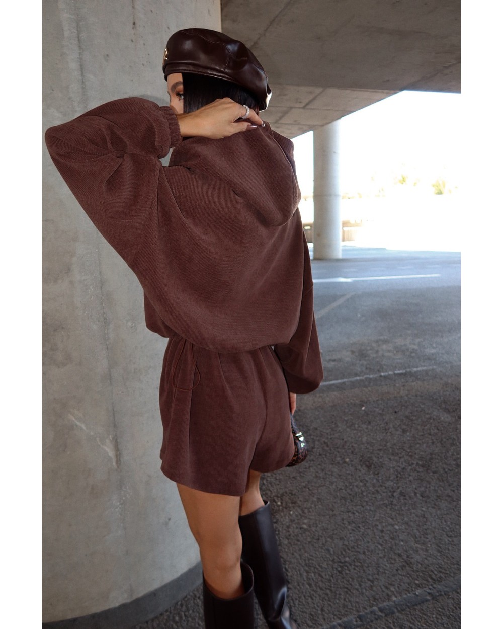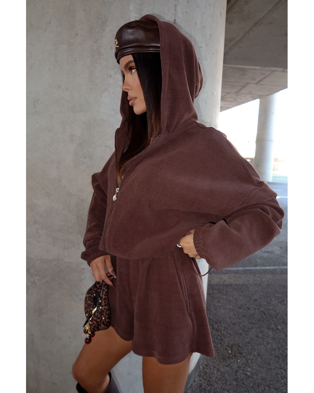 Jednoczęściowy kombinezon z prążkowanej dzianiny, który łączy styl i wygodę w miejskim wydaniu. Luźna góra z kapturem i zamkiem kontrastuje z krótkimi nogawkami, tworząc sylwetkę o lekkim, nowoczesnym charakterze. Model w rozmiarze one size — dzięki elastycznej talii z regulacją świetnie dopasowuje się do różnych sylwetek, również w rozmiarze L.