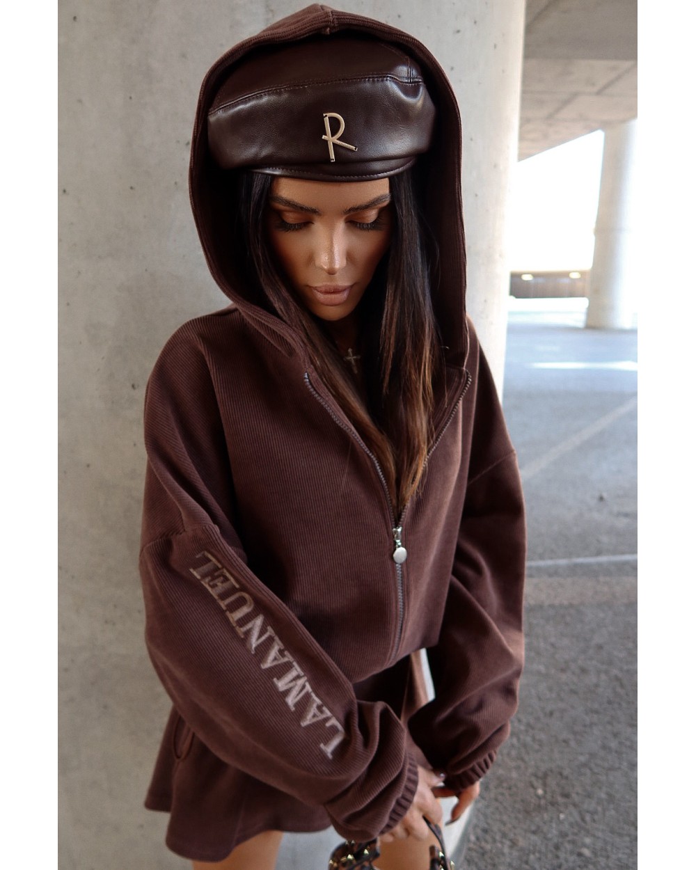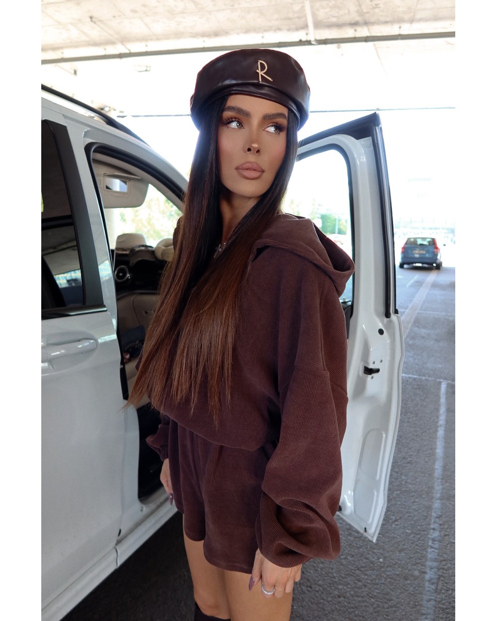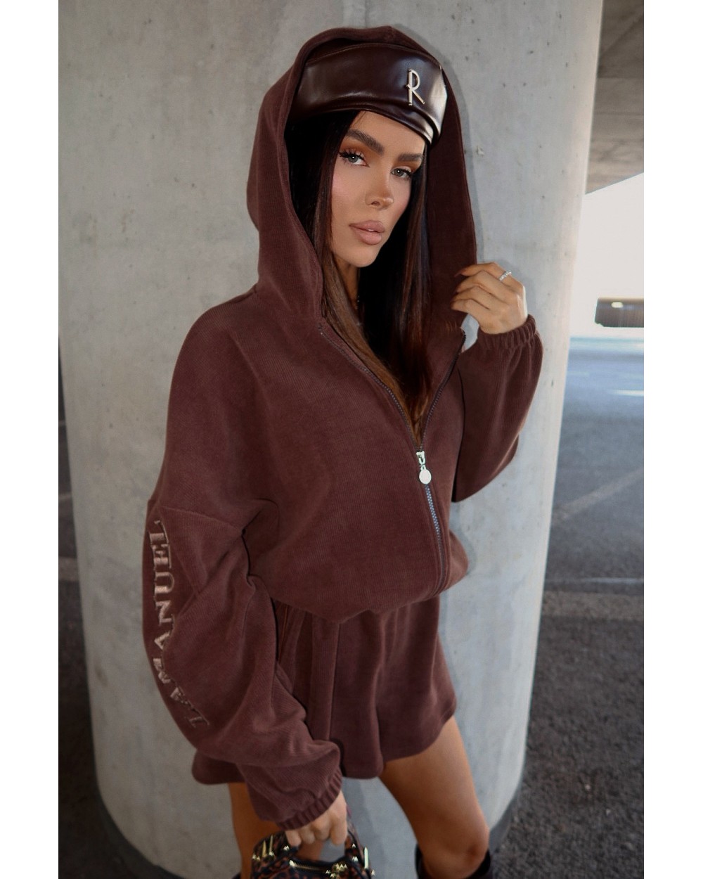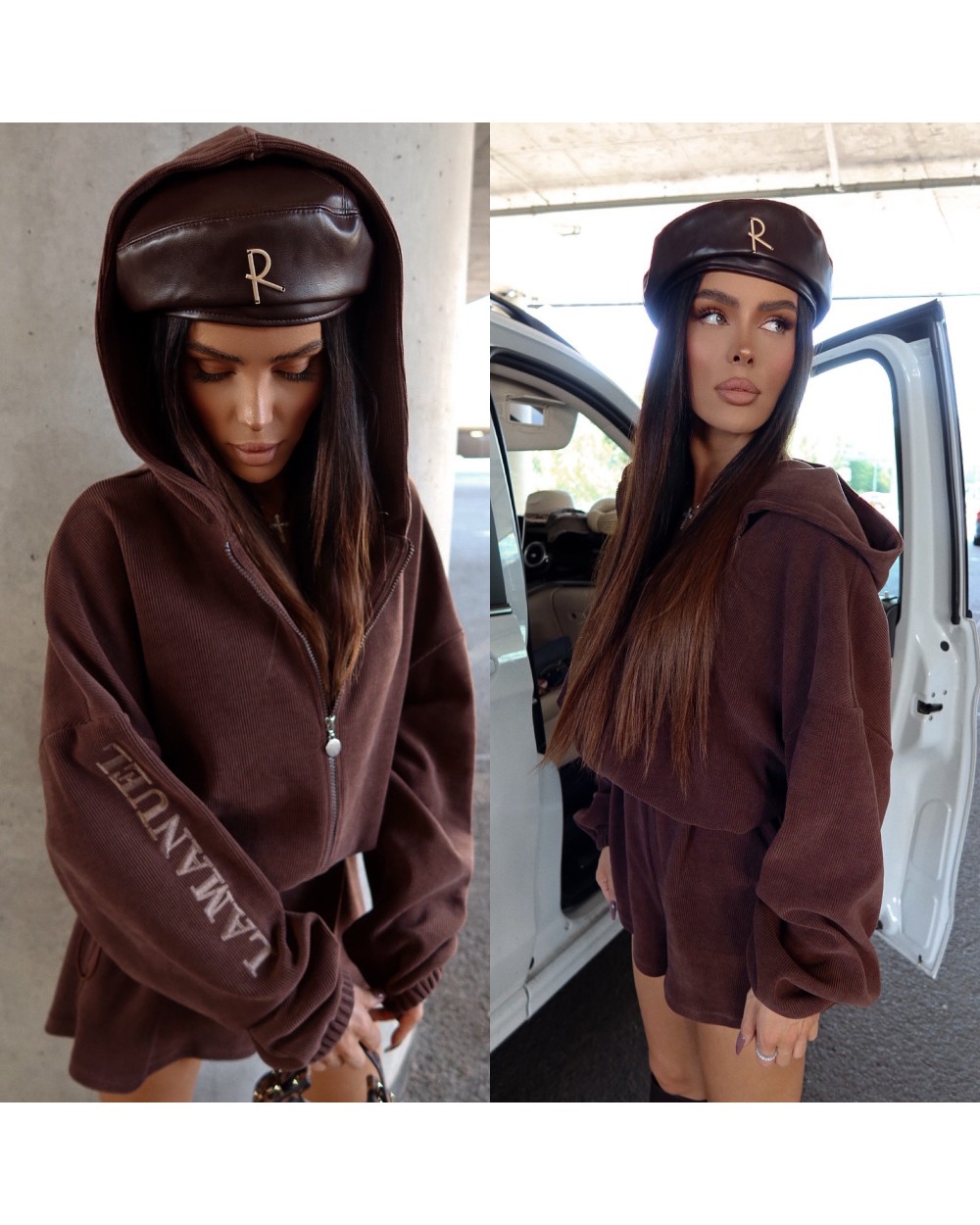 Jednoczęściowy kombinezon z prążkowanej dzianiny, który łączy styl i wygodę w miejskim wydaniu. Luźna góra z kapturem i zamkiem kontrastuje z krótkimi nogawkami, tworząc sylwetkę o lekkim, nowoczesnym charakterze. Model w rozmiarze one size — dzięki elastycznej talii z regulacją świetnie dopasowuje się do różnych sylwetek, również w rozmiarze L.