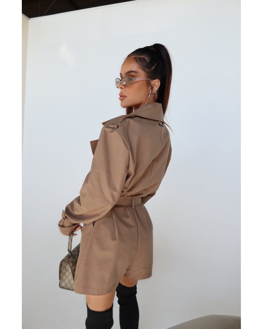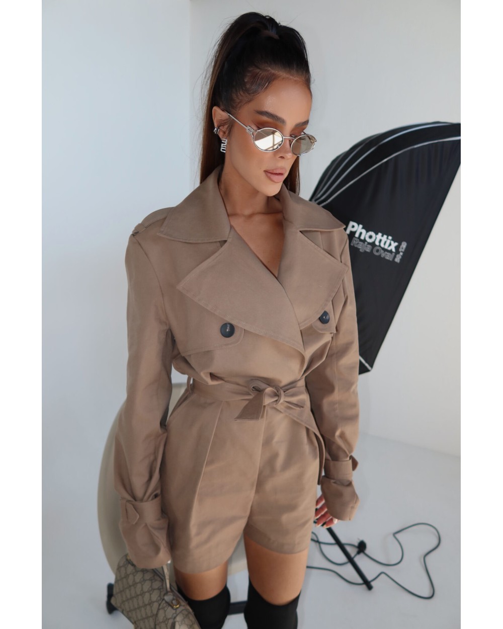 Kombinezon o kroju inspirowanym klasycznym trenczem, z wyraźnie zaznaczoną talią i szerokim kołnierzem. Dwurzędowe guziki, mankiety z patkami i naramienniki nawiązują do ponadczasowej formy, a krótkie nogawki i boczny zamek nadają mu nowoczesnego, kobiecego charakteru. Model dopełnia pasek wiązany w talii, który pozwala regulować sylwetkę. Idealny na sezon przejściowy – wystarczy dodać kozaki lub szpilki i gotowe.