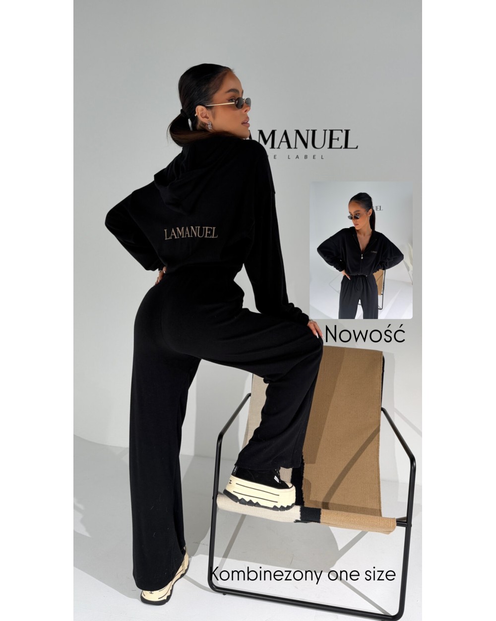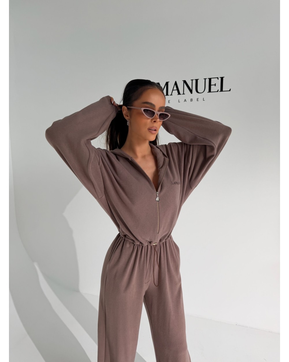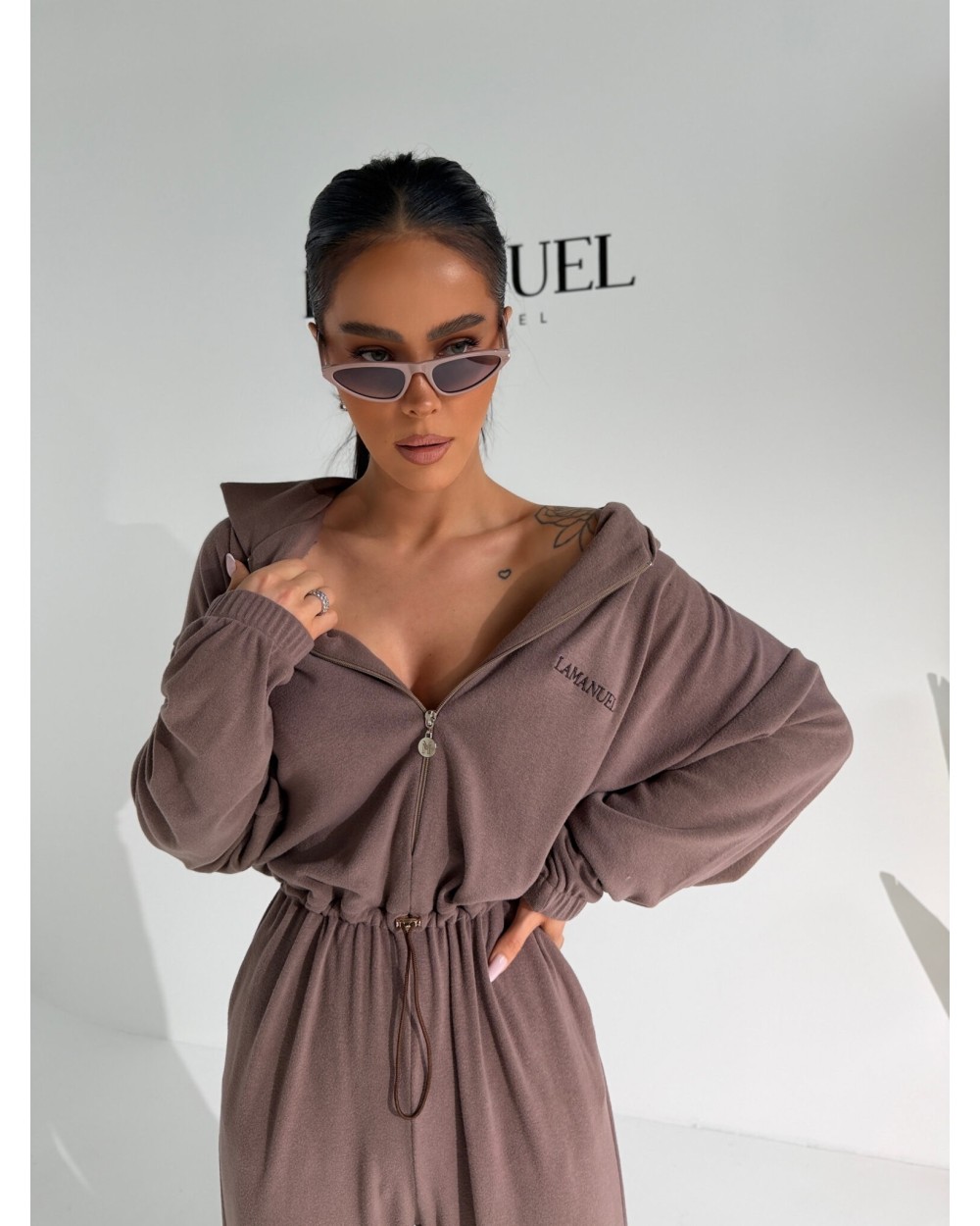 Kombinezon z przyjemnego w dotyku rayonu o lejącej, cięższej strukturze, która pięknie układa się na sylwetce i dodaje całości premium charakteru. Góra zapinana na suwak, z kapturem i długim rękawem zakończonym gumką. W talii elastyczny gumosznurek z możliwością regulacji, który podkreśla proporcje i pozwala dopasować fason do figury. Z przodu i z tyłu wyhaftowane logo lamanuel – subtelne, ale wyraziste. Świetna propozycja dla klientek szukających komfortu w dopracowanej, nowoczesnej formie.