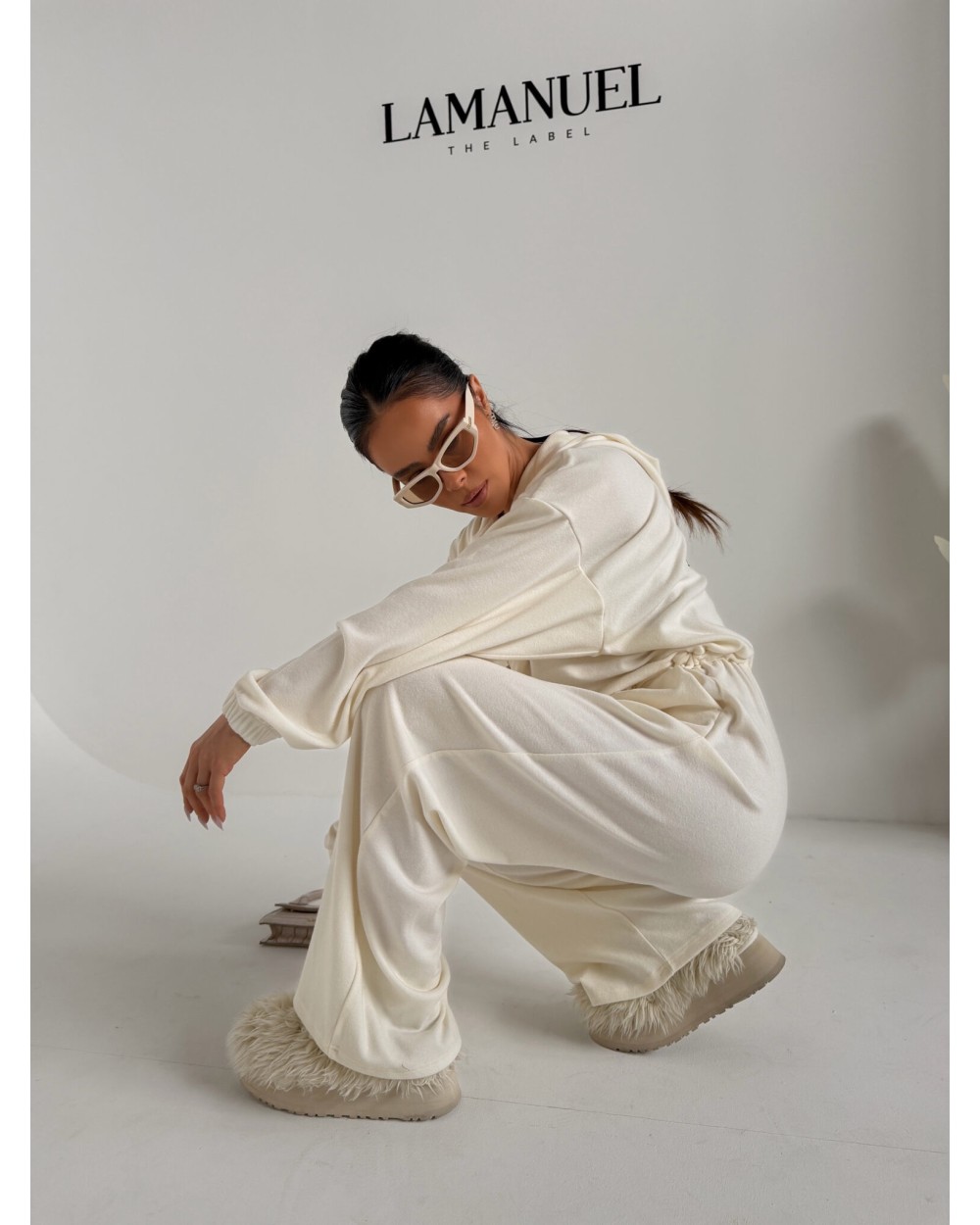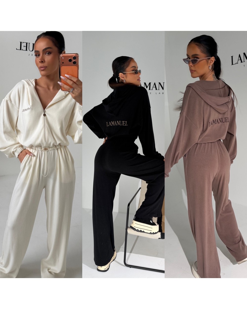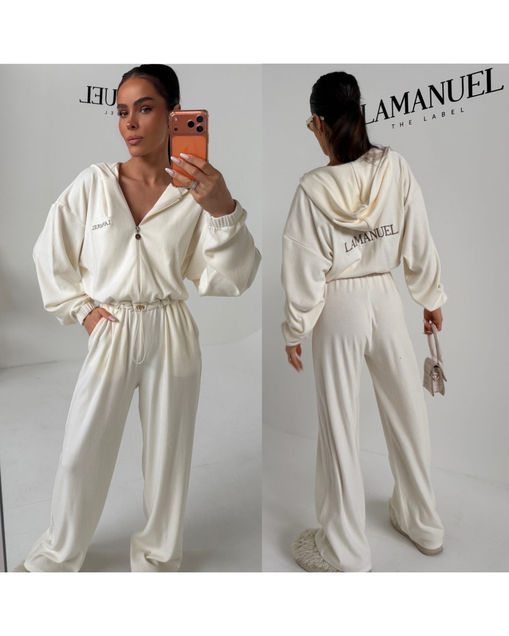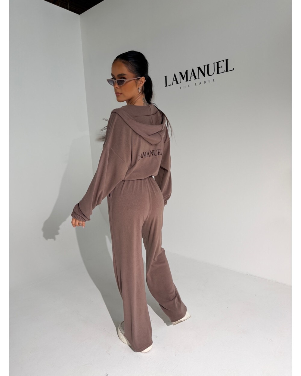 Kombinezon z przyjemnego w dotyku rayonu o lejącej, cięższej strukturze, która pięknie układa się na sylwetce i dodaje całości premium charakteru. Góra zapinana na suwak, z kapturem i długim rękawem zakończonym gumką. W talii elastyczny gumosznurek z możliwością regulacji, który podkreśla proporcje i pozwala dopasować fason do figury. Z przodu i z tyłu wyhaftowane logo lamanuel – subtelne, ale wyraziste. Świetna propozycja dla klientek szukających komfortu w dopracowanej, nowoczesnej formie.