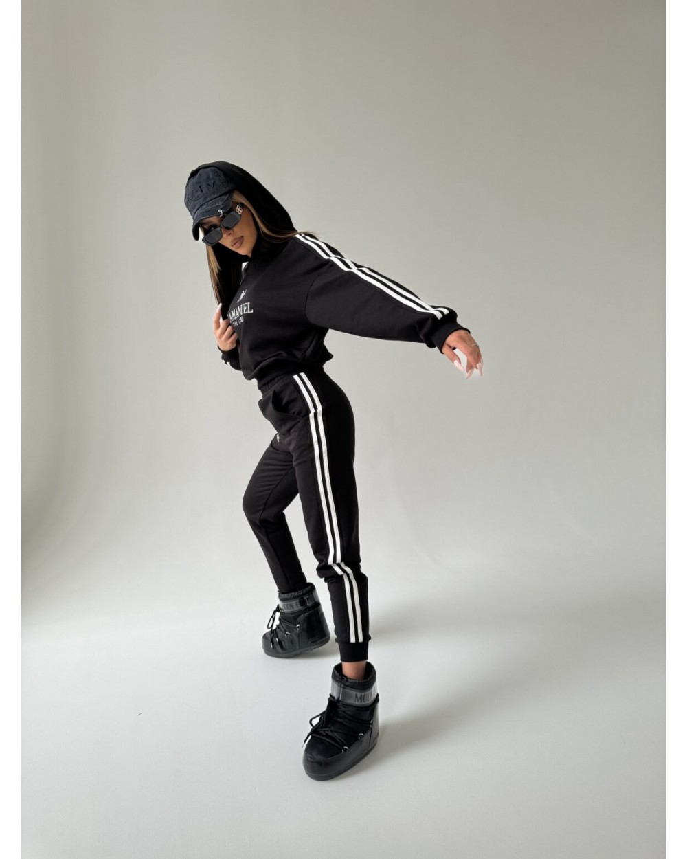 Odkryj nowy wymiar stylu z naszym niepowtarzalnym kompletu damskim, stworzonym z myślą o współczesnych trendach i niepowtarzalnym designie. Komplet składa się z bluzy z kapturem oraz spodni z podwyższonym stanem z gumą w pasie.. Wykonana z wysokiej jakości miękkiego materiału, bluza damska prezentuje się nie tylko stylowo, ale również zapewnia wyjątkowy komfort noszenia. Zarówno spodnie jak i bluzę zdobią białe lampasy po bokach, nadając całemu zestawowi dynamicznego charakteru. Wykonany z wysokiej jakości miękkiego materiału. Nasza definicja komfortu na co dzień!