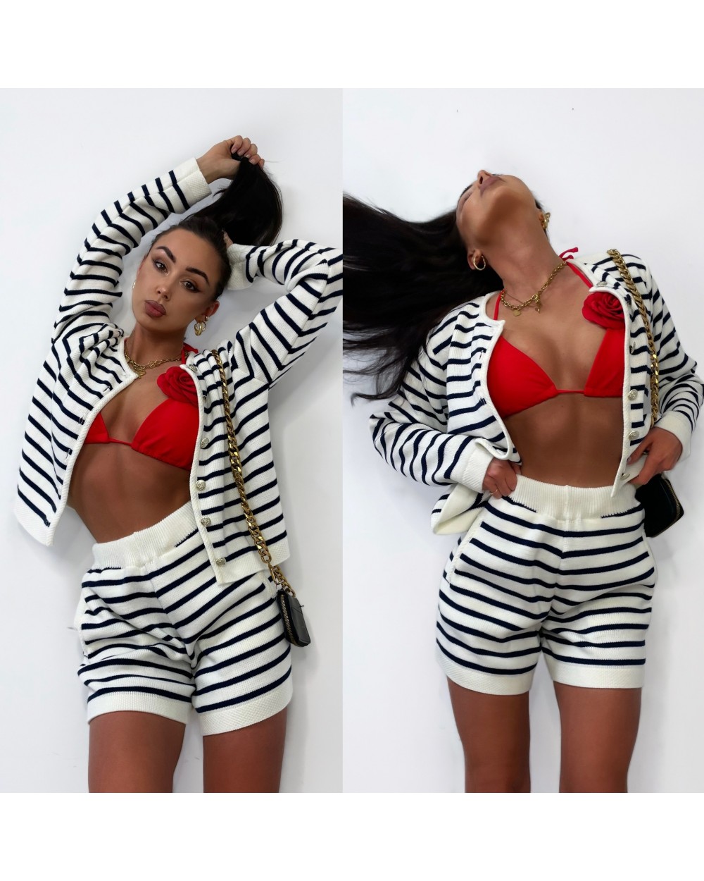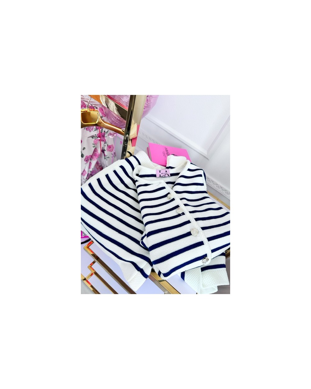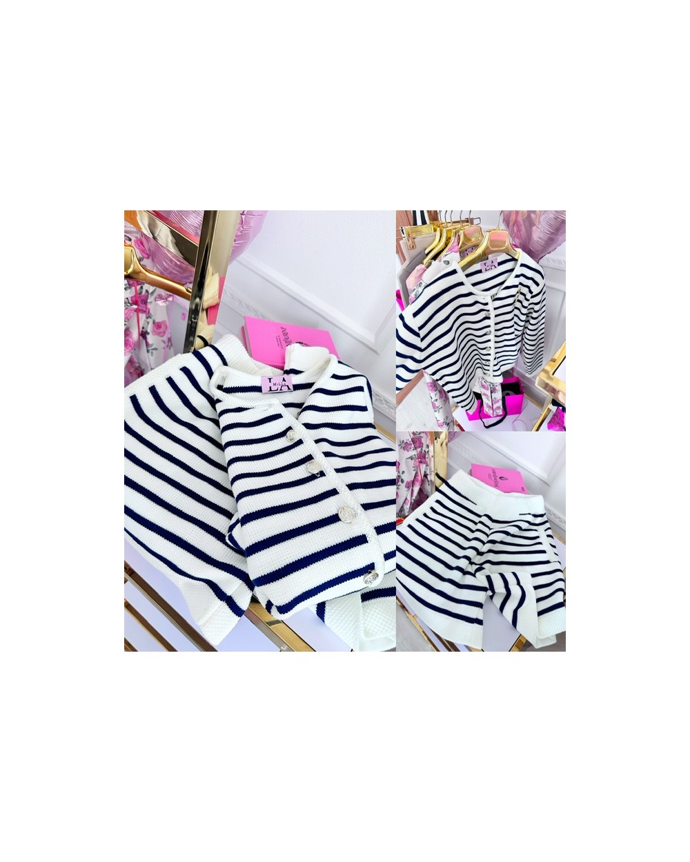 Dzianinowy komplet w paski z ozdobnymi guziczkami. Spodenki z elastyczną gumką w pasie. Wymiary: Sweter Długość całkowita: 49 cm Obwód w biuście: od 106 cm do 120 cm po rozciągnięciu Spodenki Długość całkowita: 40 cm Długość nogawki: 12 cm Wysokość stanu: 33 cm Obwód w pasie (gumka): od 60 cm do 86 cm po rozciągnięciu Obwód w biodrach: 112 cm Ubrania mierzone na płasko! Poszczególne wymiary mogą różnić się +/- 2 cm. Produkt polski.