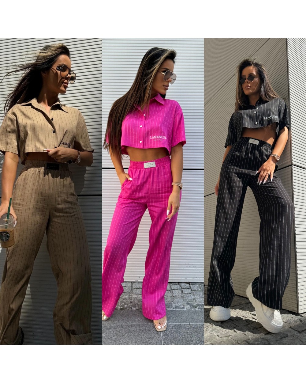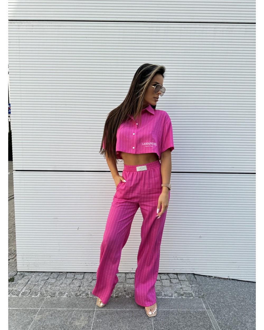 Dwuczęściowy komplet to połączenie świeżości wzoru w paski z nowoczesnym krojem, które dodają charakteru i stylu każdej kobiecej garderobie. Spodnie rozszerzane zapewniają swobodę ruchów, jednocześnie podkreślając sylwetkę, natomiast koszula crop top o krótkich rękawach dodaje lekkości i dziewczęcego uroku. Całość w paski tworzy efektowną kompozycję, która doskonale sprawdzi się zarówno na letnie wyjścia, jak i na spotkania ze znajomymi. To idealny zestaw dla kobiet ceniących sobie wygodę i modny wygląd jednocześnie.
