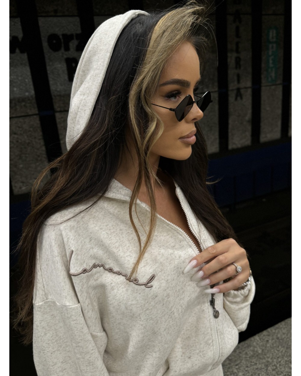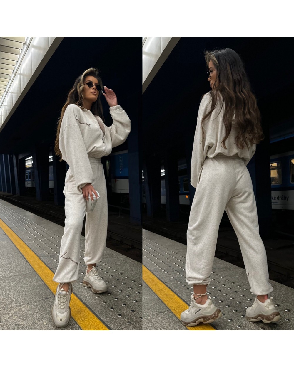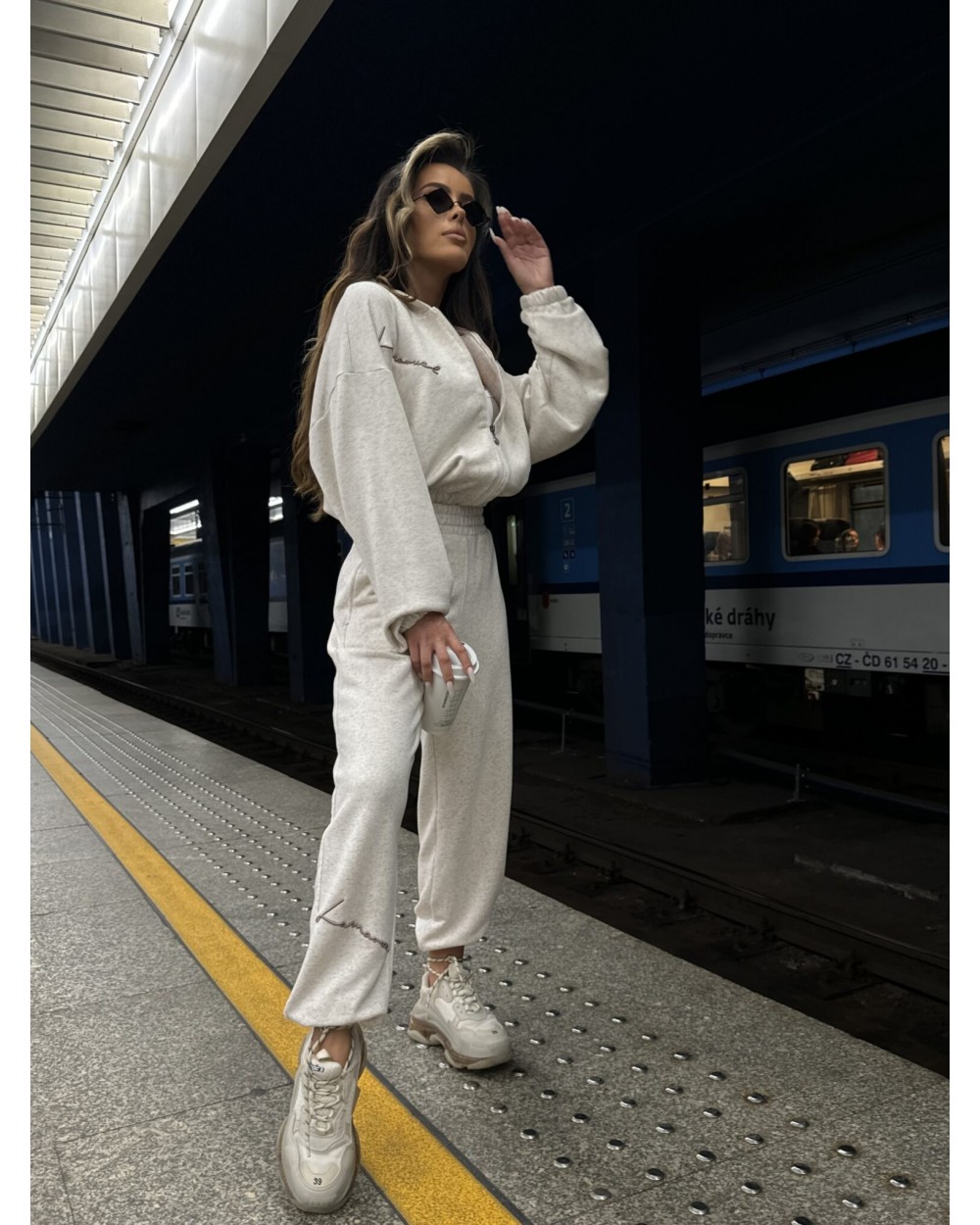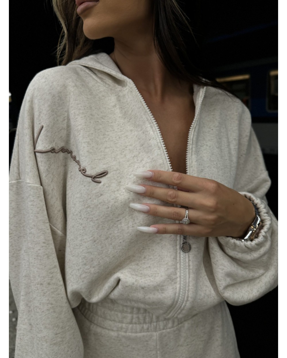 Damski dres z bawełny lnianej, składający się z rozpinanej bluzy z kapturem, ozdobionej haftowanym logo, oraz dopasowanych spodni dresowych. Wykonany z miękkiego i elastycznego materiału, zapewnia wygodę i swobodę ruchów. Świetnie sprawdzi się jako cały look, chociaż możesz stylizować go jak chcesz – łącząc z innymi elementami swojej garderoby.