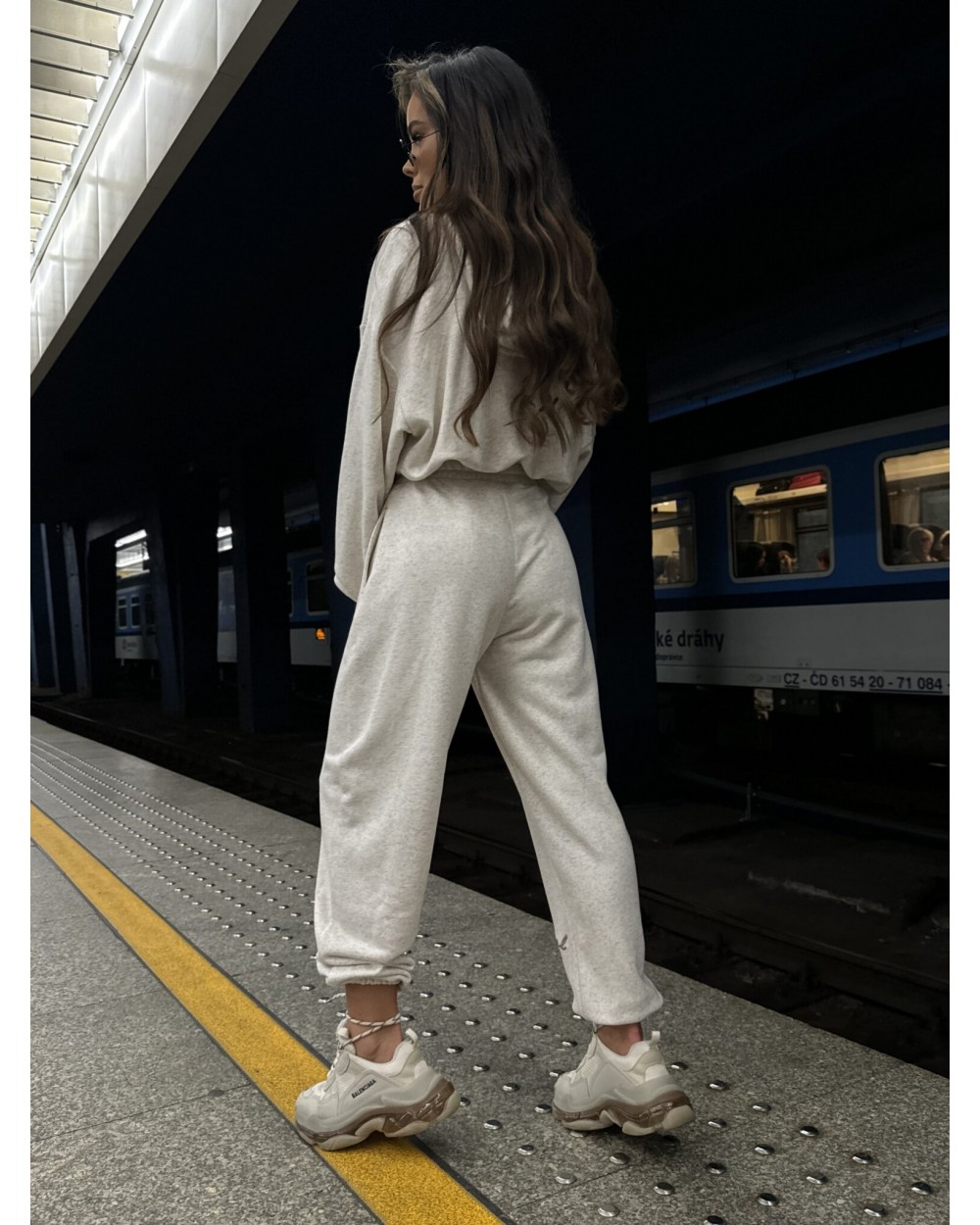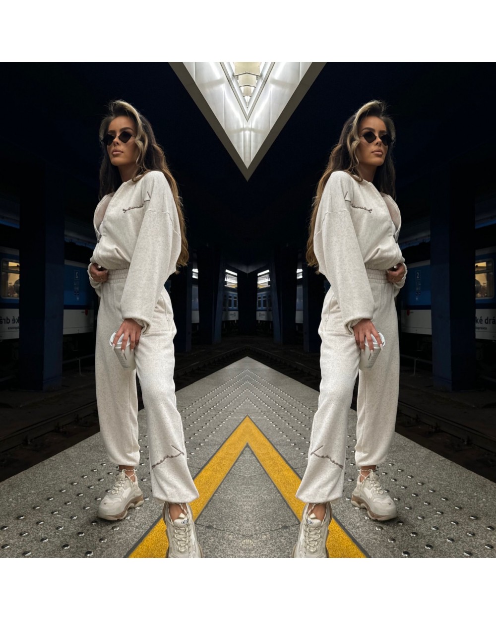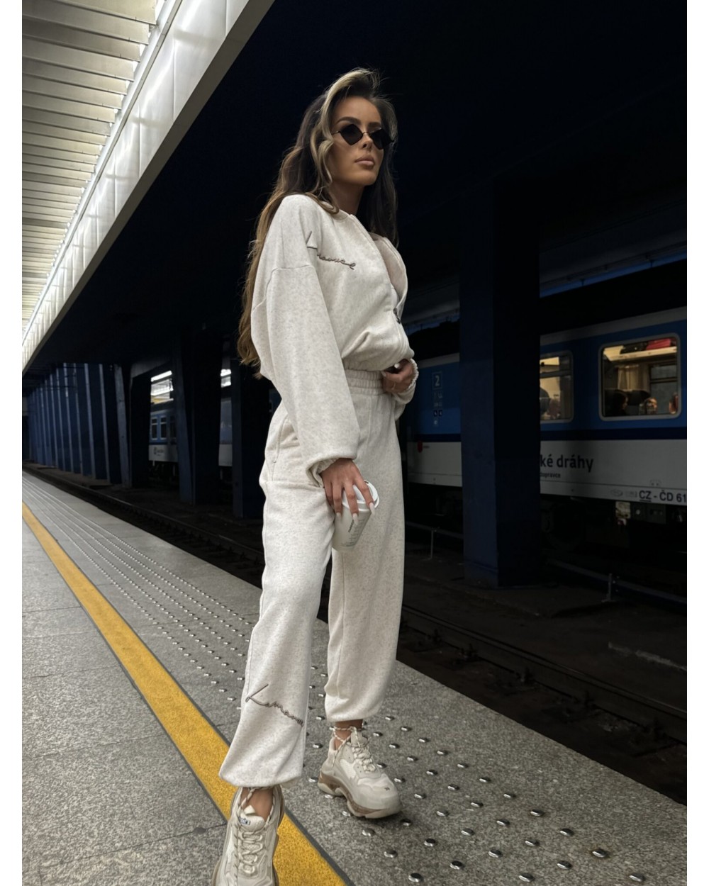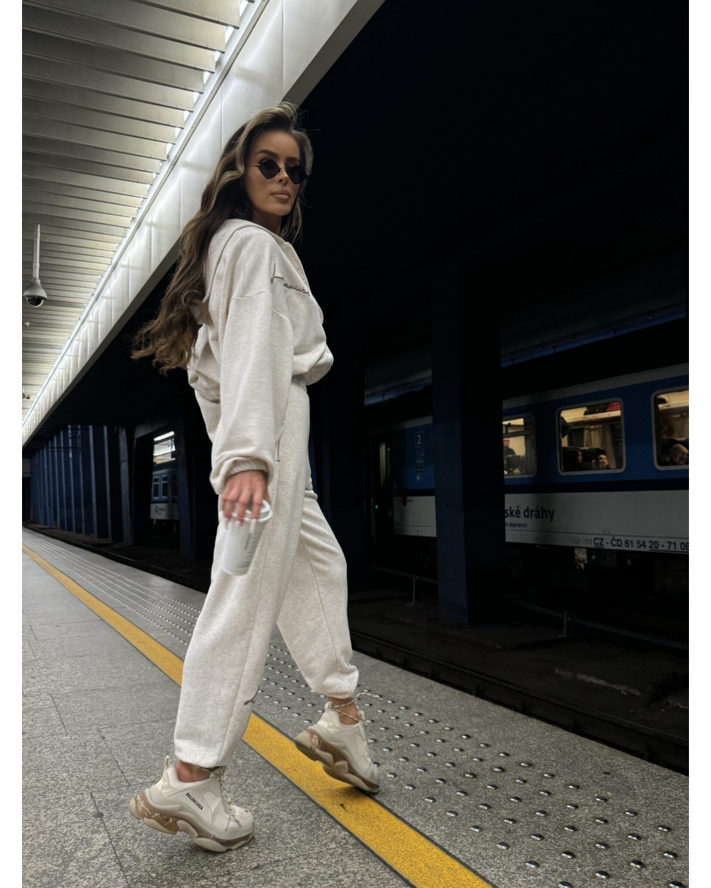 Damski dres z bawełny lnianej, składający się z rozpinanej bluzy z kapturem, ozdobionej haftowanym logo, oraz dopasowanych spodni dresowych. Wykonany z miękkiego i elastycznego materiału, zapewnia wygodę i swobodę ruchów. Świetnie sprawdzi się jako cały look, chociaż możesz stylizować go jak chcesz – łącząc z innymi elementami swojej garderoby.