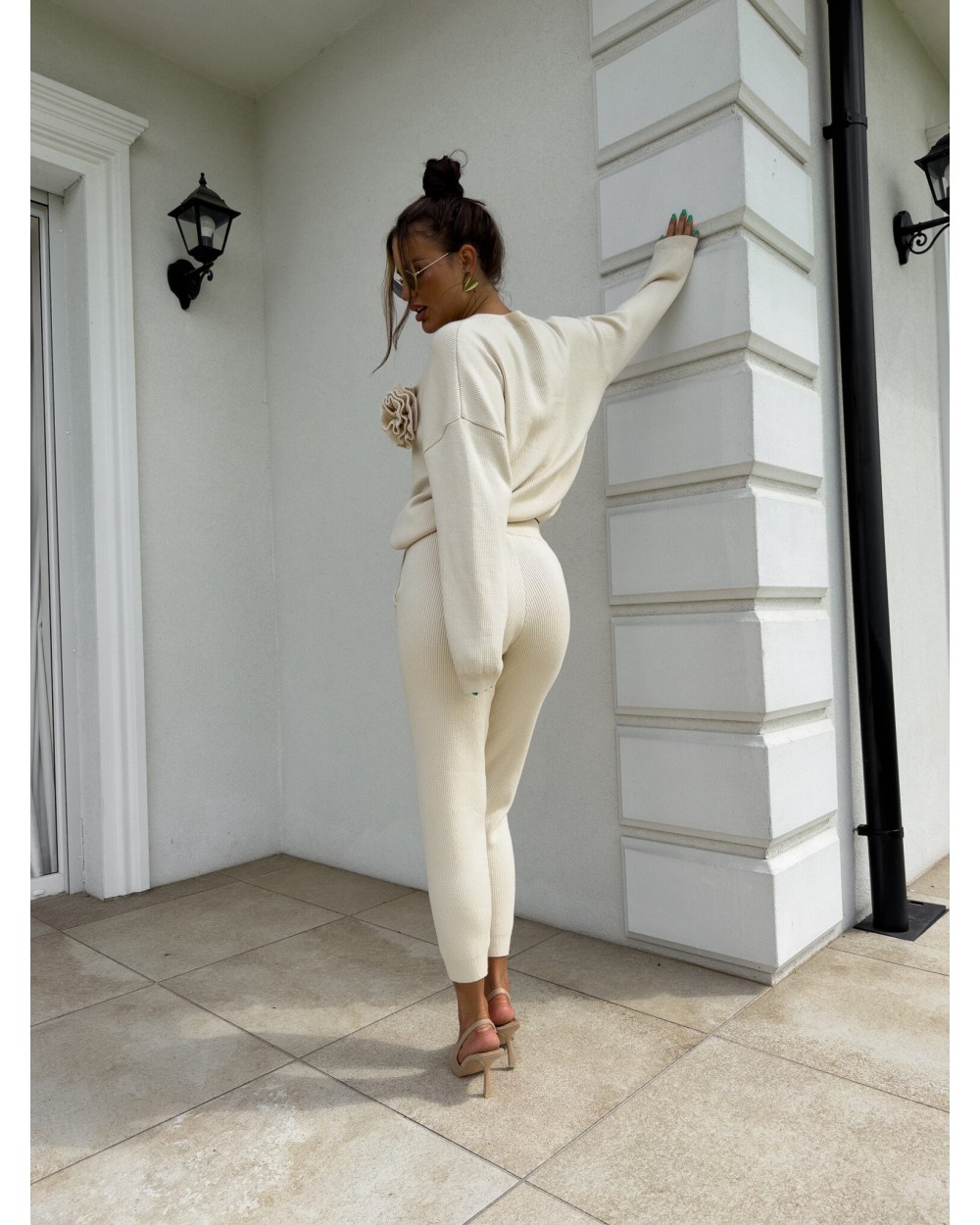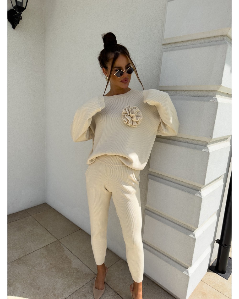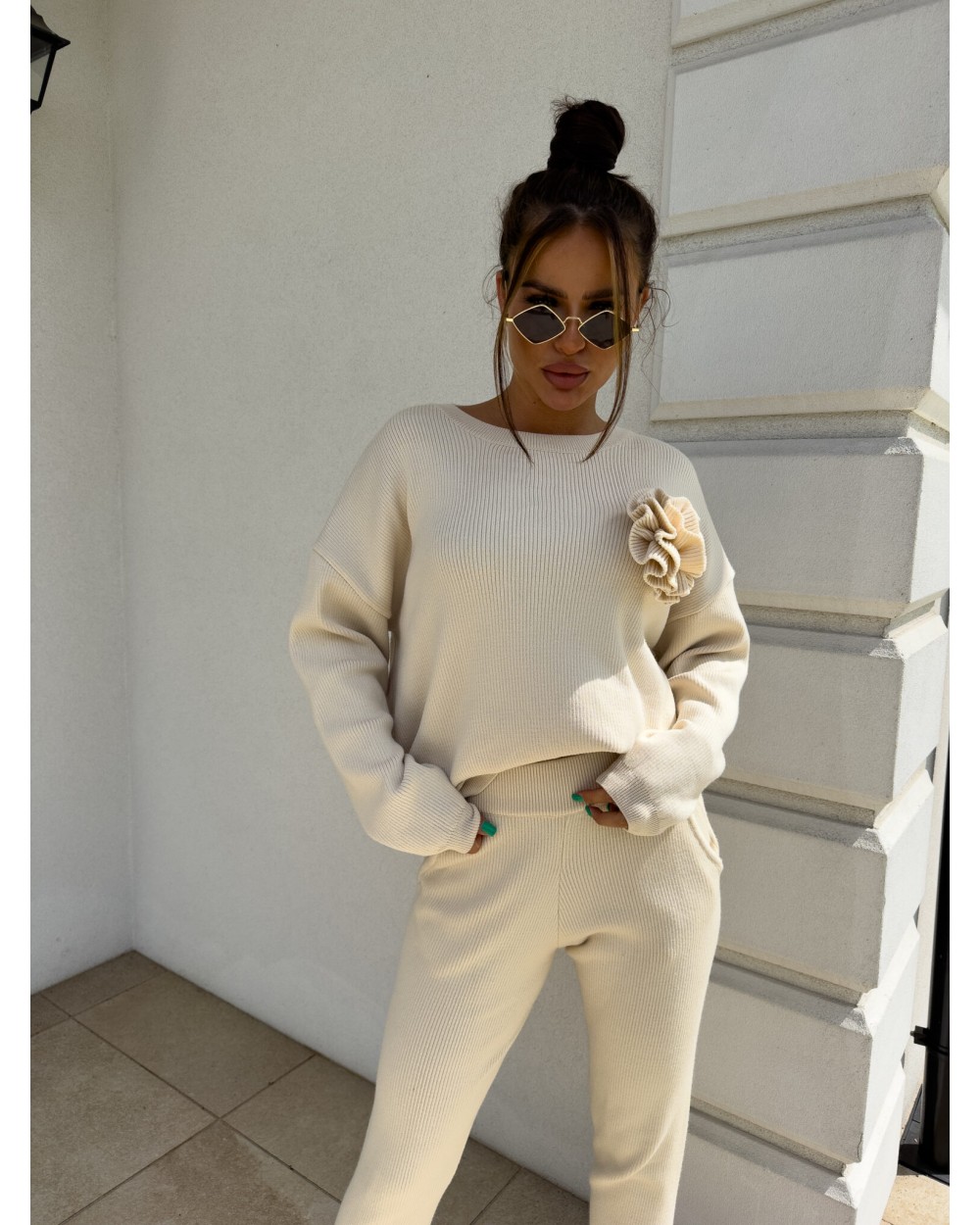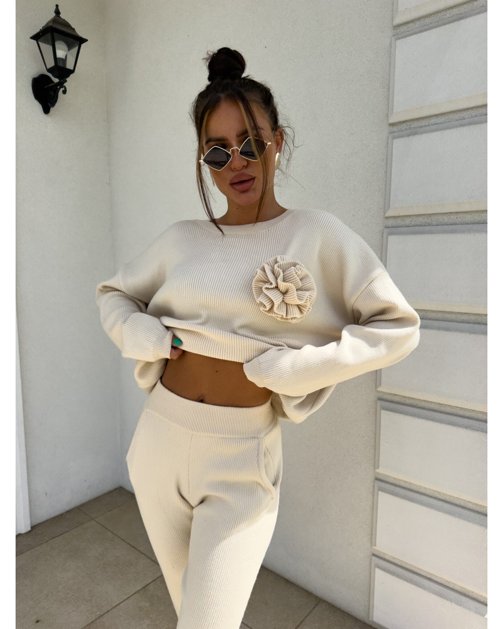 Komplet składający się z bluzy sweterkowe z długim rękawem oraz długich spodni z gumką w pasie. Kwiat jest odpinany.