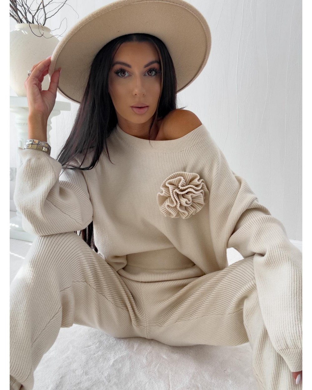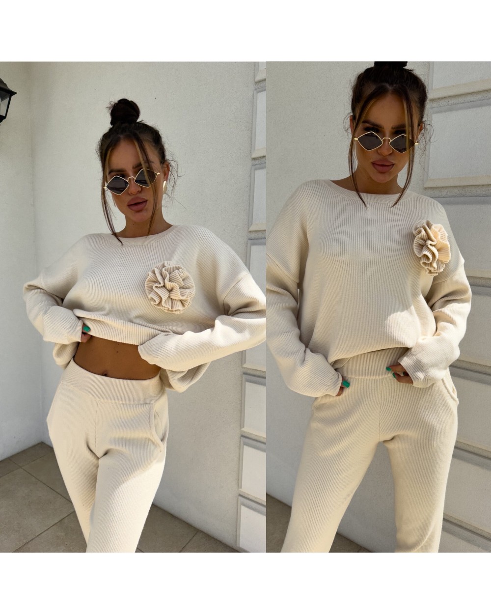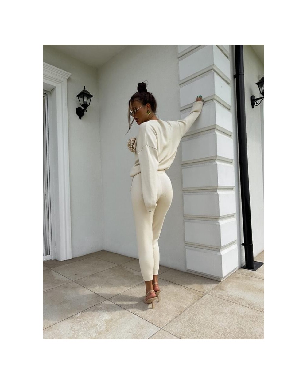 Komplet składający się z bluzy sweterkowe z długim rękawem oraz długich spodni z gumką w pasie. Kwiat jest odpinany.