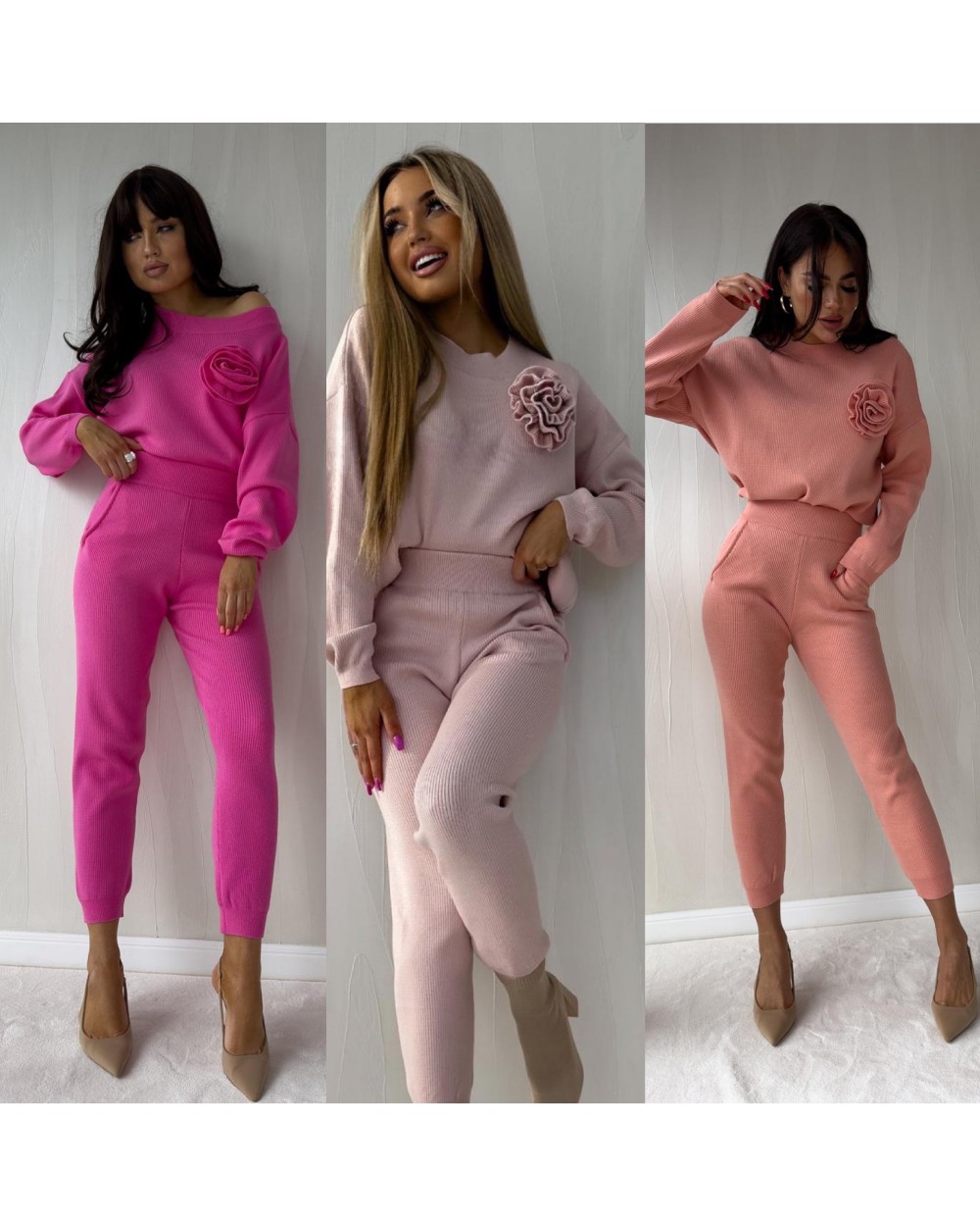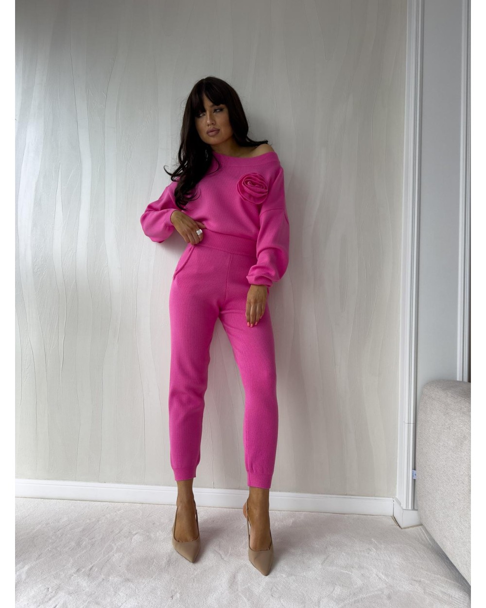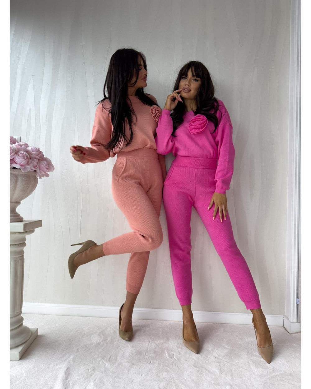 Komplet składający się z bluzy sweterkowe z długim rękawem oraz długich spodni z gumką w pasie. Kwiat jest odpinany.