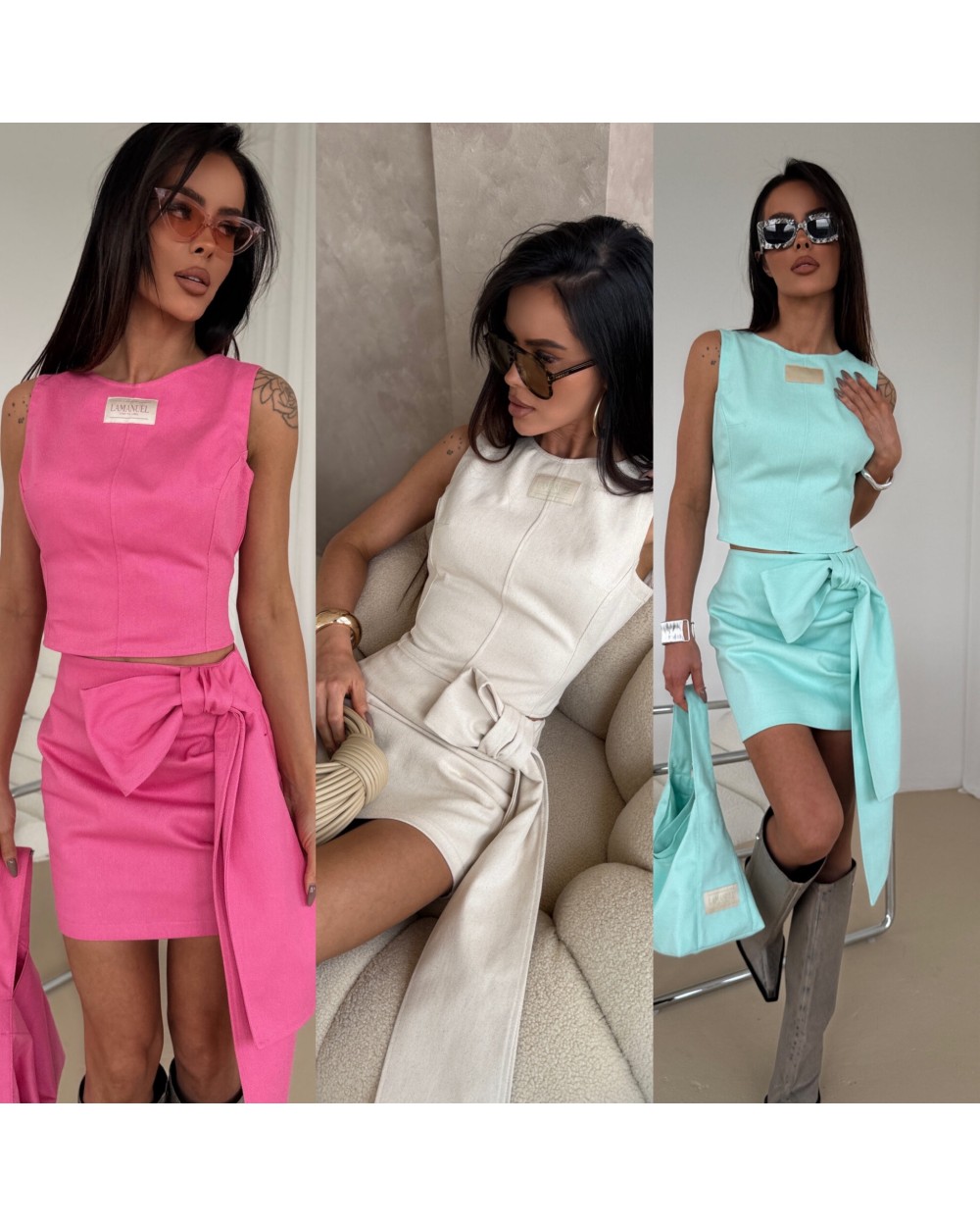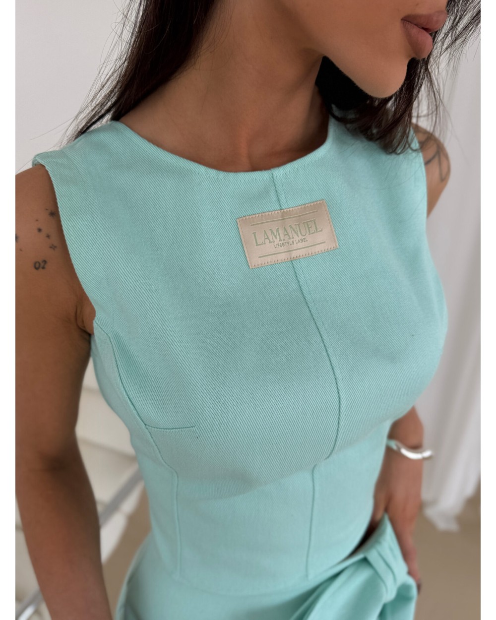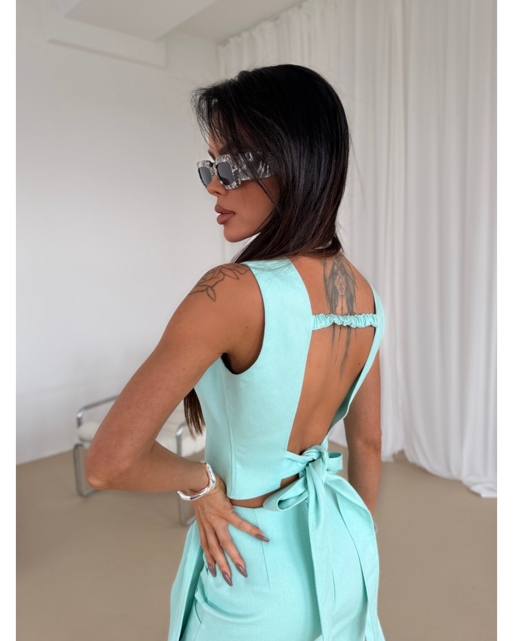 Top wykonany z denimu o wyjątkowej strukturze, z charakterystycznym wiązaniem na plecach, które nadaje mu oryginalny wygląd. Regulacja na plecach pozwala na idealne dopasowanie do sylwetki, a elastyczna wstawka zapewnia komfort noszenia. Klasyczny krój podkreśla talię i pięknie eksponuje plecy. Na przodzie naszyta subtelna metka z logo. Idealnie komponuje się z denimową spódnicą, tworząc efektowny komplet oraz torbą do kompletu.