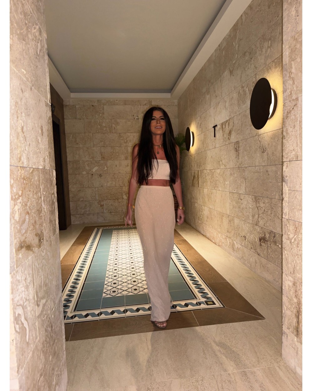 Komplet top typu opaska oraz spódnica maxi z rozcięciem to elegancka i modna propozycja, idealna na wieczorne wyjścia lub specjalne okazje. Top ma wygodną formę opaski, zakończoną gumką, co zapewnia komfort noszenia i doskonale dopasowuje się do sylwetki. Spódnica maxi z wysokim stanem posiada efektowne rozcięcie, które dodaje całości zmysłowego charakteru, a gumka w pasie gwarantuje wygodę i idealne dopasowanie. Całość wykonana z materiału brokatowego, który tworzy efektowny look, przyciągając wzrok i nadając stylizacji elegancki i błyszczący akcent.