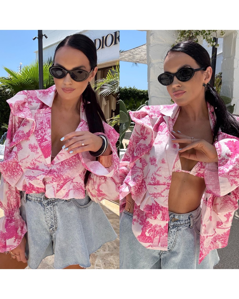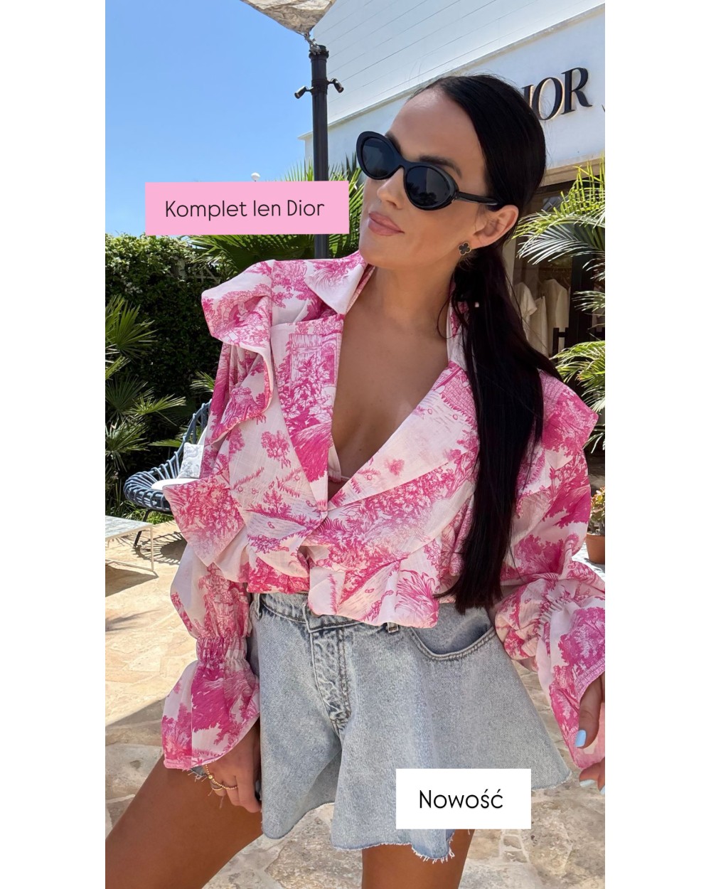 Lniany komplet składający się z marynarki i spódniczko spodenek. Marynarka zapinana na guzik, obowiązkowo wszyte poduszki w ramionach. Spódniczko spodenki posiadają wszytą szeroką gumę w pasie.  Materiał bardzo przewiewny, nieprześwitujący.