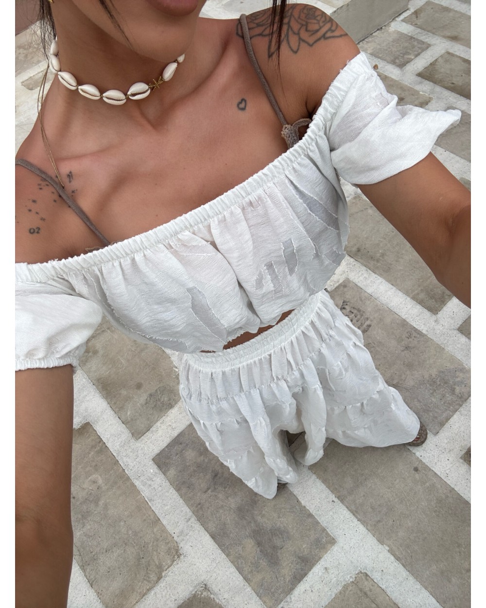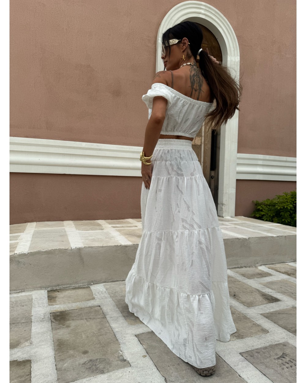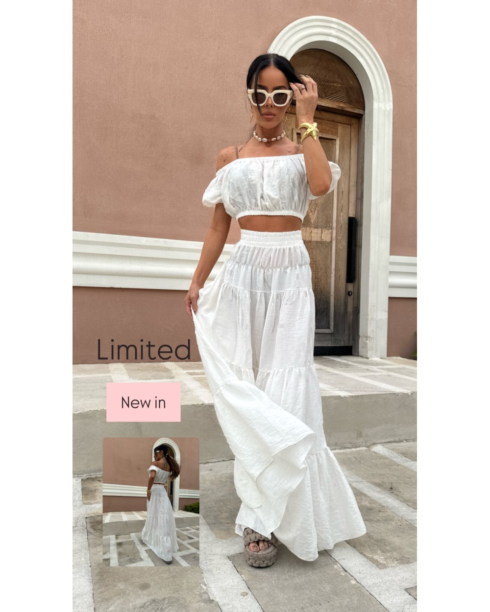 Komplet składa się z krótkiego topu z odkrytymi ramionami i marszczeniem oraz długiej, zwiewnej spódnicy w tym samym stylu, wykonany jest z lekkiego, półtransparentnego materiału z delikatnym połyskiem i subtelnym, wytłaczanym wzorem dodającym elegancji i letniego luzu, całość idealnie wpisuje się w klimat resortowy dzięki jasnej kolorystyce i kobiecej formie która pięknie układa się w ruchu i zapewnia komfort nawet w upalne dni.