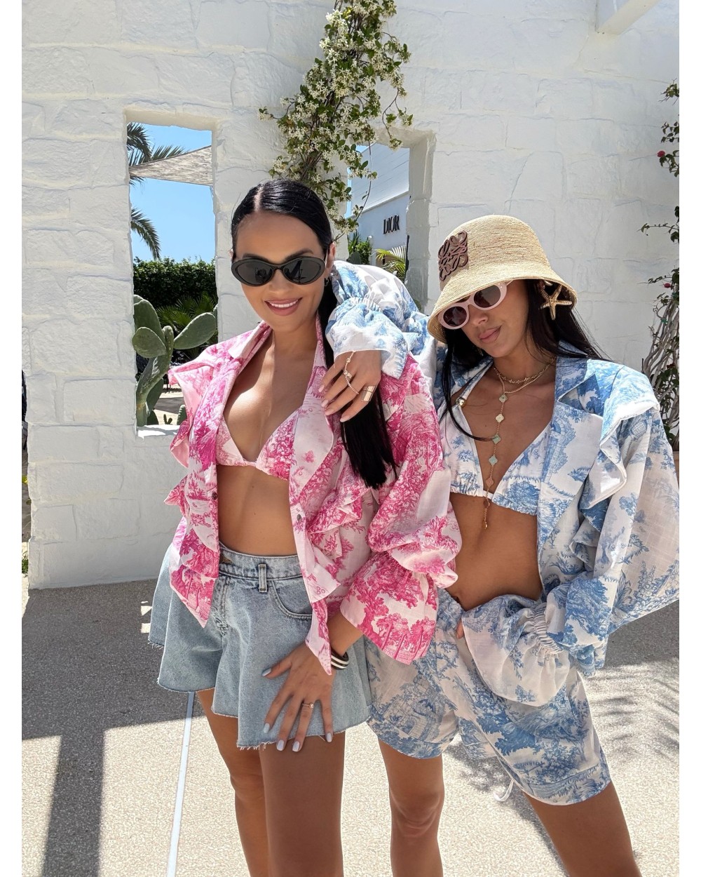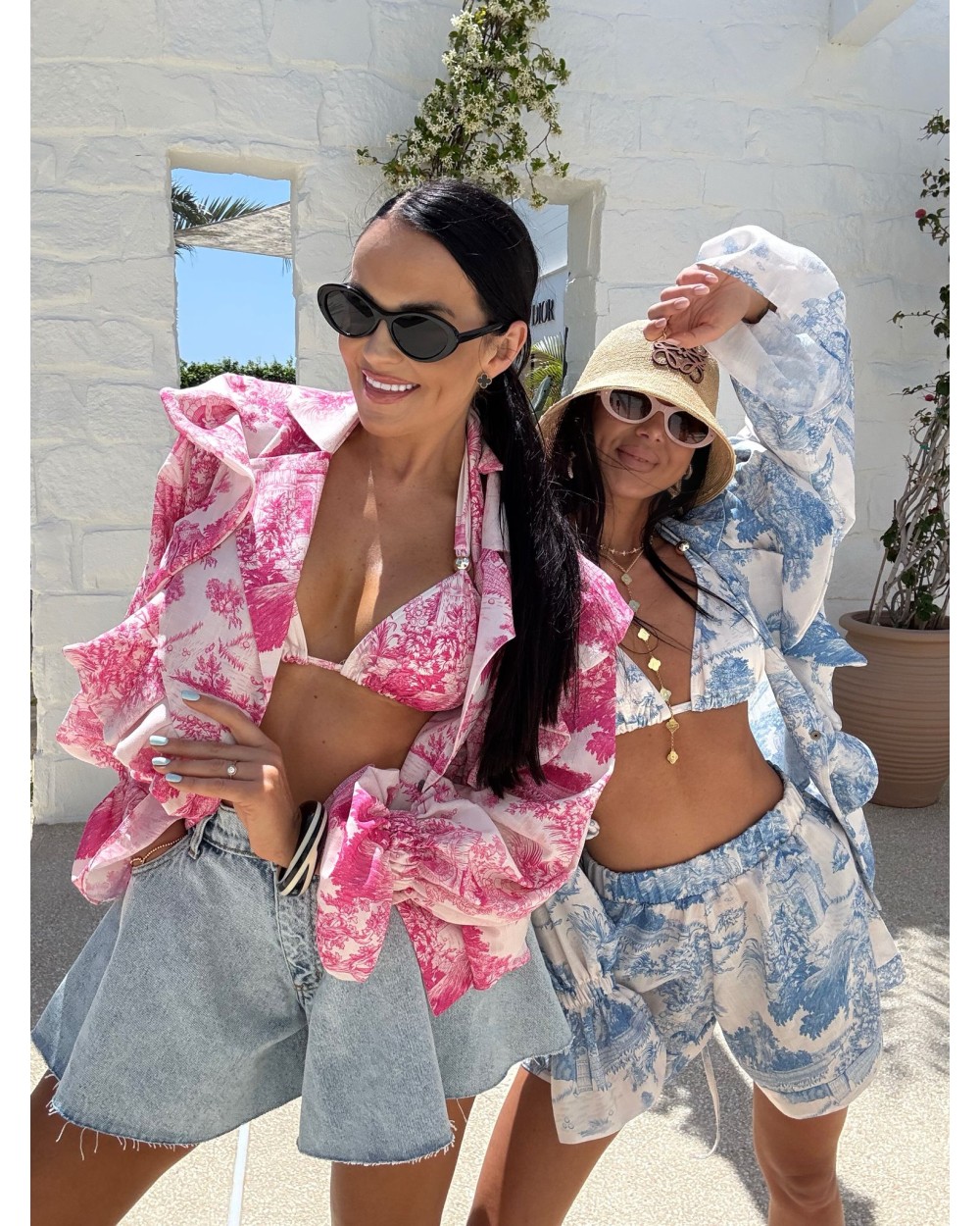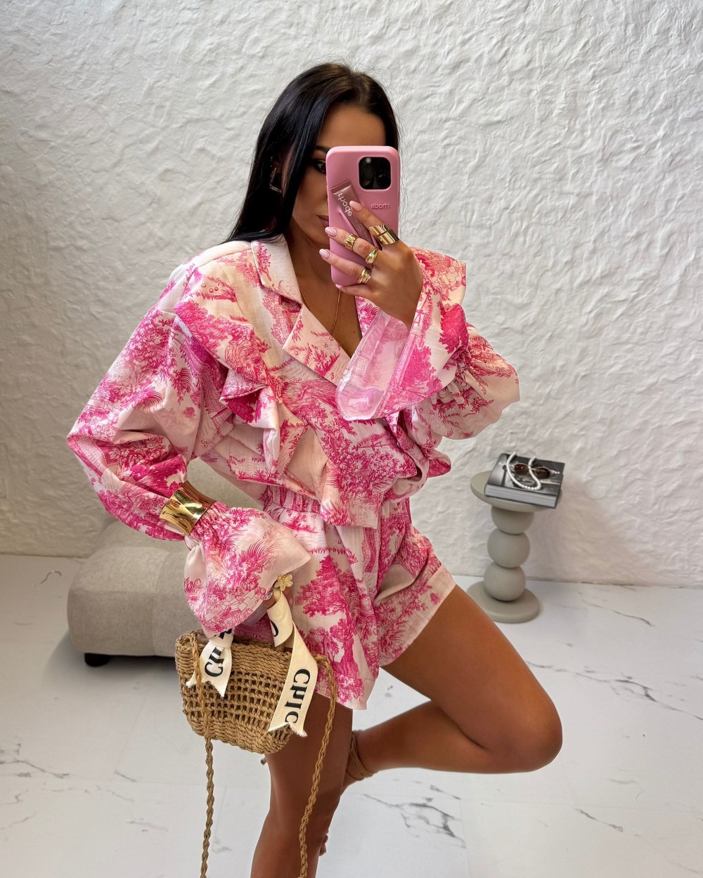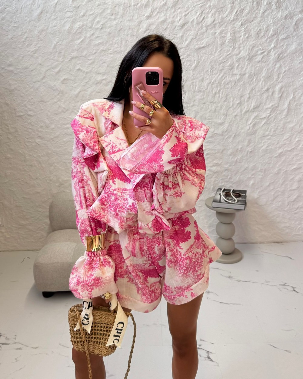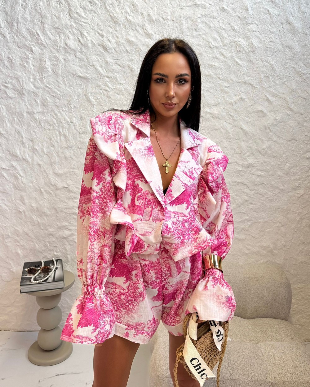 Lniany komplet składający się z marynarki i spódniczko spodenek. Marynarka zapinana na guzik, obowiązkowo wszyte poduszki w ramionach. Spódniczko spodenki posiadają wszytą szeroką gumę w pasie.  Materiał bardzo przewiewny, nieprześwitujący.