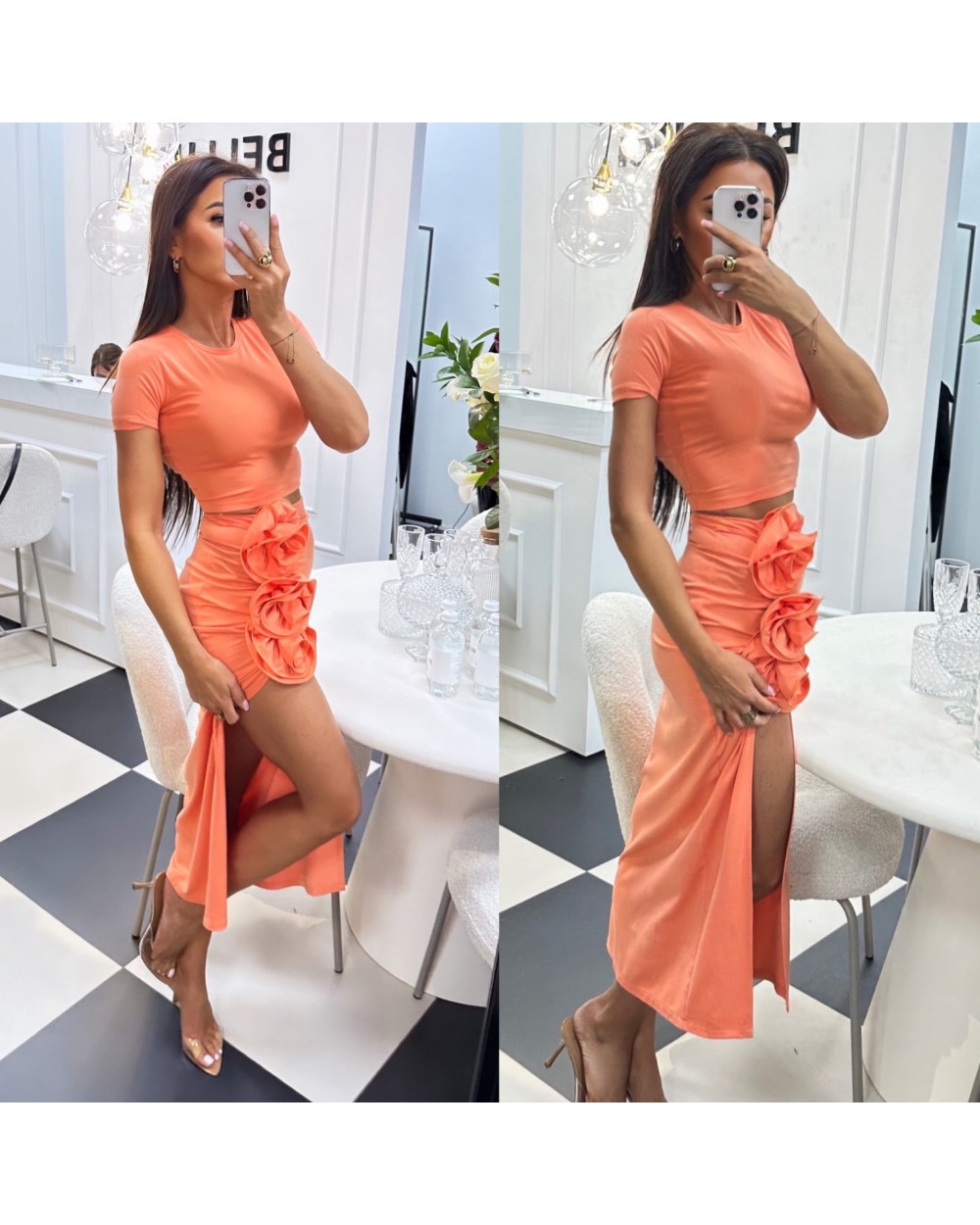 Połączenie t-shirta oraz spódnicy o dopasowanym kroju. Zdobienie w postaci materiałowych aplikacji. Róże są odpinane.