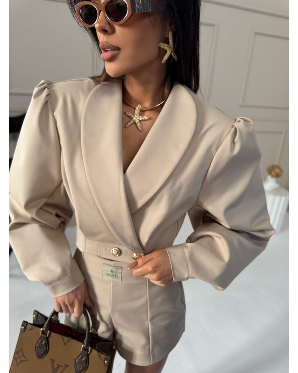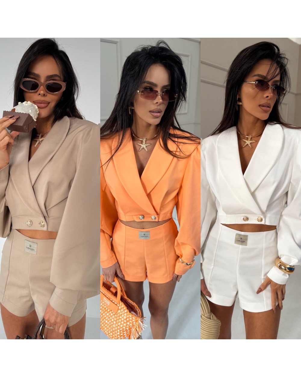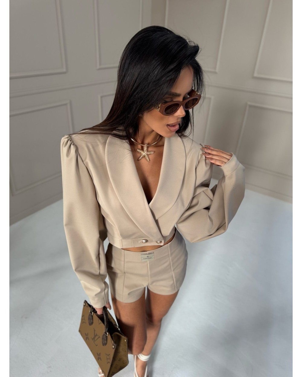 Te spodenki mają elegancki, dopasowany krój, który podkreśla sylwetkę. Są wykonane z gładkiego materiału o wysokiej jakości, co nadaje im luksusowego wyglądu. Posiadają wysoki stan, który podkreśla talię, oraz starannie wykonane przeszycia, nadające im strukturalny charakter. Z przodu mają delikatne zaszewki, które dodają im elegancji, a z tyłu znajdują się subtelne kieszonki w formie imitacji. Z tyłu zapinane na zamek. Spodenki mają lekko rozszerzane nogawki, co zapewnia komfort noszenia i elegancki wygląd. Ich minimalistyczny design sprawia, że świetnie komponują się z różnymi stylizacjami.