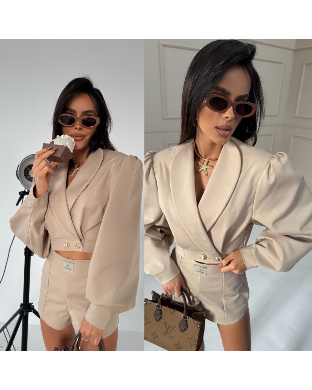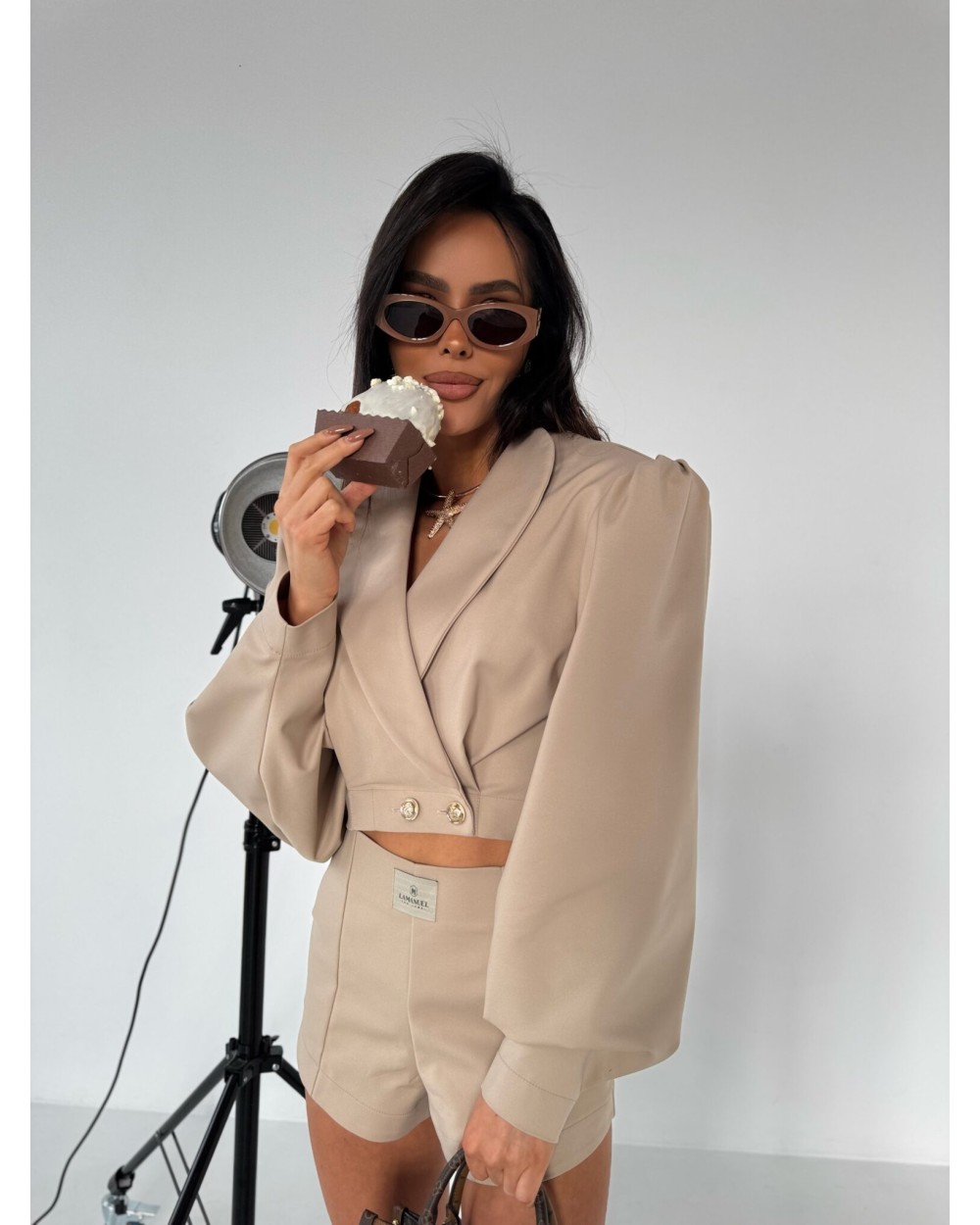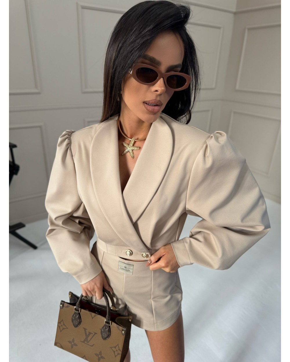 Te spodenki mają elegancki, dopasowany krój, który podkreśla sylwetkę. Są wykonane z gładkiego materiału o wysokiej jakości, co nadaje im luksusowego wyglądu. Posiadają wysoki stan, który podkreśla talię, oraz starannie wykonane przeszycia, nadające im strukturalny charakter. Z przodu mają delikatne zaszewki, które dodają im elegancji, a z tyłu znajdują się subtelne kieszonki w formie imitacji. Z tyłu zapinane na zamek. Spodenki mają lekko rozszerzane nogawki, co zapewnia komfort noszenia i elegancki wygląd. Ich minimalistyczny design sprawia, że świetnie komponują się z różnymi stylizacjami.