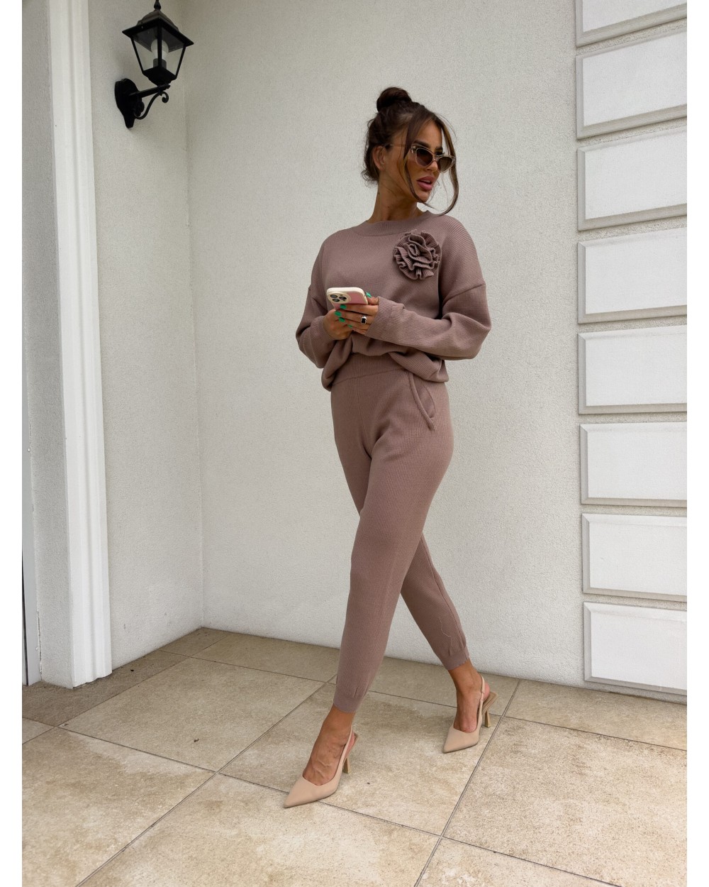 Komplet składający się z bluzy sweterkowe z długim rękawem oraz długich spodni z gumką w pasie. Kwiat jest odpinany.