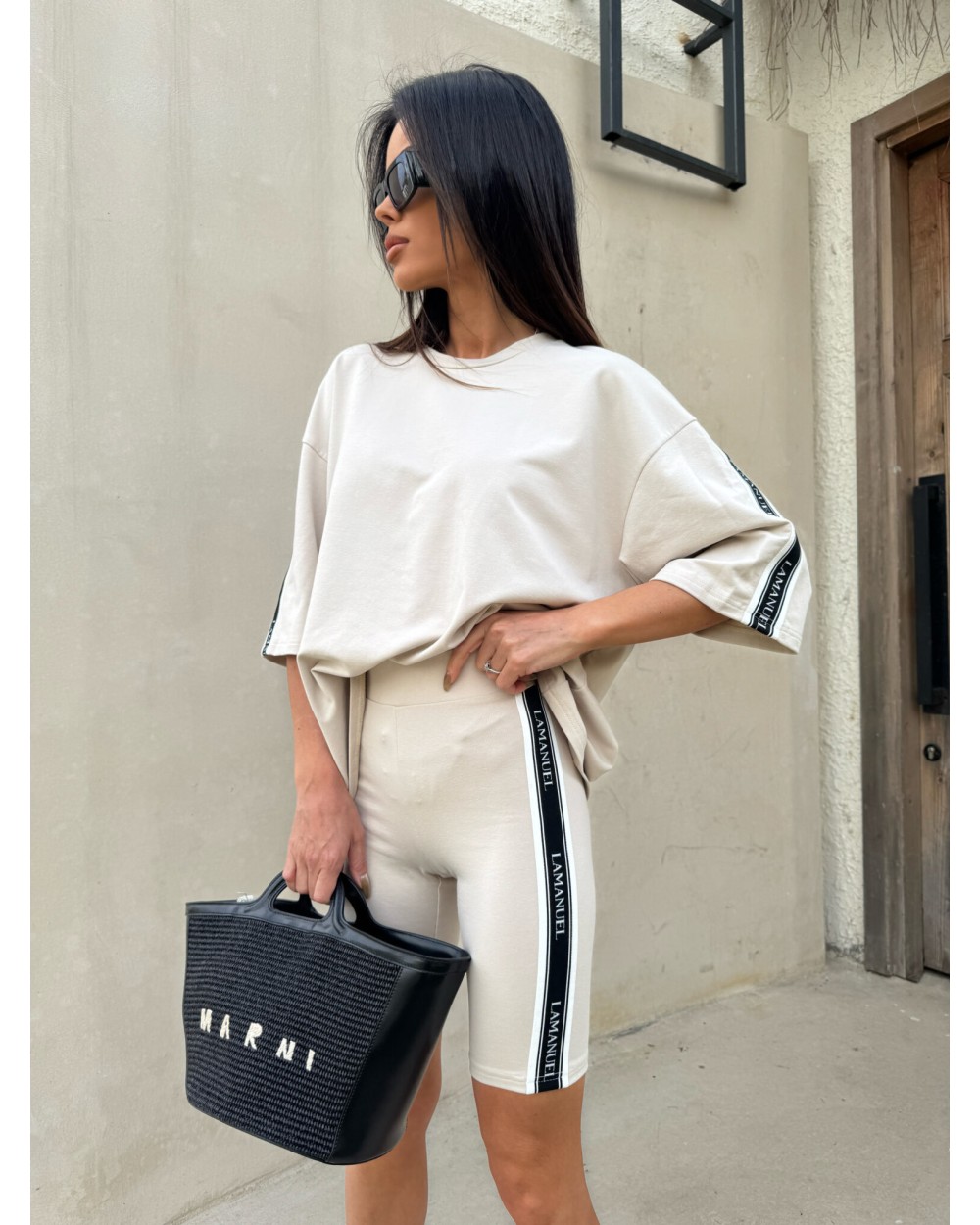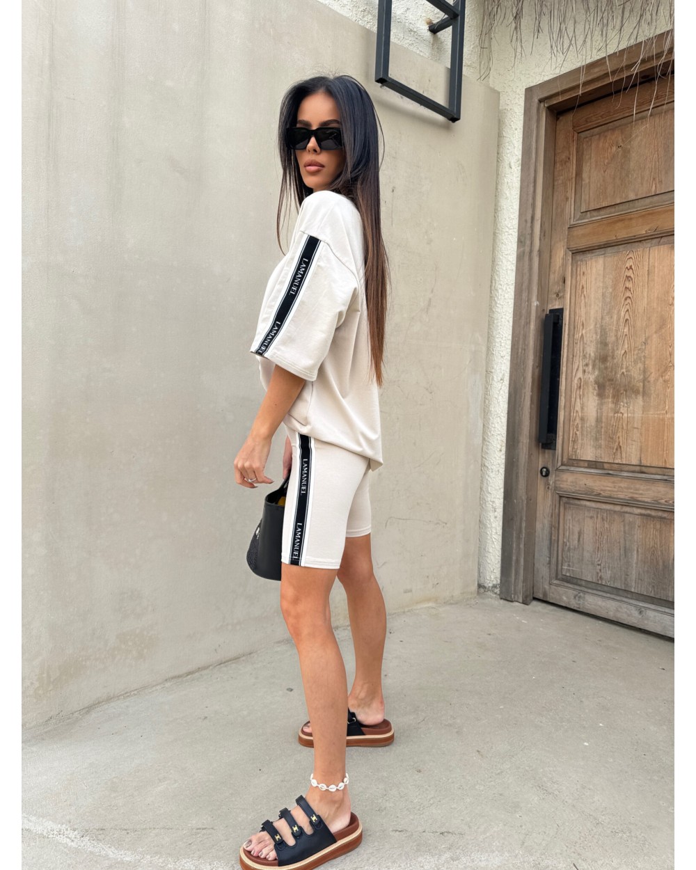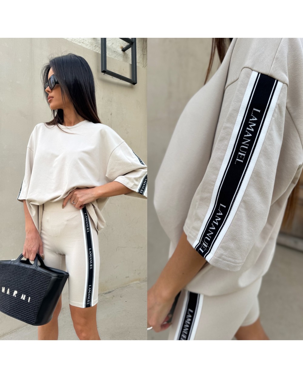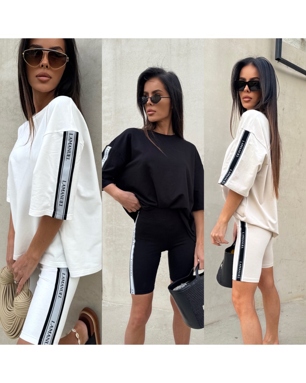Kolarki z elastycznej, miękkiej bawełny o dopasowanym kroju, idealnie przylegające do sylwetki. Model wyposażony w szeroką, komfortową gumę w pasie, zapewniającą dobre podtrzymanie i wygodę noszenia. Po bokach nogawek wszyto taśmy z logotypem LAMANUEL, które nadają całości sportowego, ale stylowego charakteru. Świetna baza do codziennych i aktywnych stylizacji.