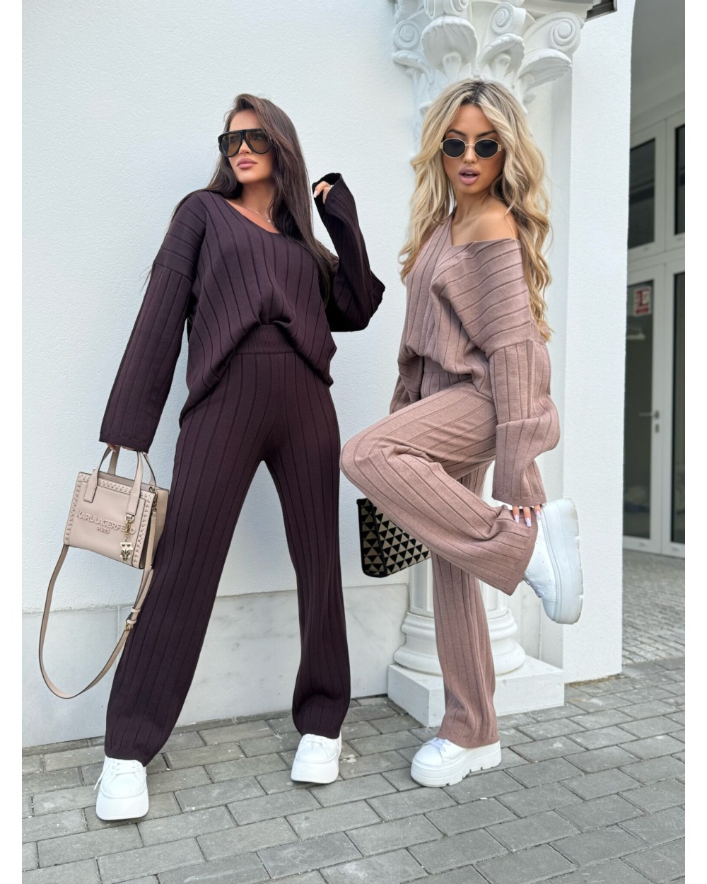 Komplet składa się z oversize’owego swetra z długimi rękawami oraz spodni z wysokim stanem, uszytych z tej samej, przyjemnej w dotyku dzianiny. Sweter zakładany przez głowę, z dekoltem w serek, zdobią ozdobne pionowe przeszycia, które optycznie wydłużają sylwetkę i dodają całości subtelnej elegancji. Szerokie nogawki spodni oraz ich pionowy wzór doskonale współgrają z górą, tworząc spójną, harmonijną stylizację idealną zarówno na co dzień, jak i na bardziej casualowe wyjścia.