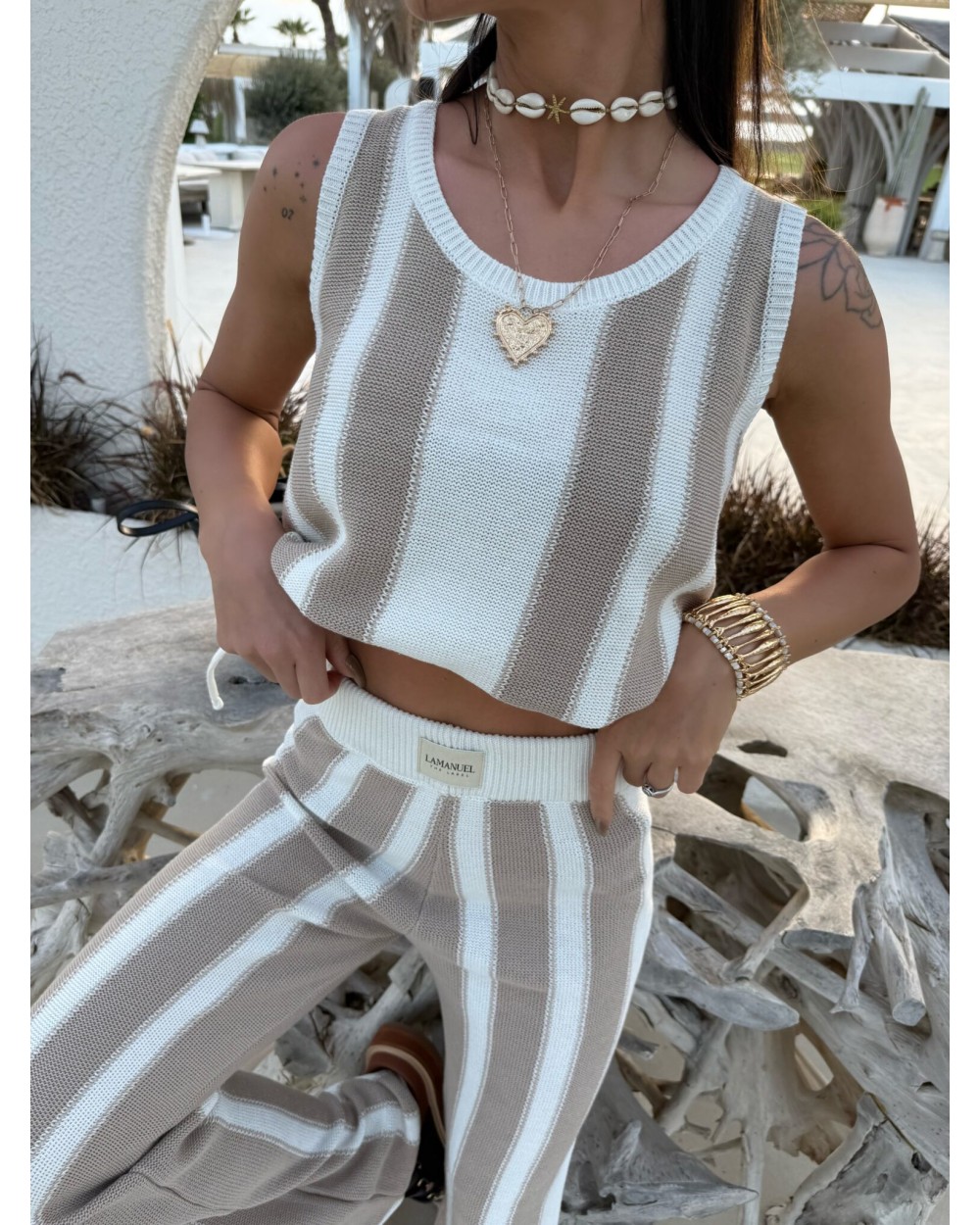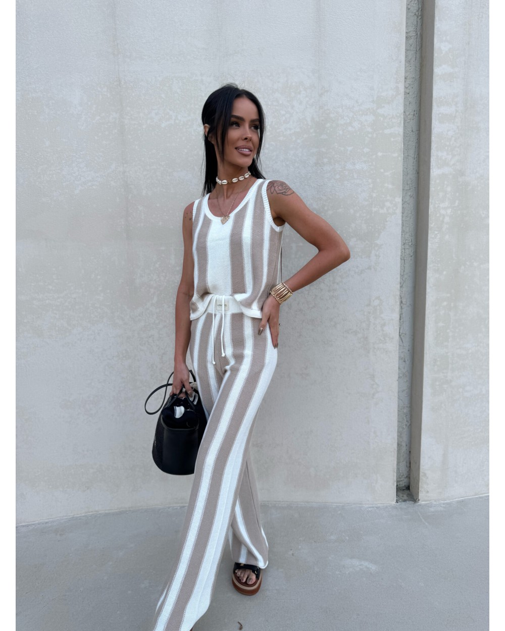 Komplet dzianinowy składający się z topu bez rękawów i spodni z długą nogawką to połączenie casualowego luzu z kobiecą sylwetką, dzięki pionowym pasom całość optycznie wysmukla i wydłuża nogi, a elastyczna talia z wiązaniem podkreśla talię i zapewnia komfort noszenia, luźny fason topu nadaje lekkości stylizacji i pozwala na swobodę ruchów, komplet świetnie sprawdzi się zarówno w nadmorskim kurorcie jak i w miejskim klimacie