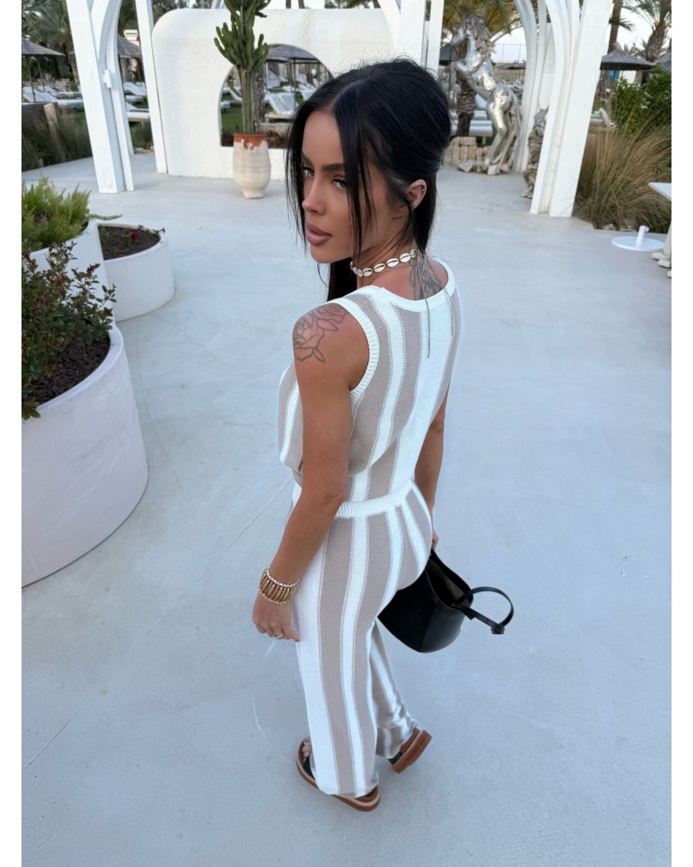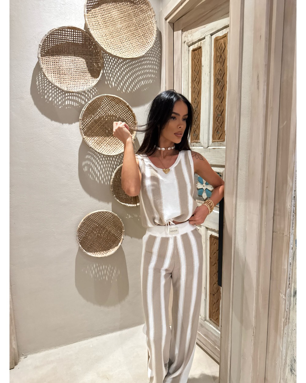 Komplet dzianinowy składający się z topu bez rękawów i spodni z długą nogawką to połączenie casualowego luzu z kobiecą sylwetką, dzięki pionowym pasom całość optycznie wysmukla i wydłuża nogi, a elastyczna talia z wiązaniem podkreśla talię i zapewnia komfort noszenia, luźny fason topu nadaje lekkości stylizacji i pozwala na swobodę ruchów, komplet świetnie sprawdzi się zarówno w nadmorskim kurorcie jak i w miejskim klimacie