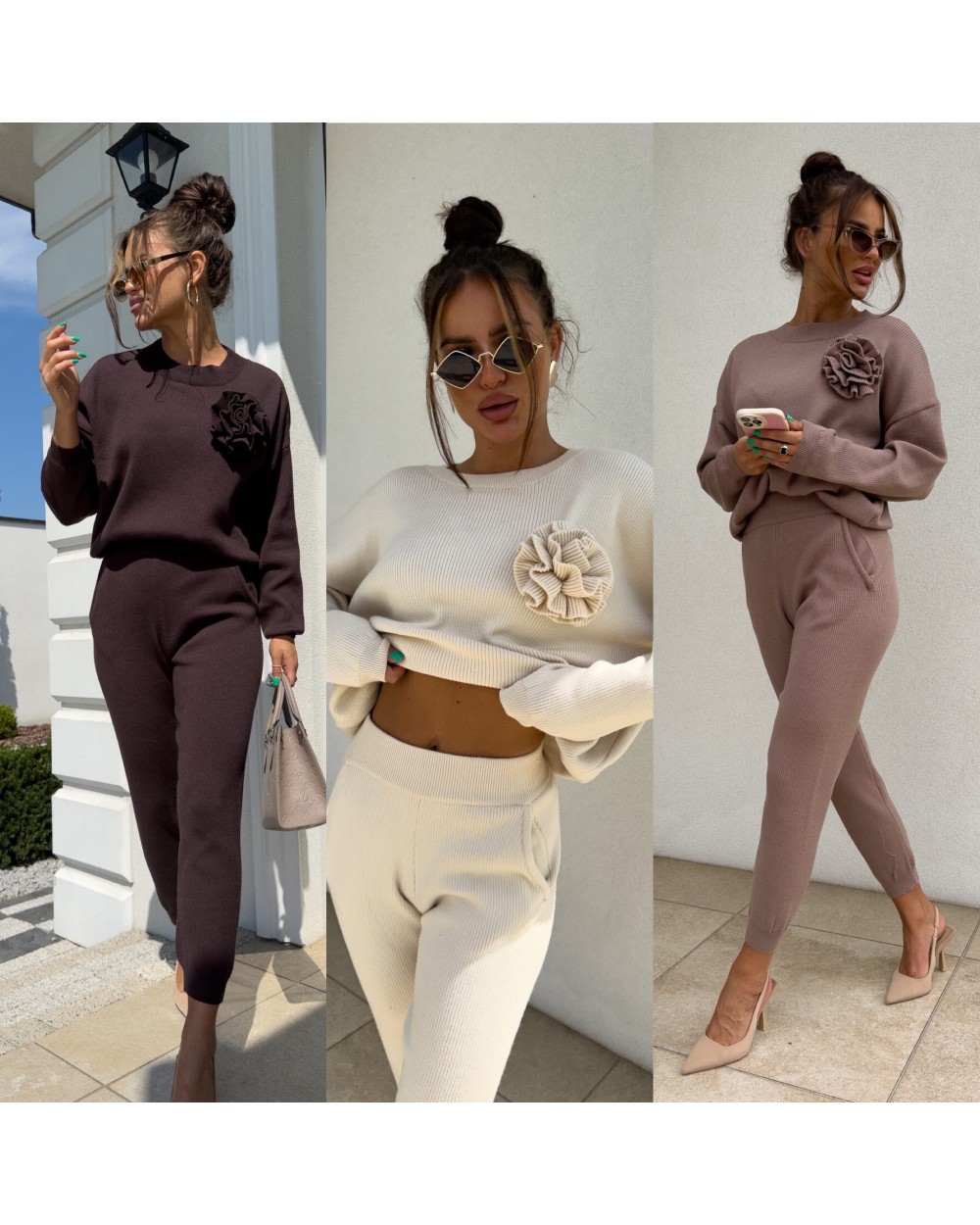 Komplet składający się z bluzy sweterkowe z długim rękawem oraz długich spodni z gumką w pasie. Kwiat jest odpinany.