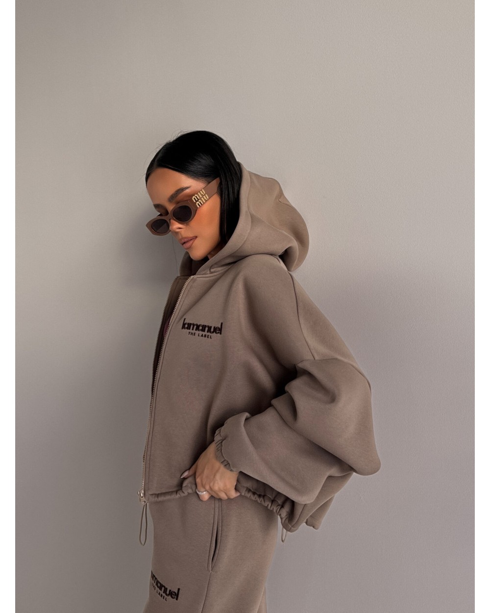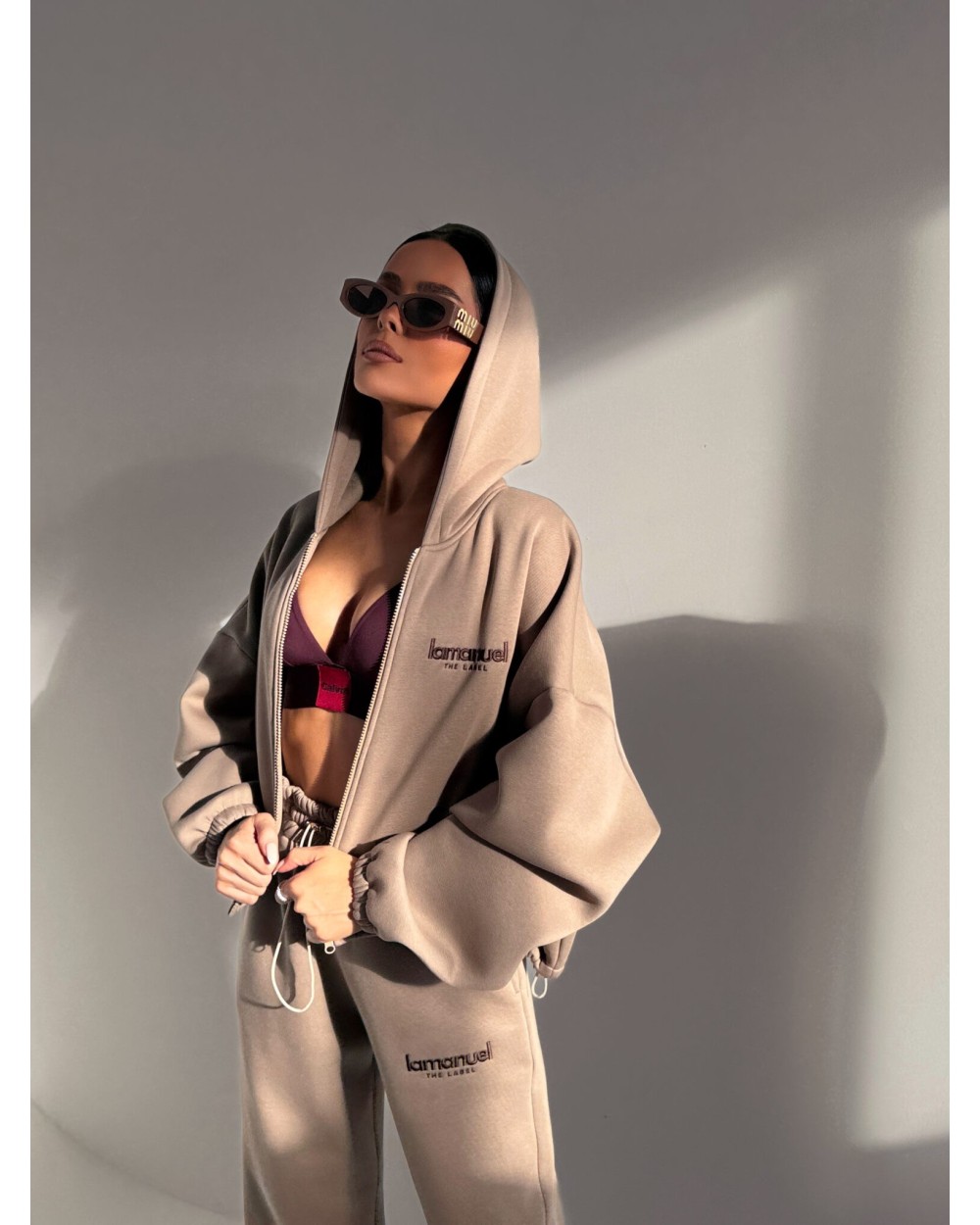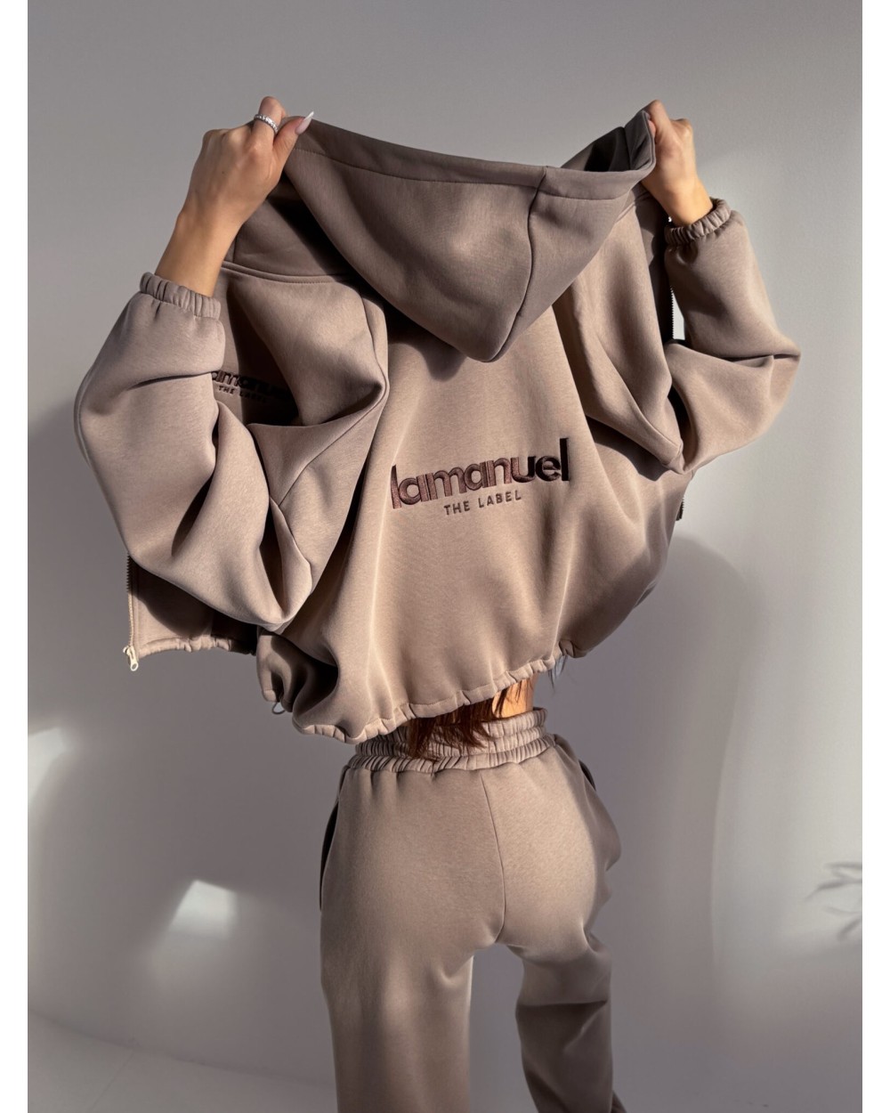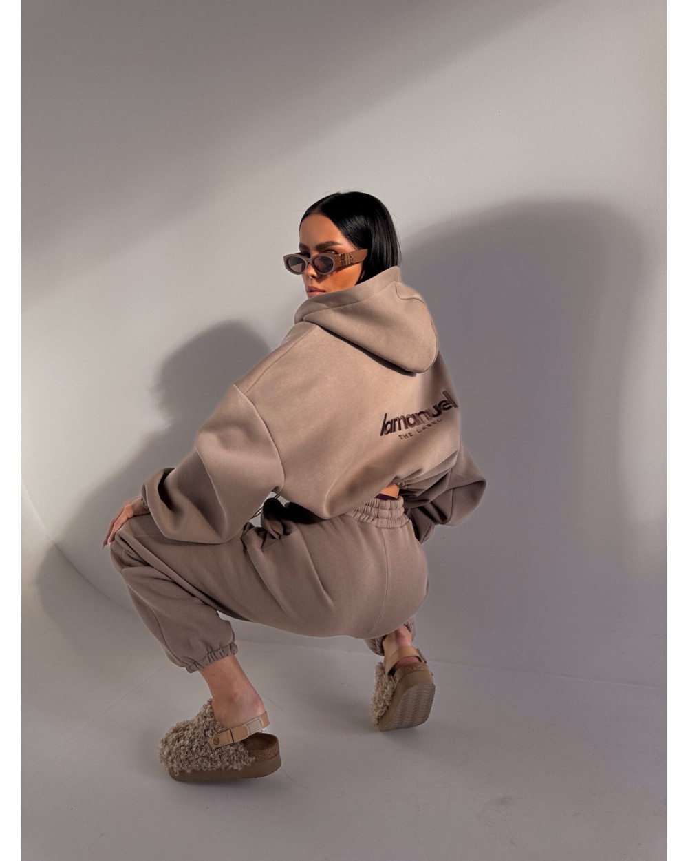 Oversize’owe spodnie z dzianiny drapanej to totalny chill level pro – grubszy materiał od środka to miękki „misiek”, który otula jak kocyk, ale nie wygląda jak piżama tylko jak dobrze przemyślany street look, mają wysoką talię z elastycznym pasem, luźną nogawkę i logo LAMANUEL, które robi robotę i daje ten detal, który od razu mówi: to nie są zwykłe dresy, to dresy z charakterem.