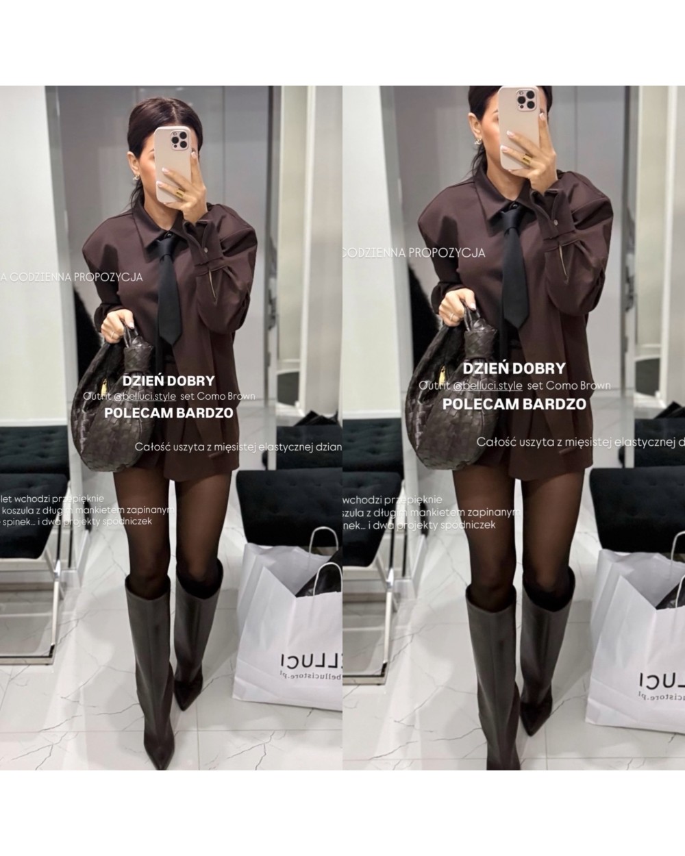 Czekoladowy komplet koszula z wysokim mankietem+spódniczka drapowana mini FOLLY to połączenie kobiecości, klasy i modnego charakteru. Składa się z eleganckiej koszuli z wysokim mankietem oraz dopasowanej mini spódniczki z efektownym drapowaniem, które podkreśla sylwetkę i dodaje jej lekkości. Koszula wykonana z przyjemnego, delikatnie połyskującego materiału pięknie układa się na ciele i nadaje stylizacji szykownego wyglądu. Wysokie mankiety i subtelny kołnierzyk dodają całości elegancji, a dopasowana spódniczka mini tworzy z nią zestaw idealny na wieczorne wyjścia, spotkania lub wyjątkowe okazje.