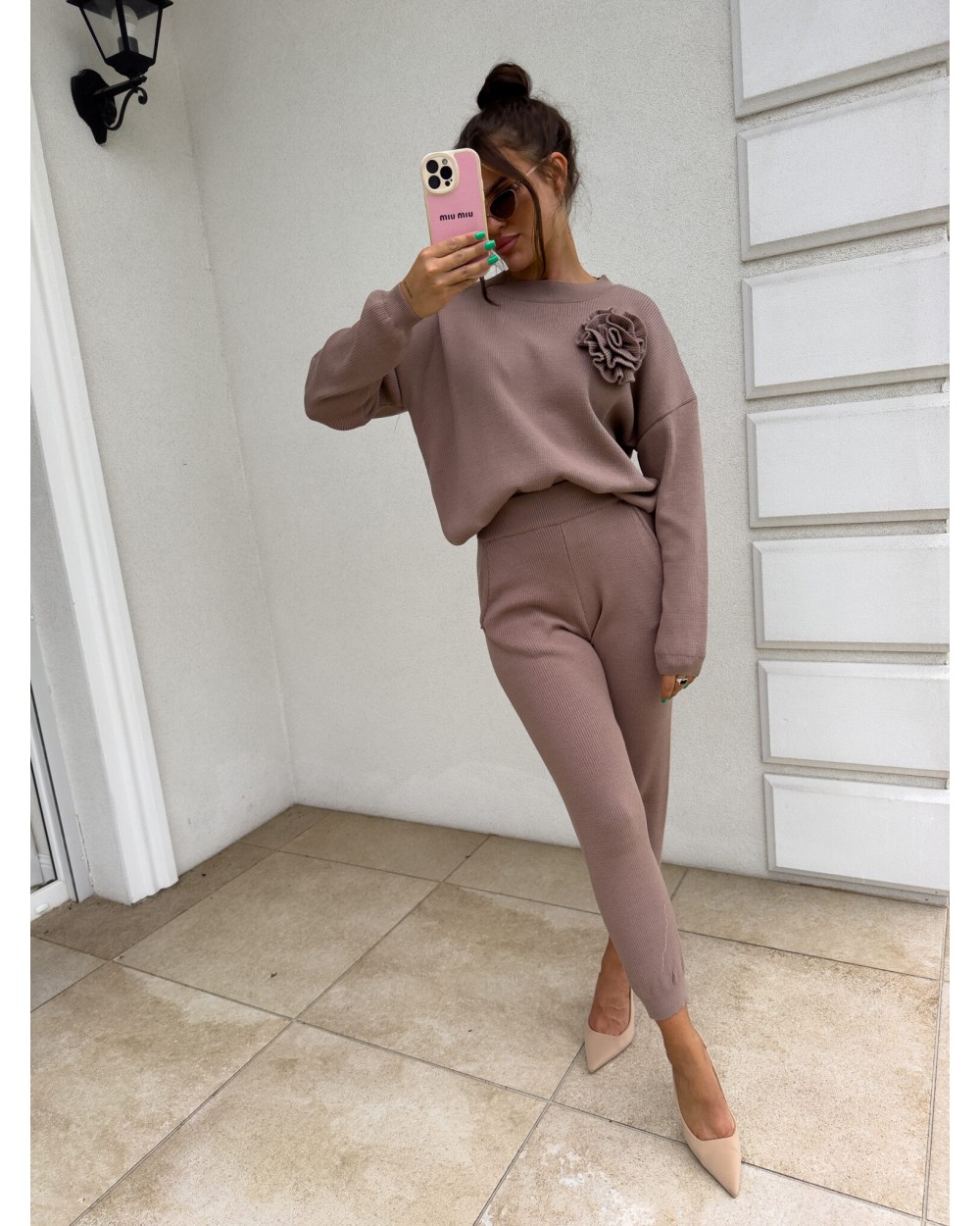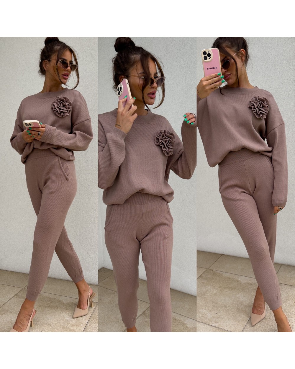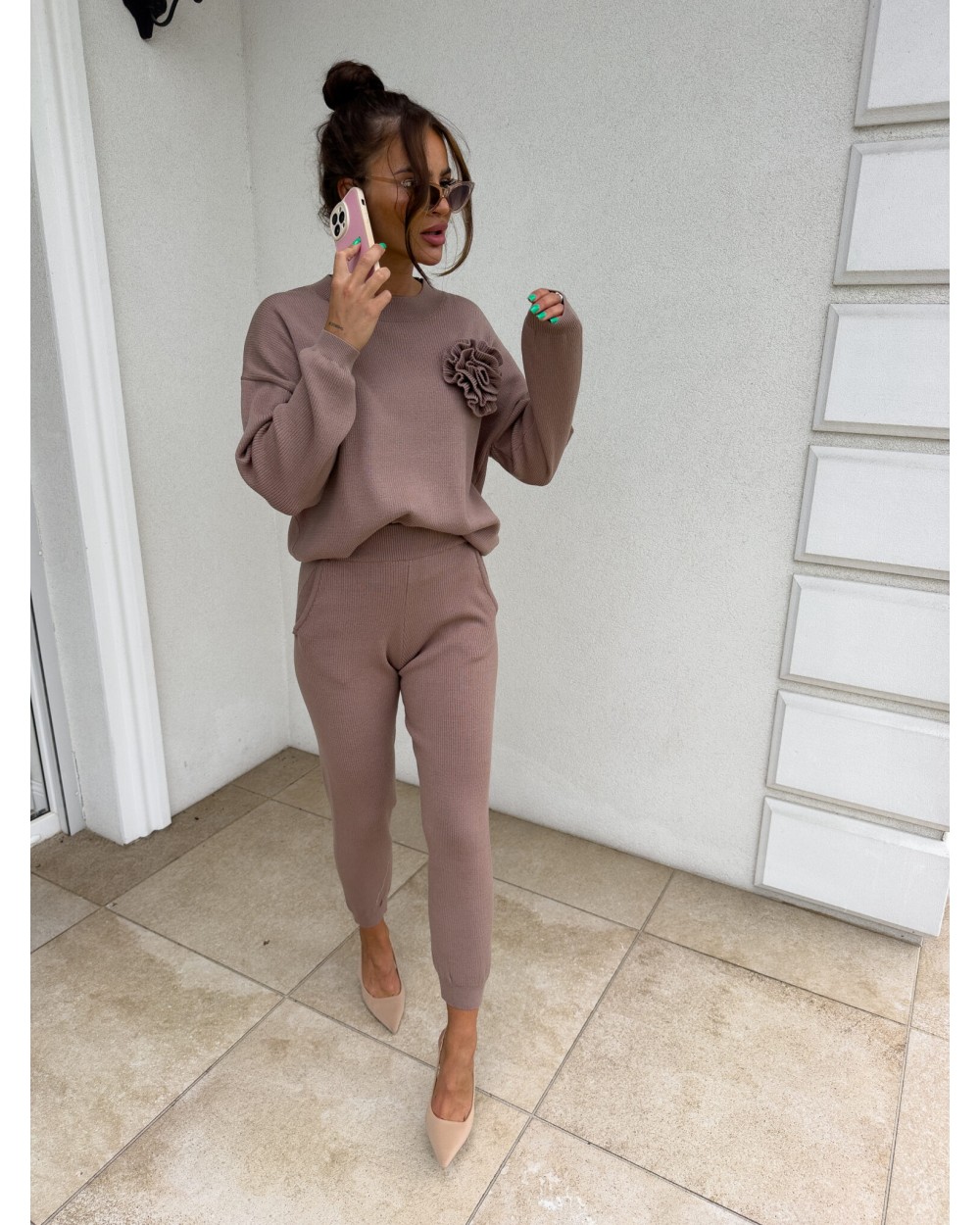 Komplet składający się z bluzy sweterkowe z długim rękawem oraz długich spodni z gumką w pasie. Kwiat jest odpinany.