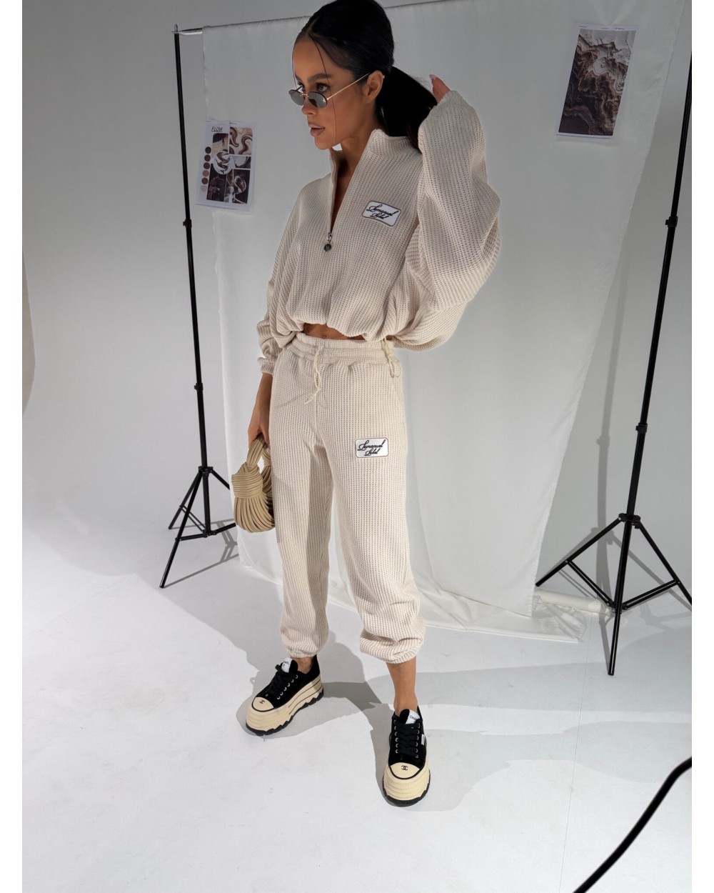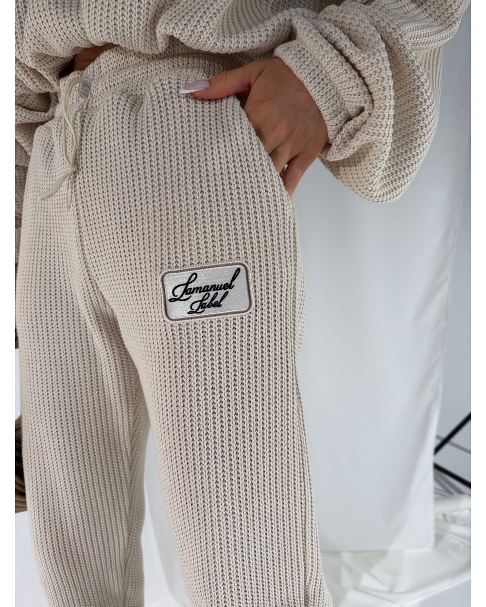 Swobodne spodnie o wyraźnej strukturze, która sama w sobie robi robotę. Mięsisty materiał w grubym splocie przyjemnie otula ciało i dobrze układa się w ruchu. Pas z elastycznym wykończeniem i bawełnianym sznurkiem do regulacji. Nogawka lekko zwężana, z luźnym wykończeniem – nie ma ściągacza, ale materiał naturalnie układa się przy kostce. Naszywka z haftem nadaje całości sportowego charakteru, ale spokojnie można je nosić też w bardziej modowych stylizacjach. Styl na totalnym luzie, ale z przemyślanym detalem.