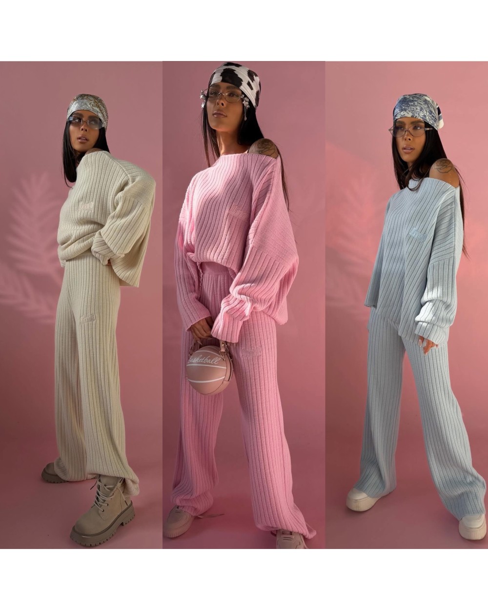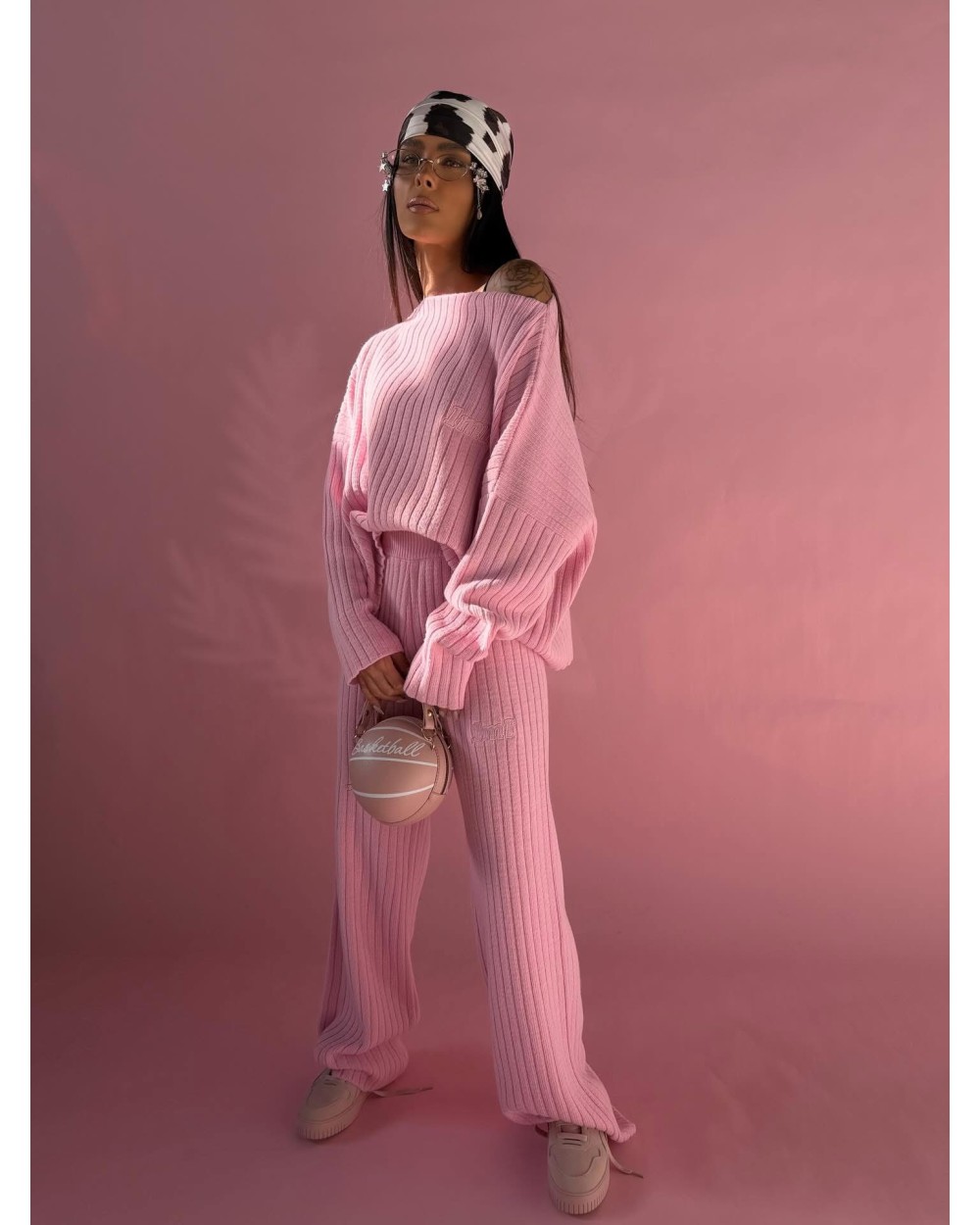 Dzianina o wyraźnym, pionowym prążku – miękka, elastyczna, dobrze układająca się w ruchu. Góra z opuszczoną linią ramion, szerokim rękawem i lekko oversize’owym krojem. Można nosić klasycznie lub opuścić na jedno ramię. Spodnie z wysokim stanem i prostą nogawką. Pas szeroki, elastyczny – bez widocznych sznurków czy zapięć. Na piersi i biodrze haftowane logo w minimalistycznym stylu. Całość tworzy sylwetkę, ale nie opina. Miękkość dzianiny + struktura prążka = zestaw, który nie wygląda jak homewear, ale nosi się jak homewear.