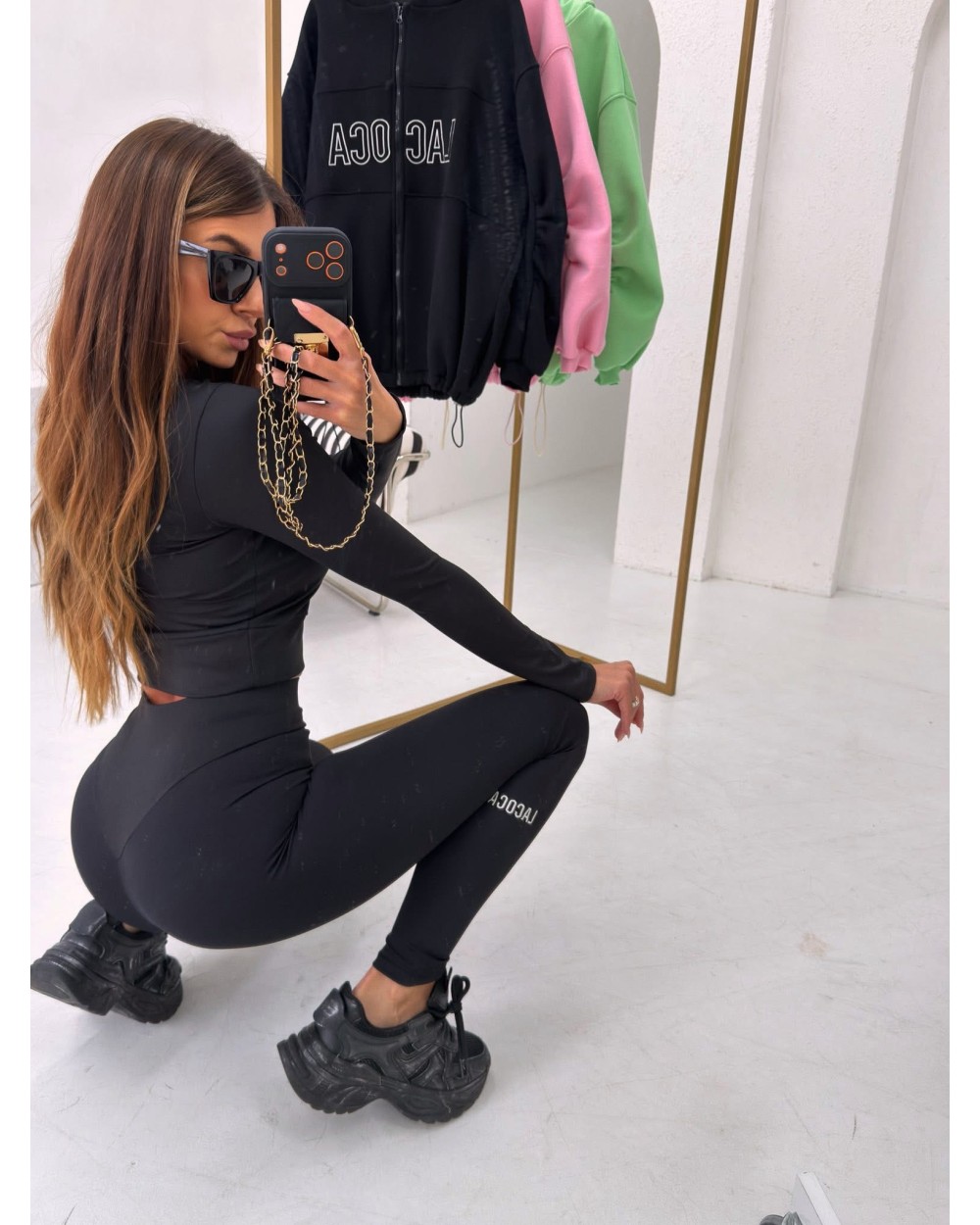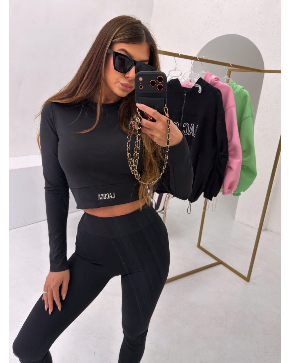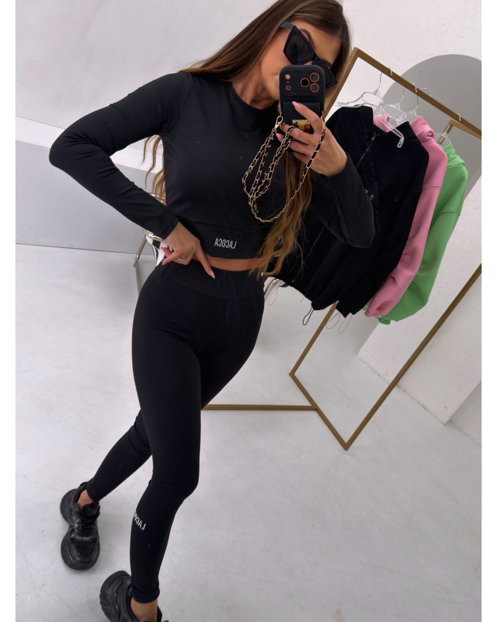 Stylowy komplet premium wykonany z wysokiej jakości lycry. Dopasowany top z długim rękawem oraz legginsy z wysokim stanem pięknie modelują sylwetkę. Legginsy posiadają karczek na pupie, podkreślający pośladki. Całość wykończona haftowanym logo na bluzce i nogawce.