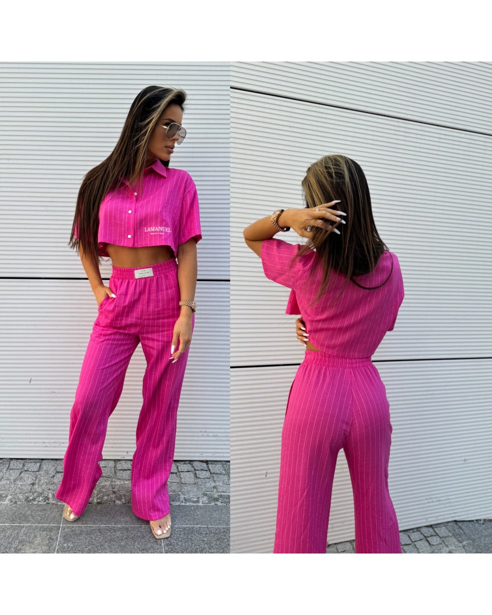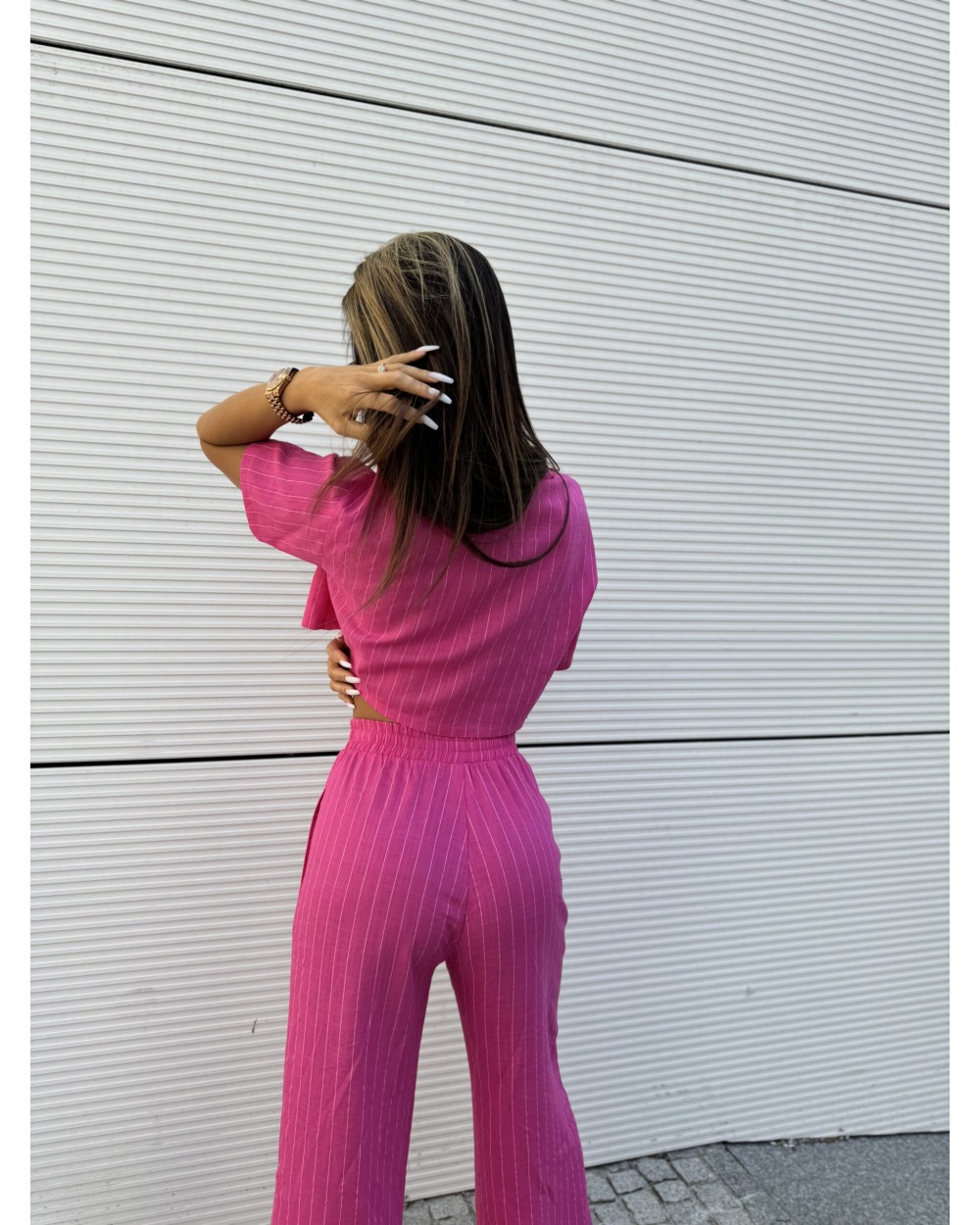 Dwuczęściowy komplet to połączenie świeżości wzoru w paski z nowoczesnym krojem, które dodają charakteru i stylu każdej kobiecej garderobie. Spodnie rozszerzane zapewniają swobodę ruchów, jednocześnie podkreślając sylwetkę, natomiast koszula crop top o krótkich rękawach dodaje lekkości i dziewczęcego uroku. Całość w paski tworzy efektowną kompozycję, która doskonale sprawdzi się zarówno na letnie wyjścia, jak i na spotkania ze znajomymi. To idealny zestaw dla kobiet ceniących sobie wygodę i modny wygląd jednocześnie.
