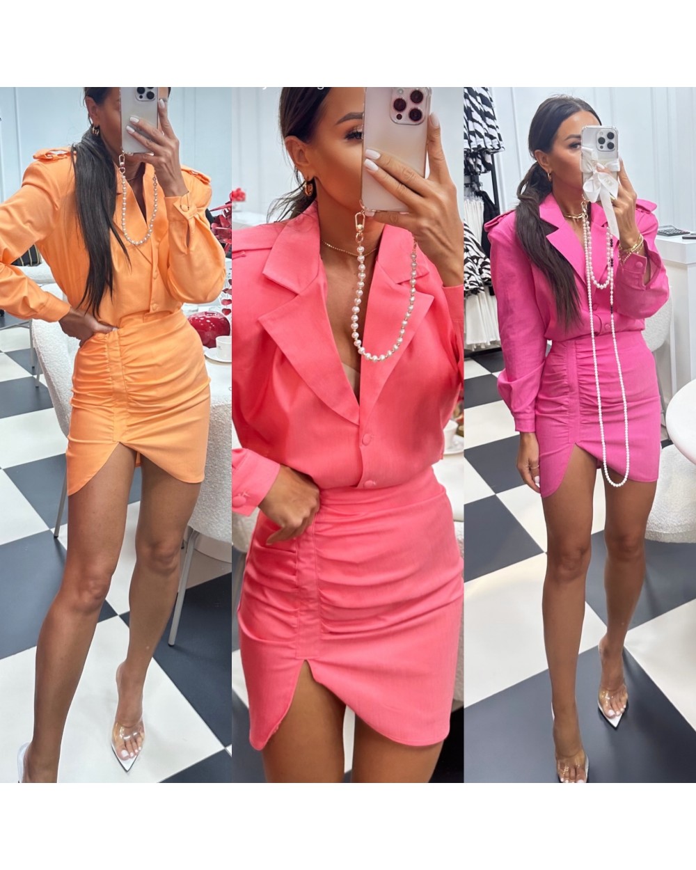 Komplet koszula i spódniczka mini z marszczeniem. Elegancki design. Marynarka posiada poduszki na ramionach.