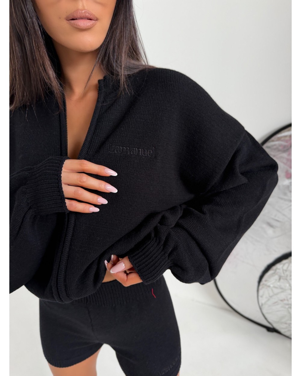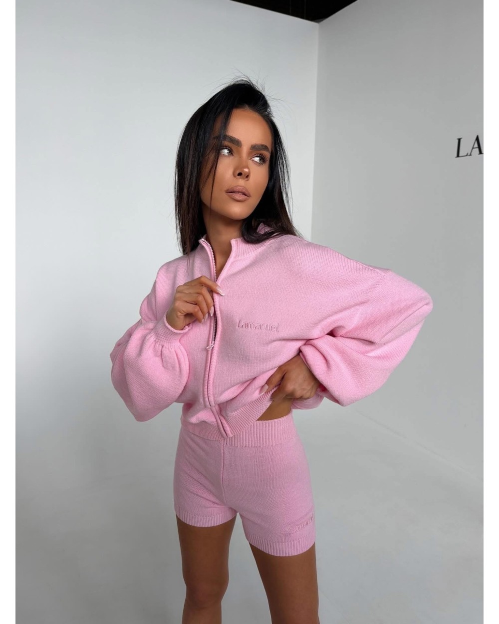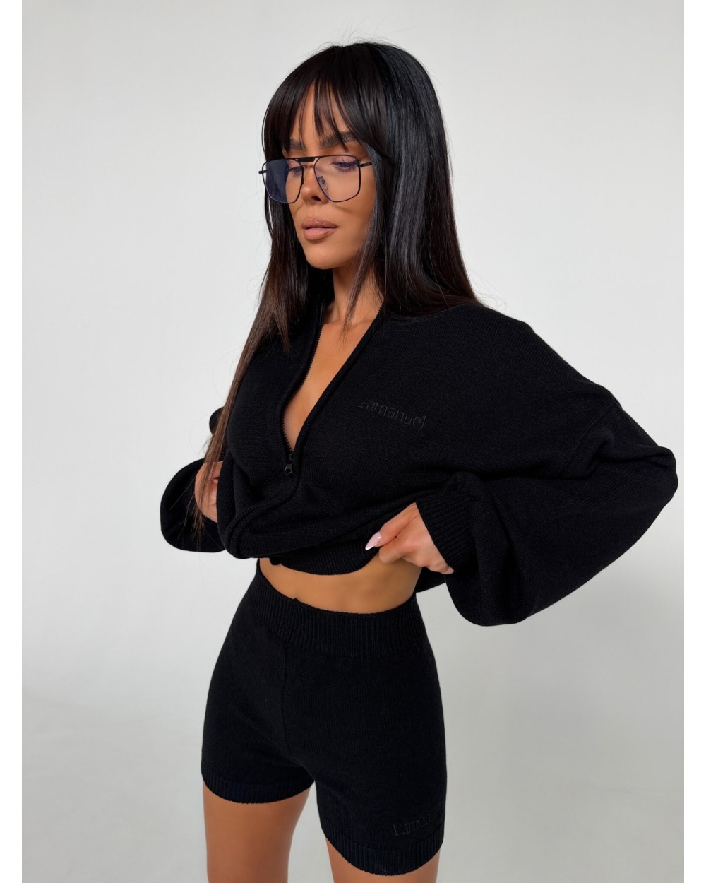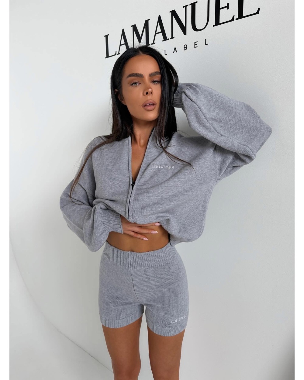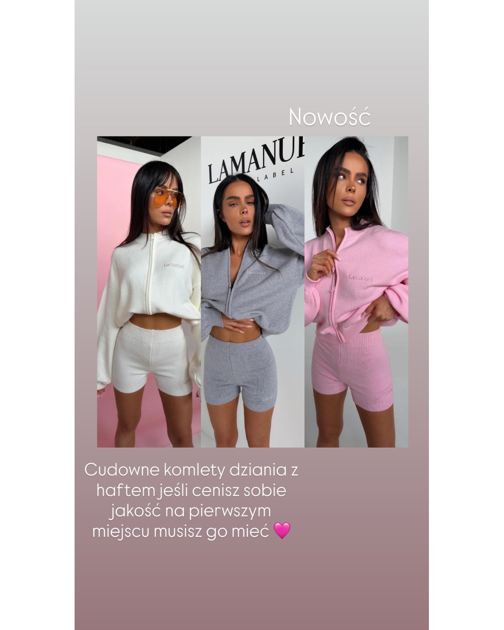 Komplet sweterkowy o miękkiej, przyjemnej w dotyku strukturze. Krótka bluza zapinana na zamek z lekko podniesioną stójką i luźnym rękawem tworzy wyważoną, nowoczesną formę. Dopasowane szorty z wysokim stanem dobrze układają się na sylwetce i podkreślają talię. Całość tworzy spójny, wygodny look z subtelnym brandingiem.